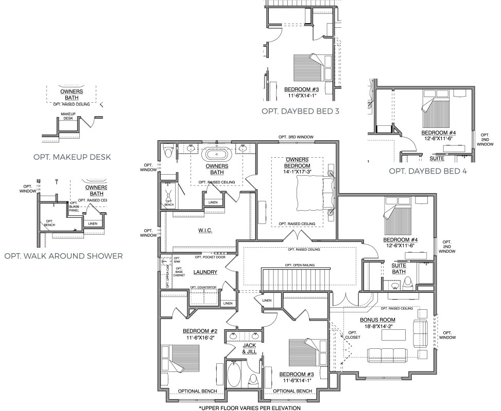 - Owners Bath features optional vaulted ceiling, makeup counter and walk-around shower in addition to free-standing tub