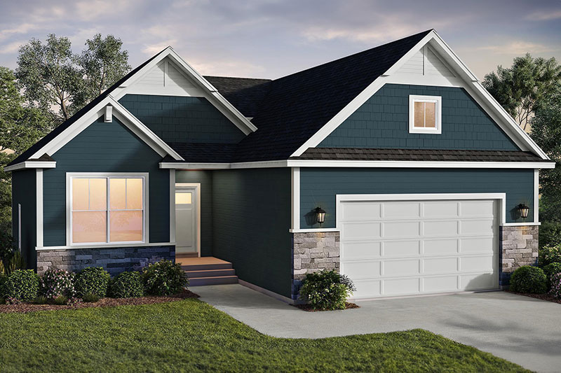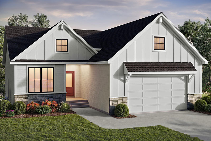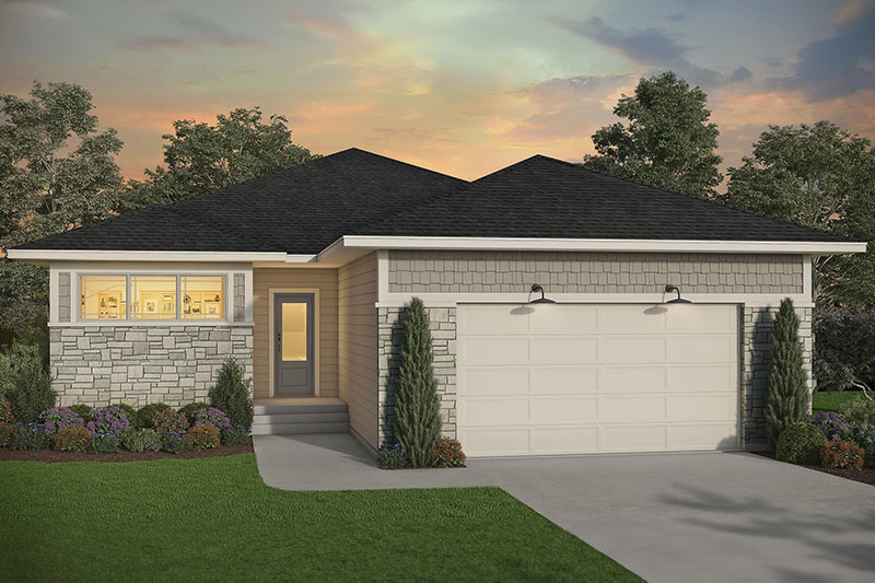 - Corner Great Room rambler plan with abundant windows for natural light and optional raised ceiling and transom windows flanking the center fireplace