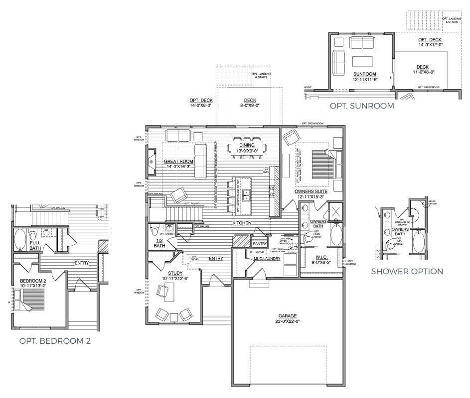 - Optional rear 3-sided Sunroom situated beyond Dining with sliding glass door deck access