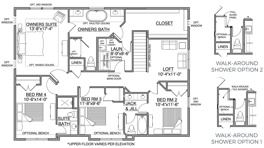 - Owners Bath offers optional vaulted ceiling and walk-around shower access in addition to free-standing tub