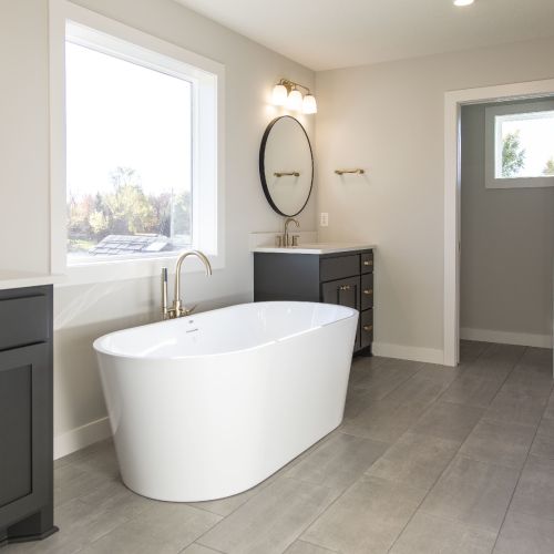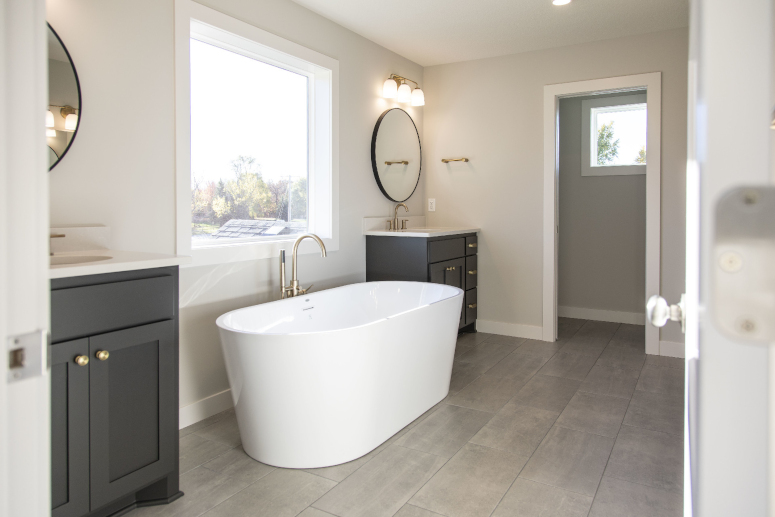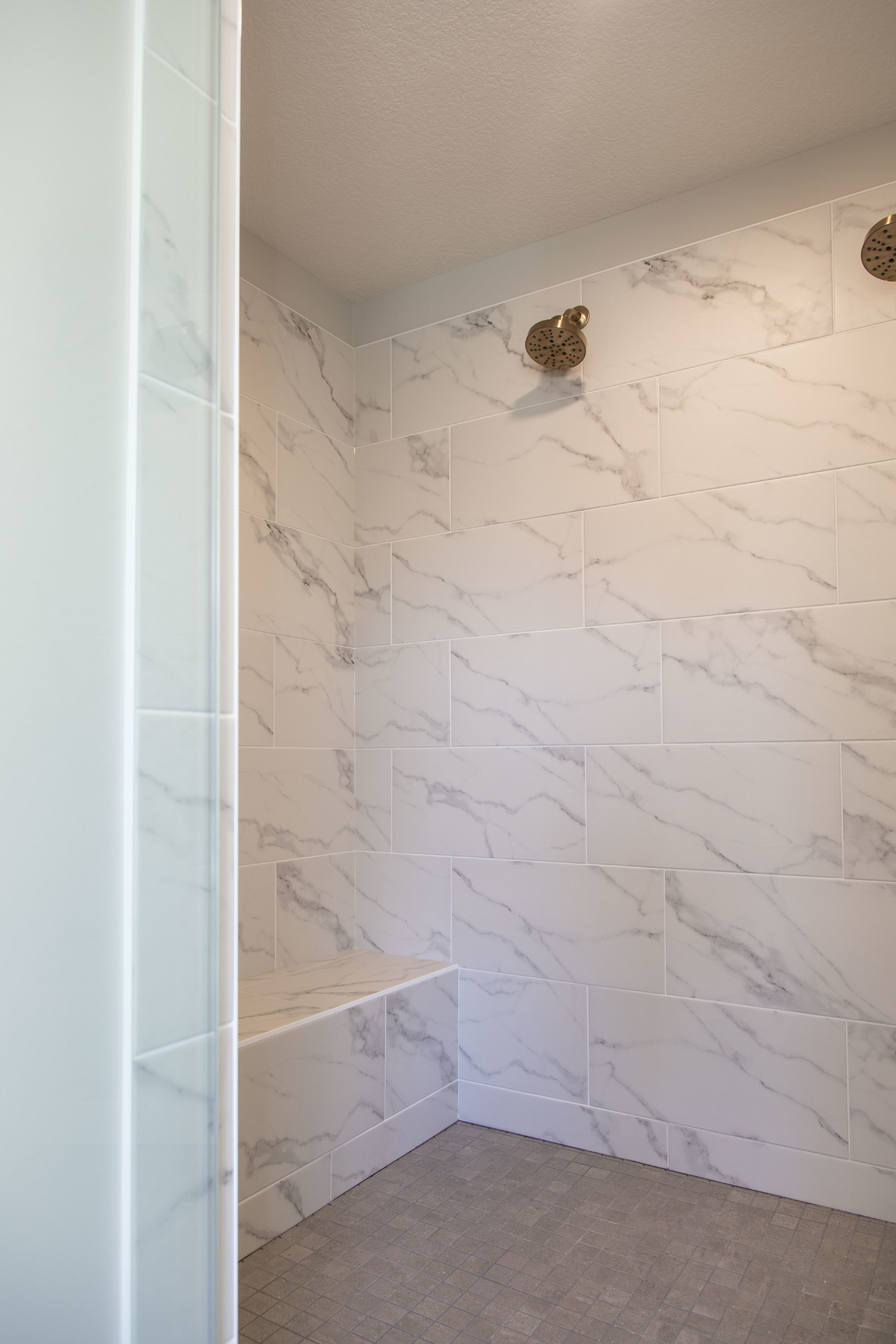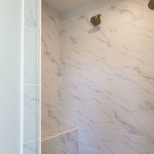 - Owner’s Bath offers a freestanding soaking tub, an expansive walk-in spa shower with dual shower heads, a recessed shampoo shelf, a built-in bench, and a spacious walk-in closet.