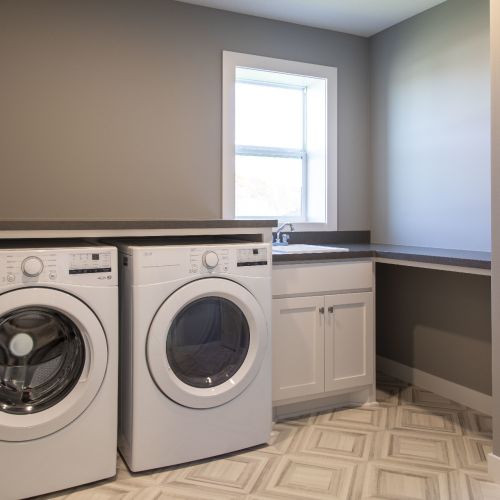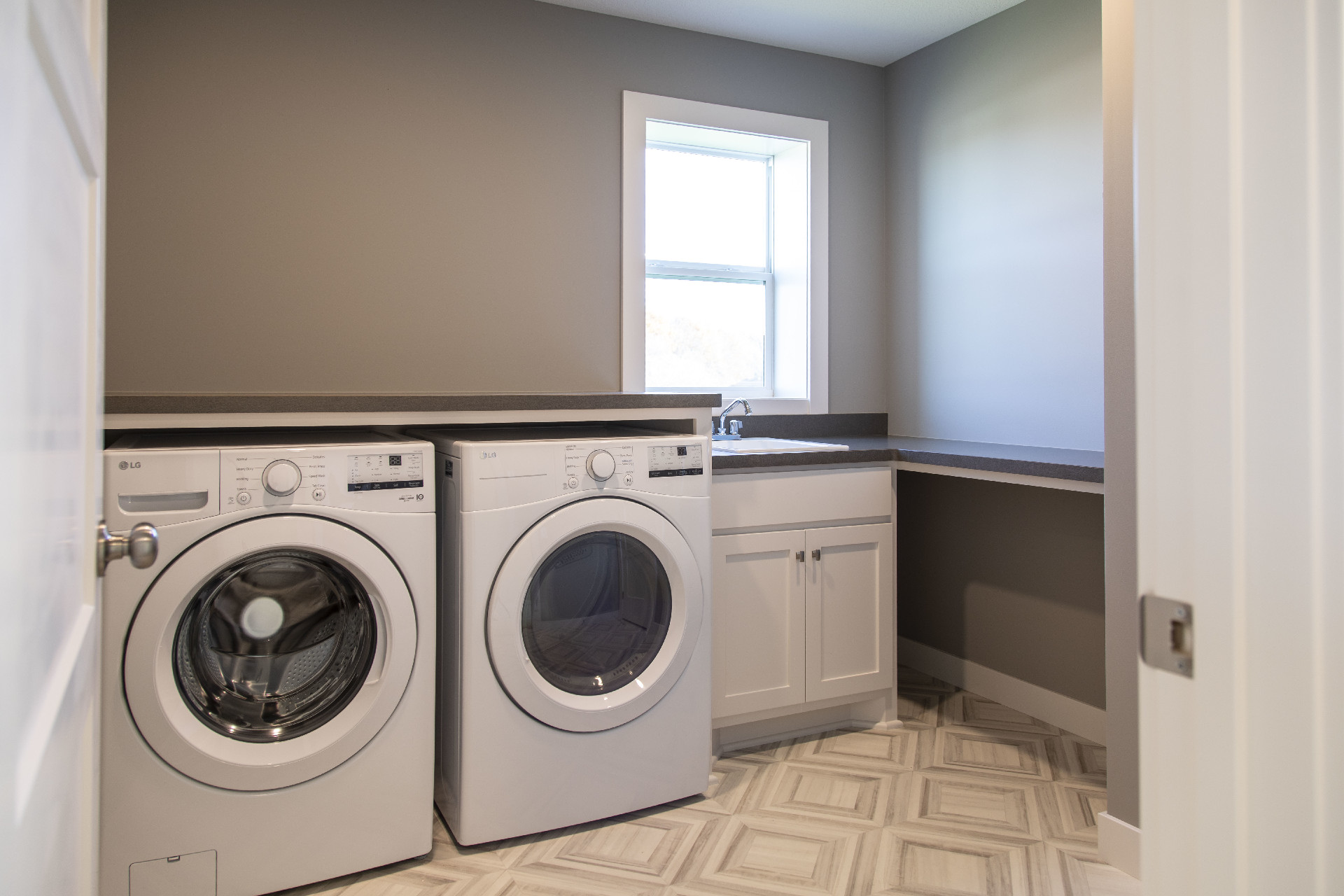 - Laundry Room includes a linen closet, an exterior window for natural light, and an optional laminate countertop above the appliances for added convenience.