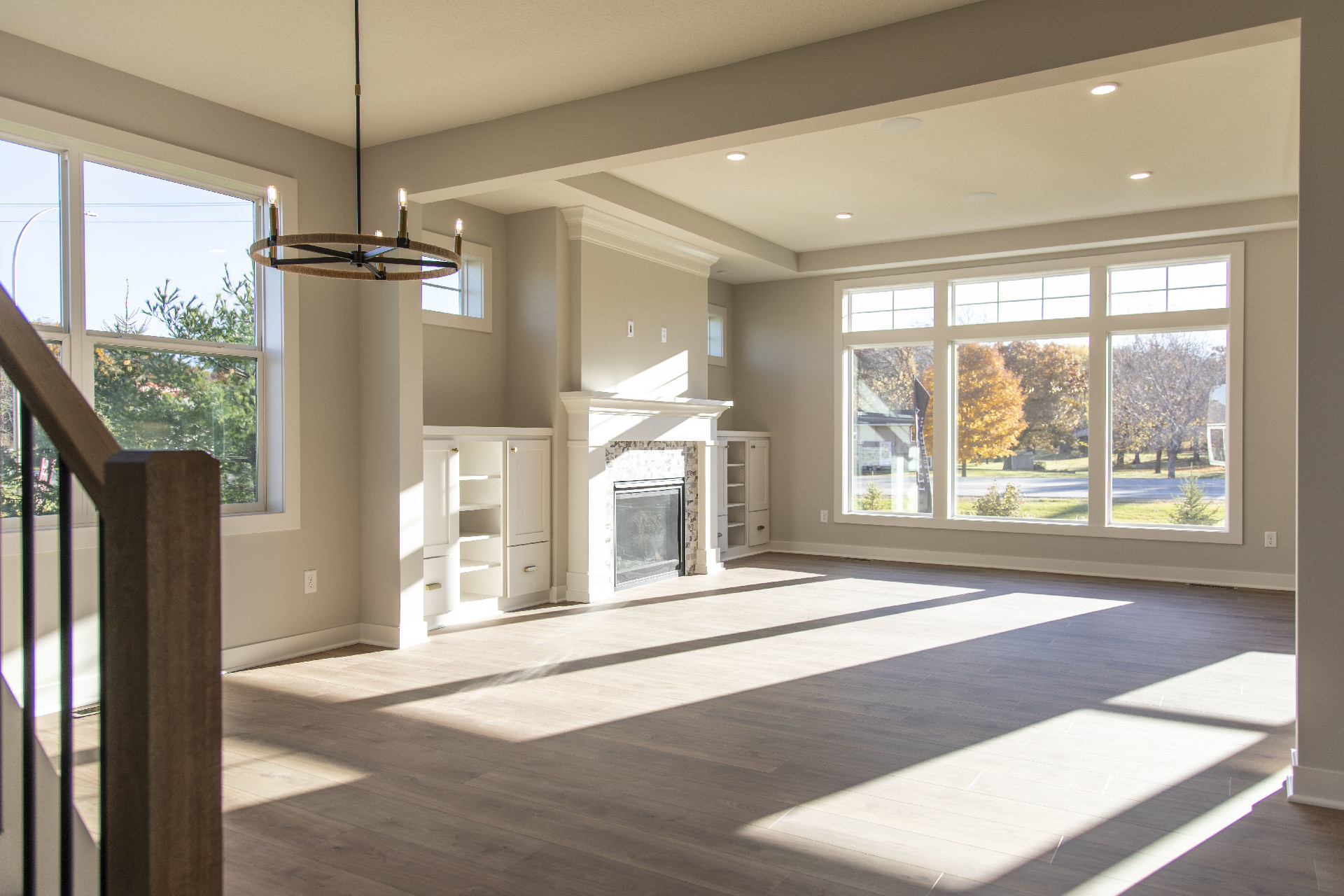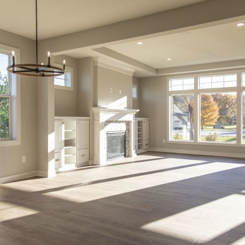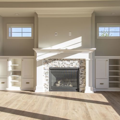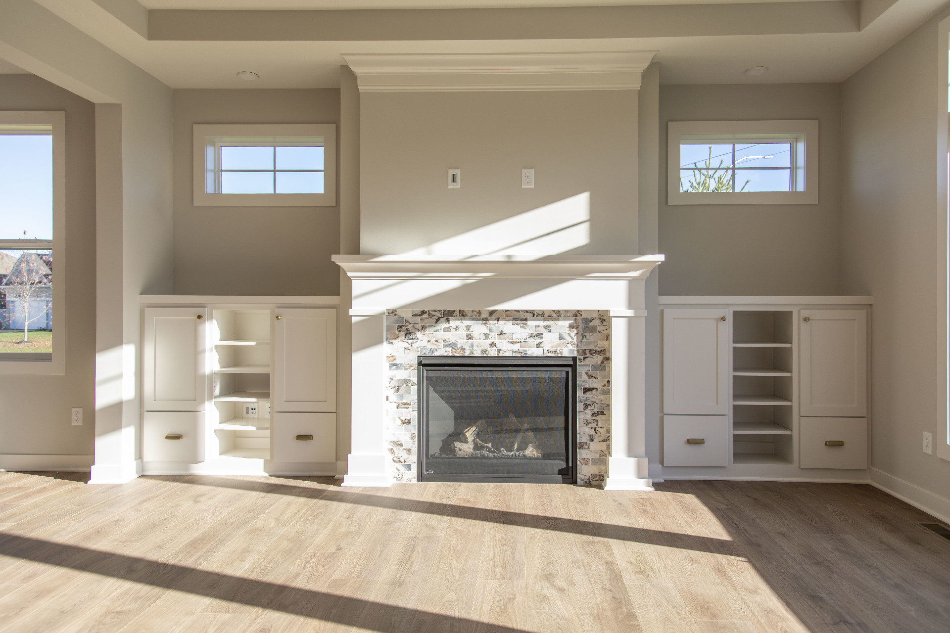 - Great Room showcases a stone to mantel fireplace, complemented by wood shelving and base cabinets for extra storage.
