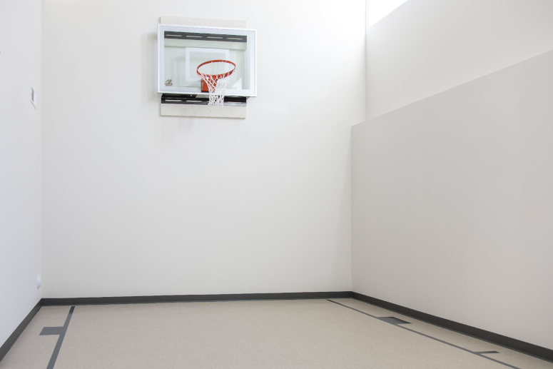 - Indoor 2-Story Sport Center featuring durable VCT flooring, a basketball hoop, and painted game lines, complete with dedicated ball storage closet.