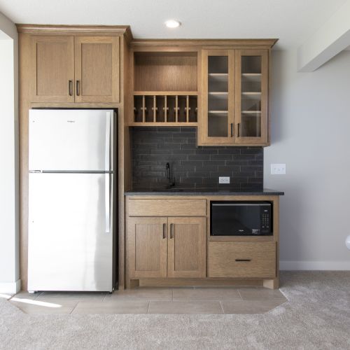 - Kitchen has a spacious 8' kitchen island, features custom-built cabinetry, a granite composite single-bowl sink, and an optional tiled backsplash extending from countertop to ceiling around rear window.