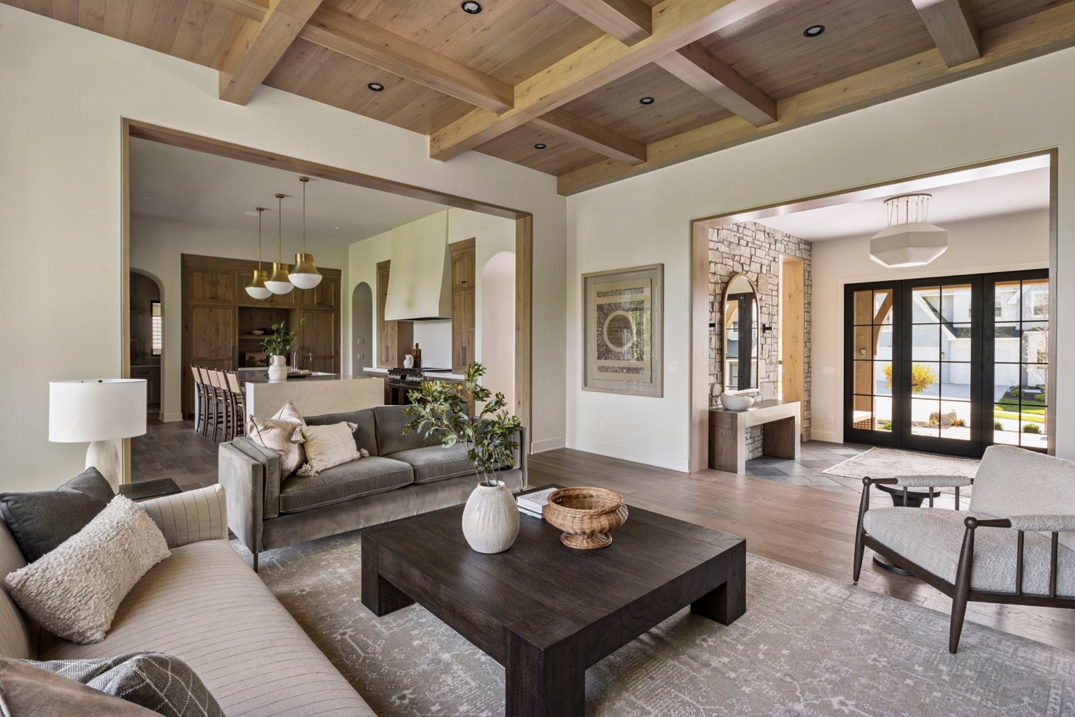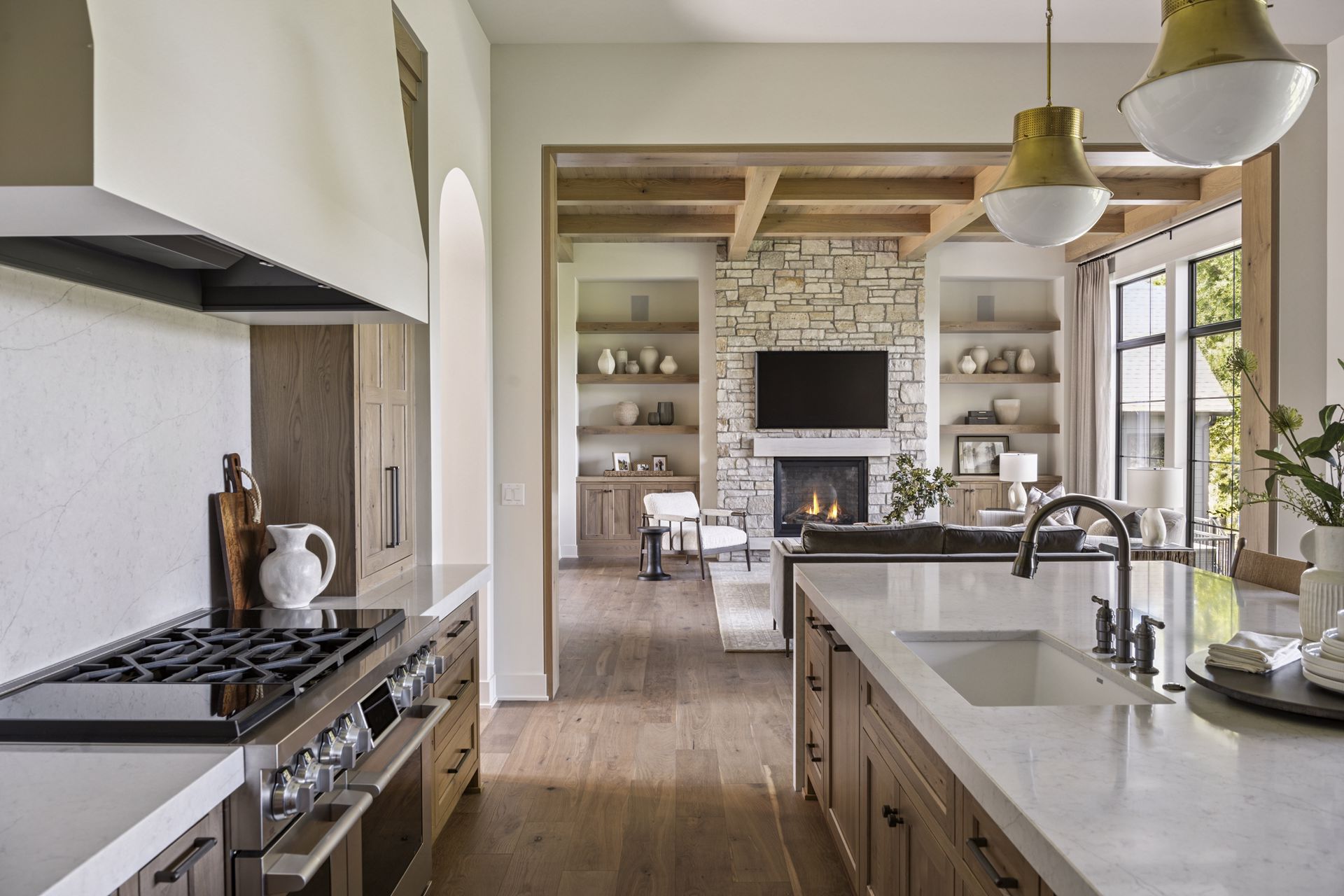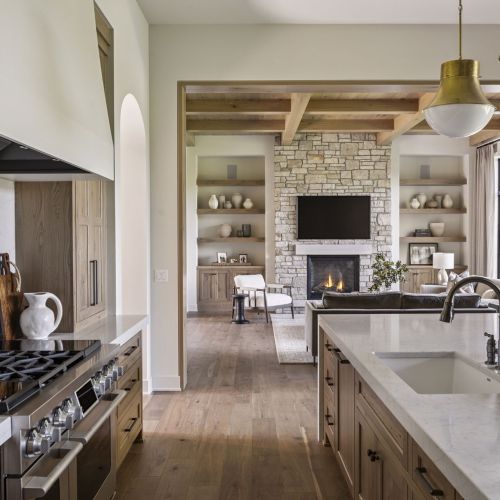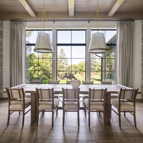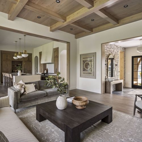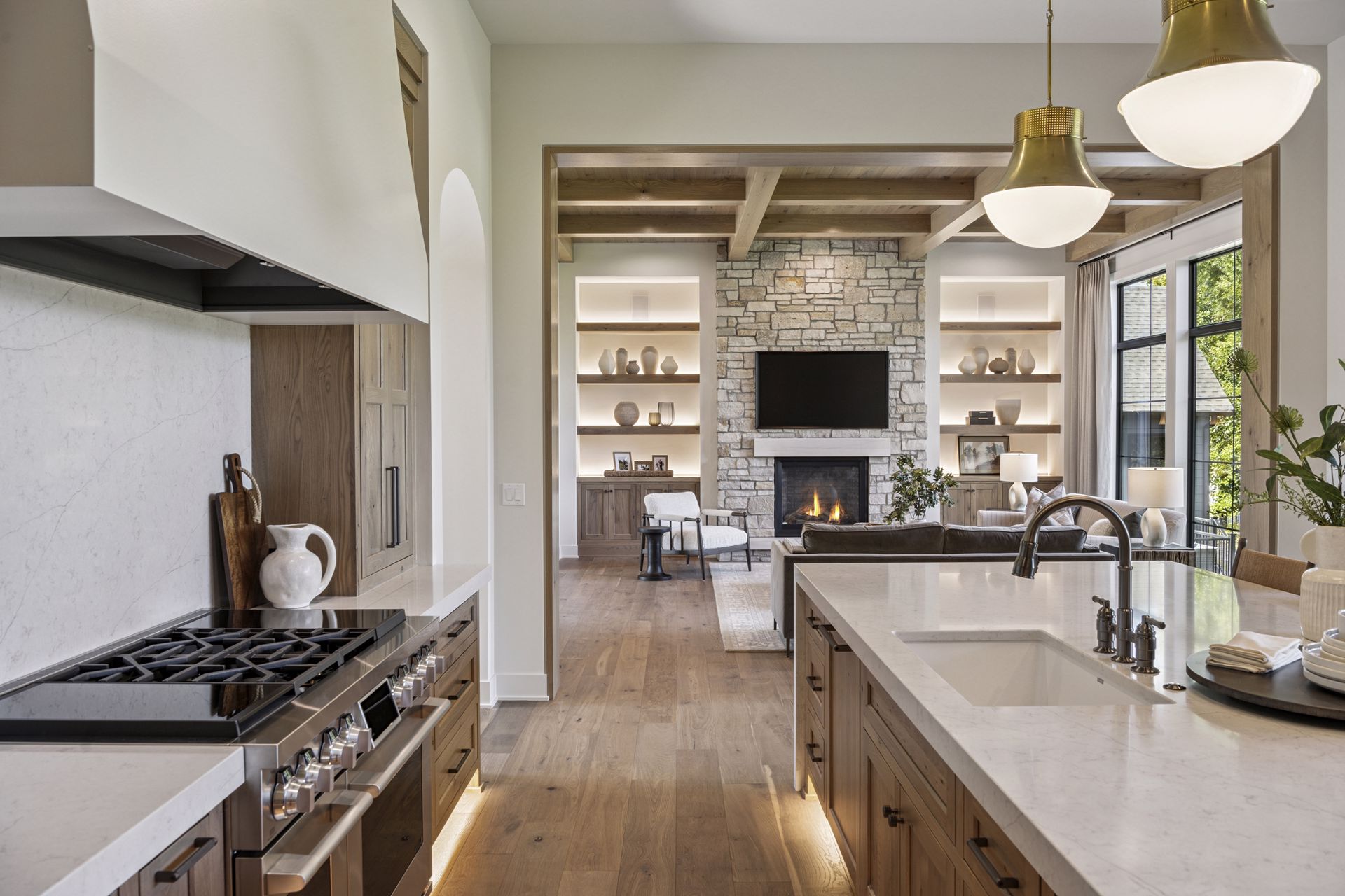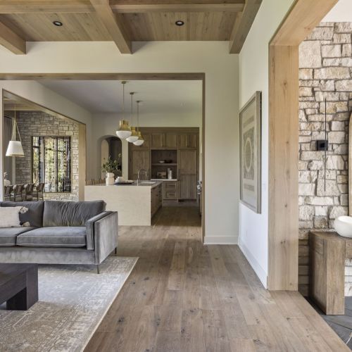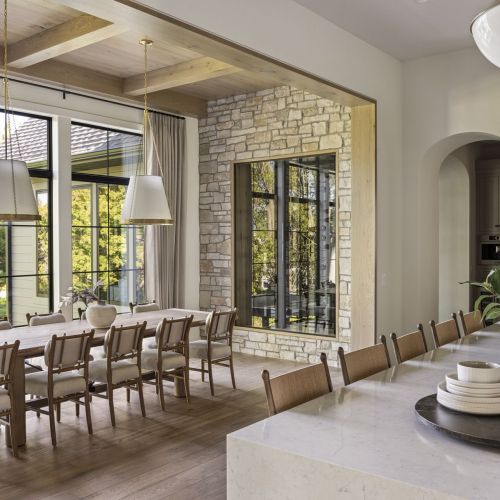 - Central Kitchen overlooks Great Room and Dining Room with the warmth of wood ceilings & beams, and rear views through windows over the Dining Room from the spacious Kitchen island