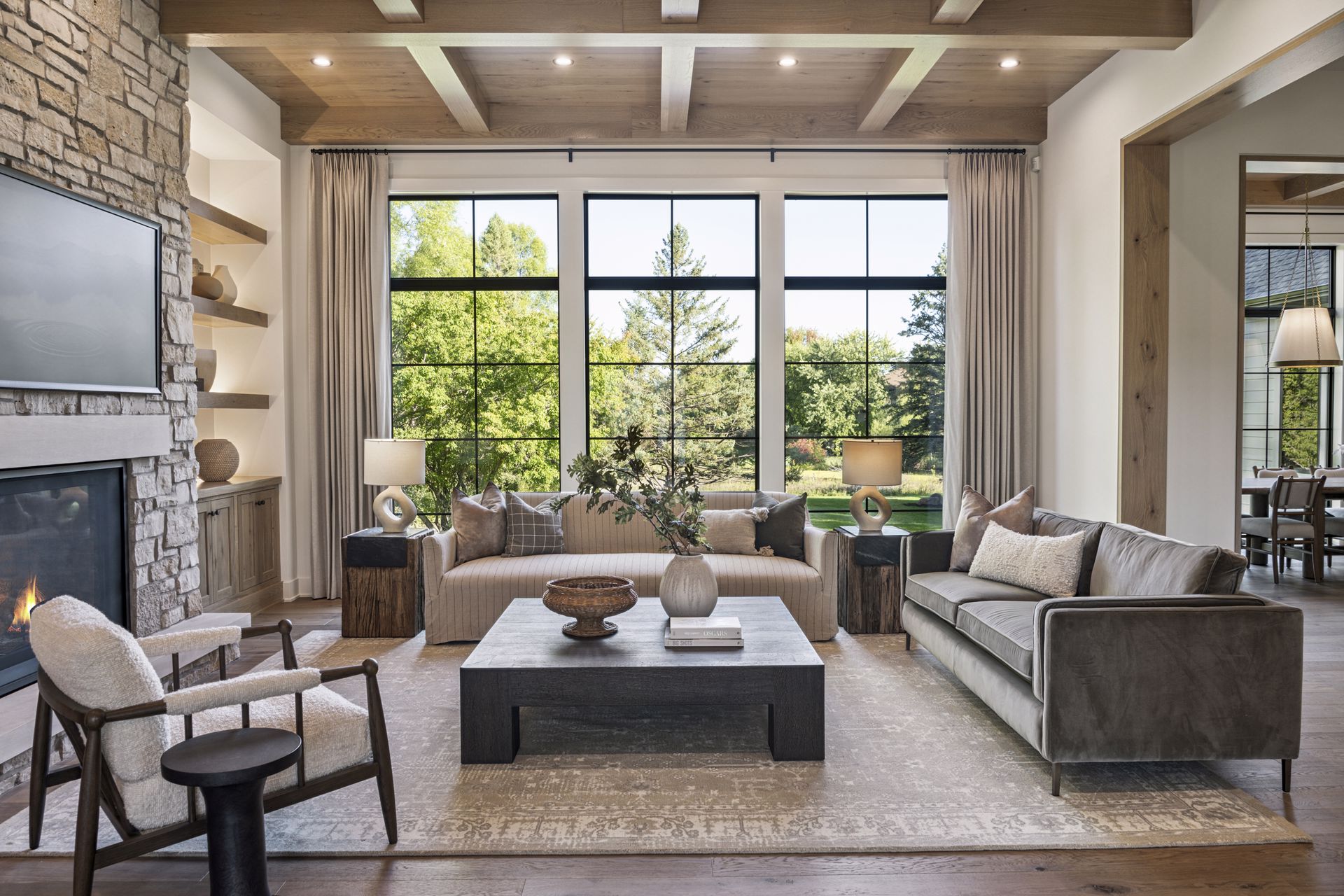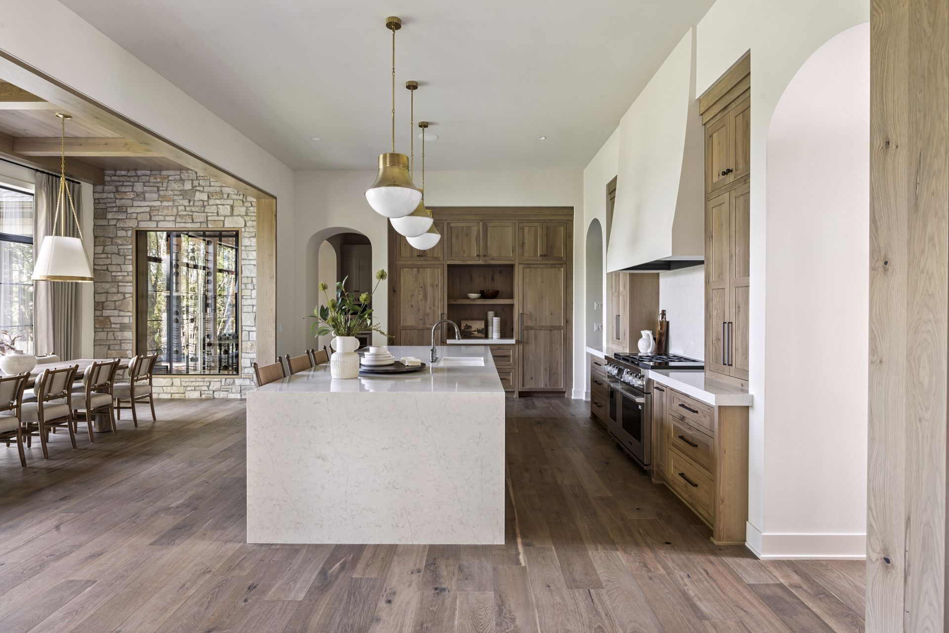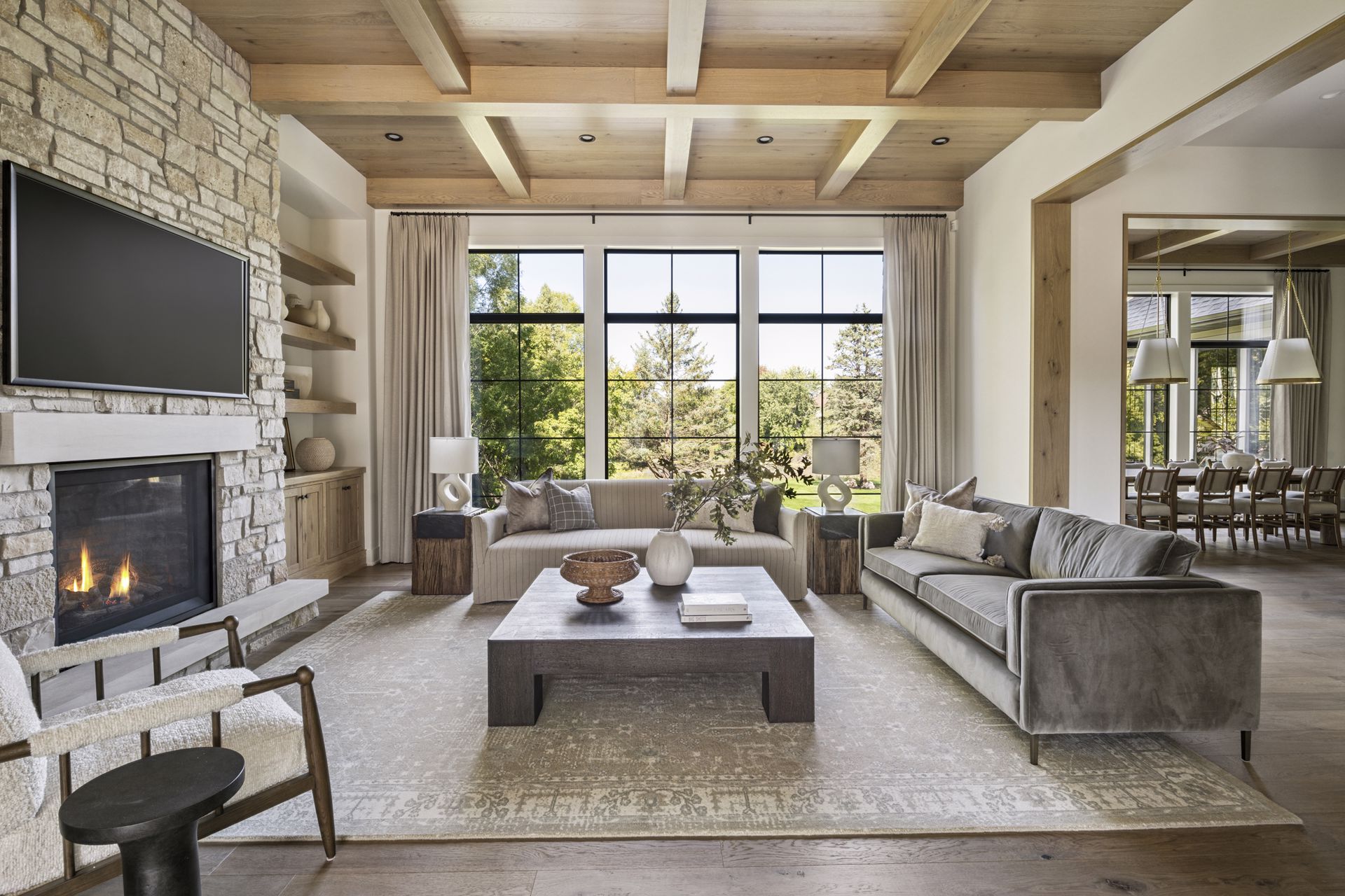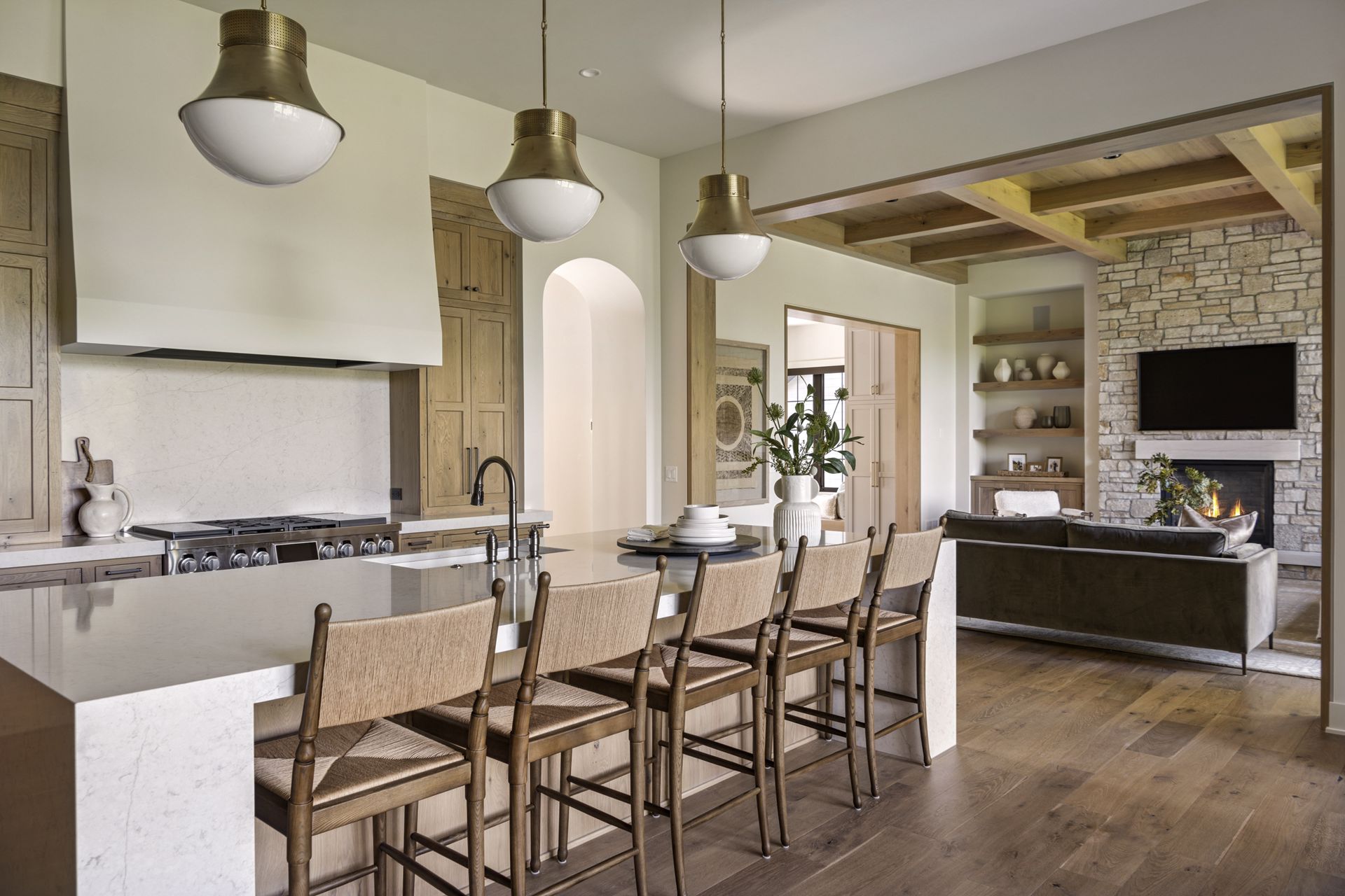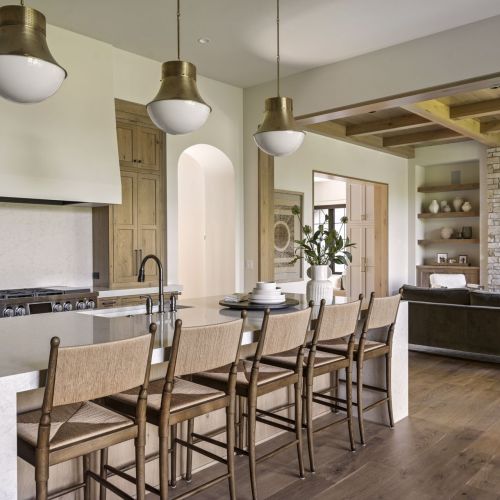 - Central Kitchen overlooks Great Room and Dining Room with the warmth of wood ceilings & beams, and rear views through windows over the Dining Room from the spacious Kitchen island