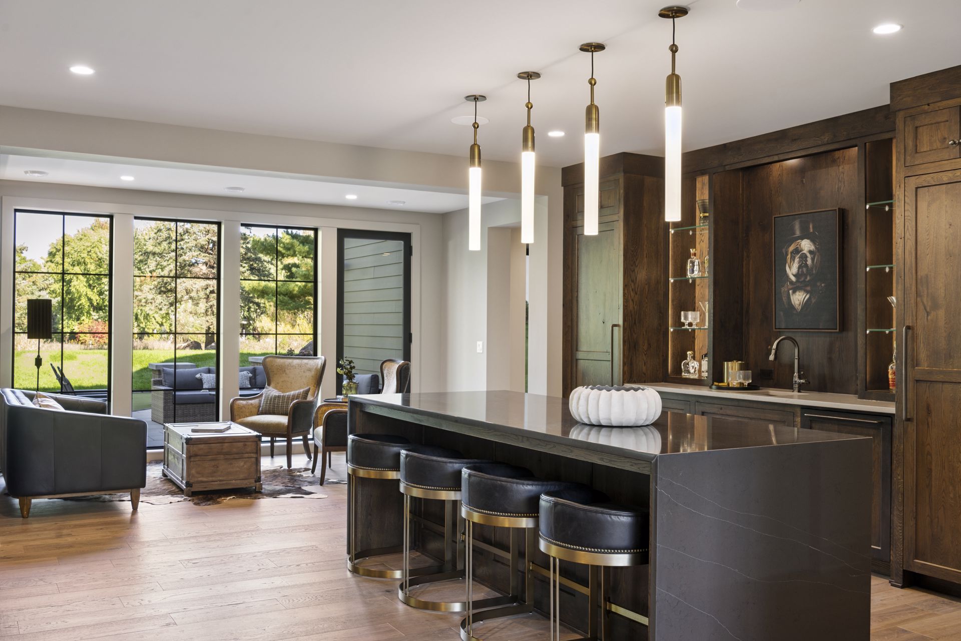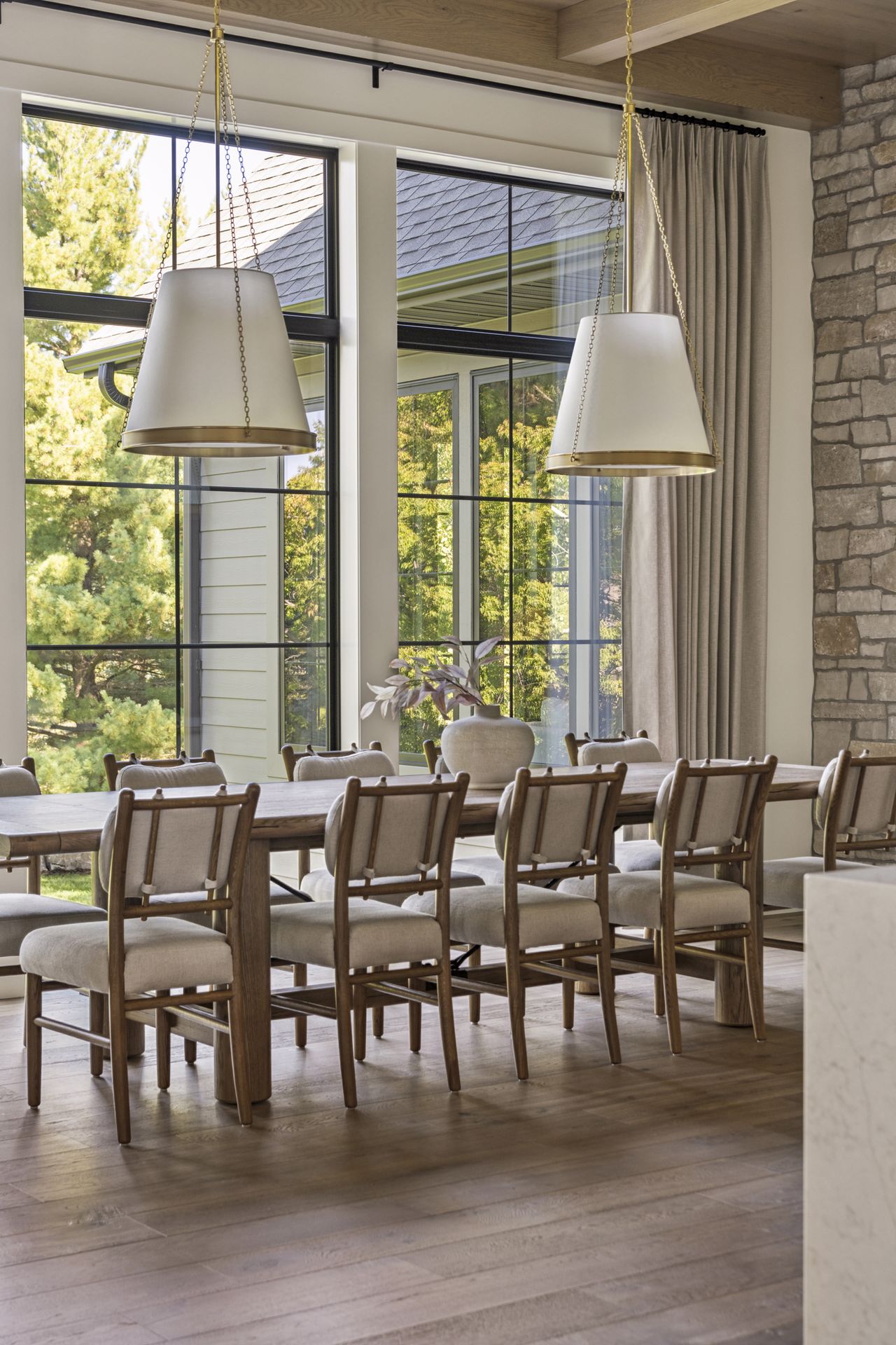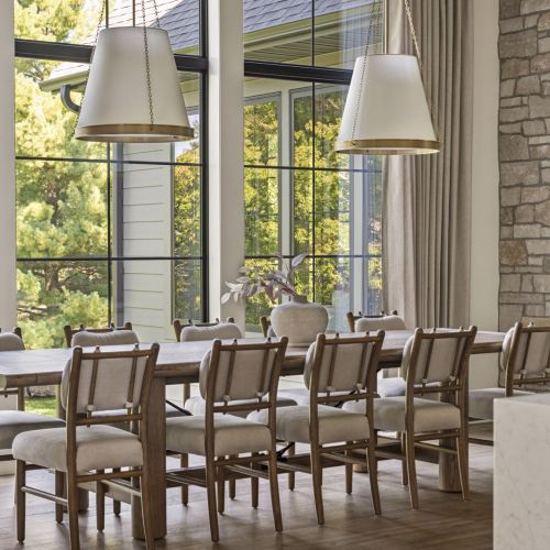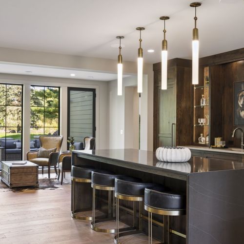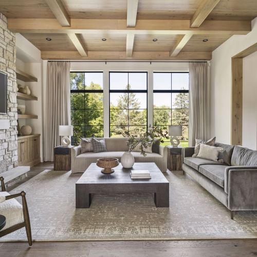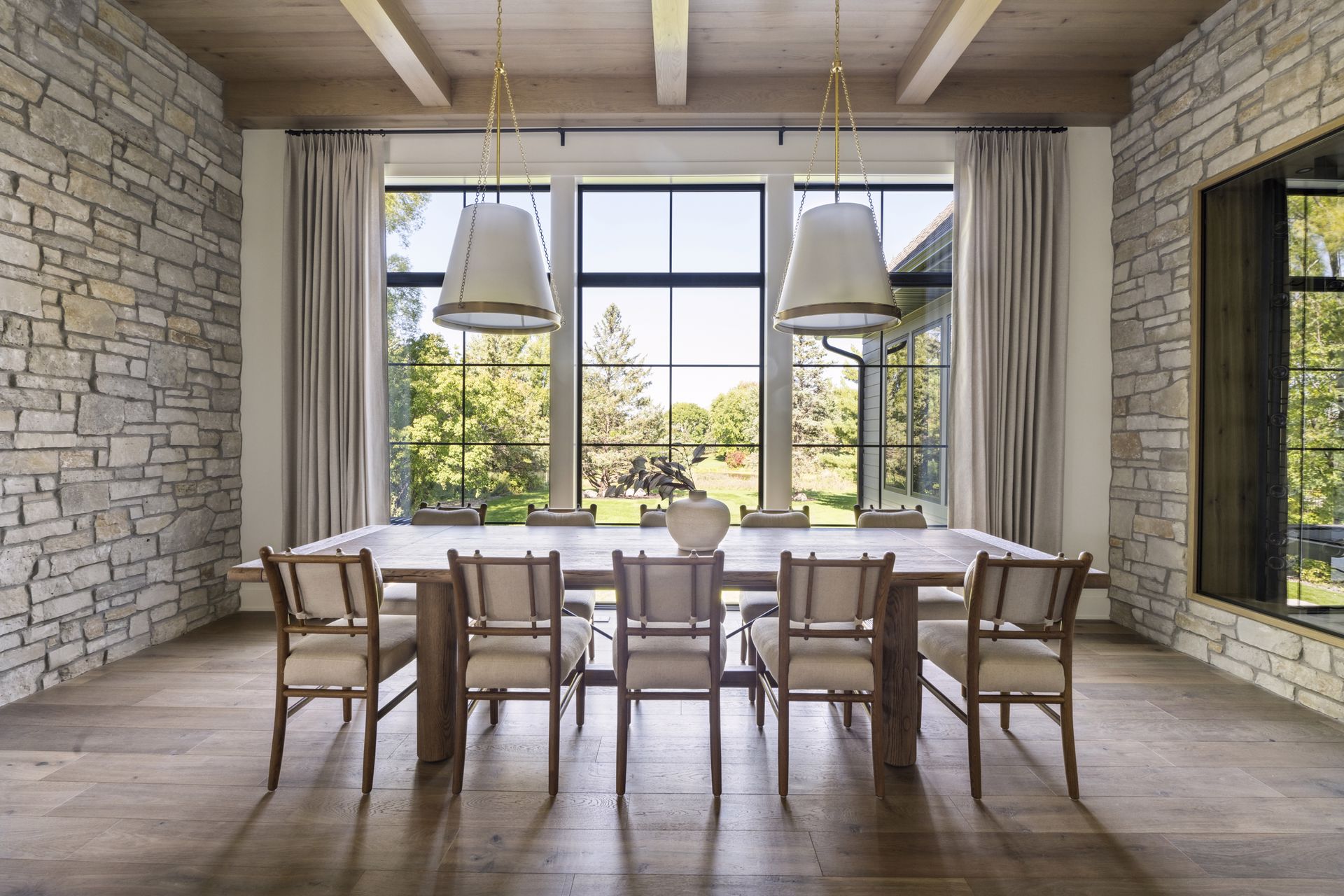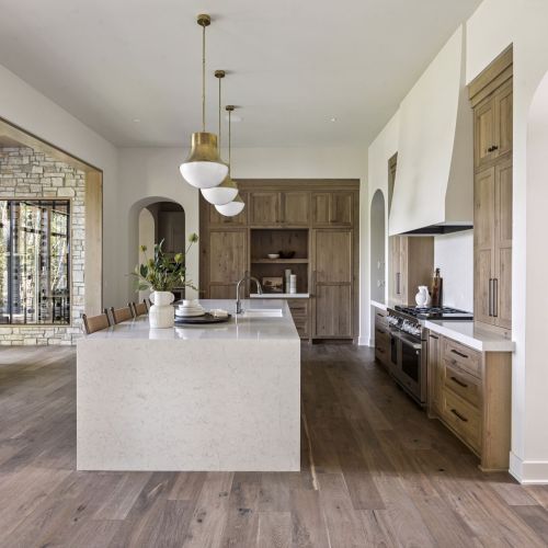 - Central Kitchen overlooks Great Room and Dining Room with the warmth of wood ceilings & beams, and rear views through windows over the Dining Room from the spacious Kitchen island