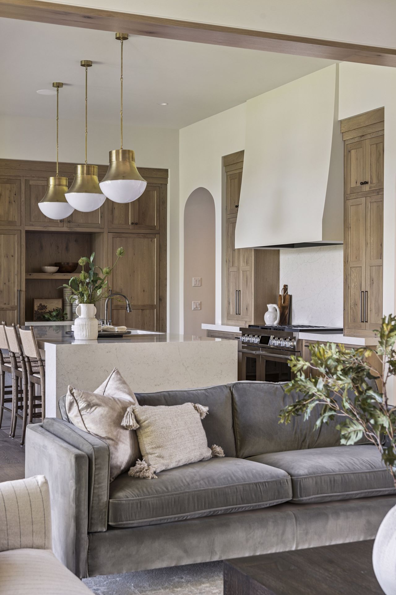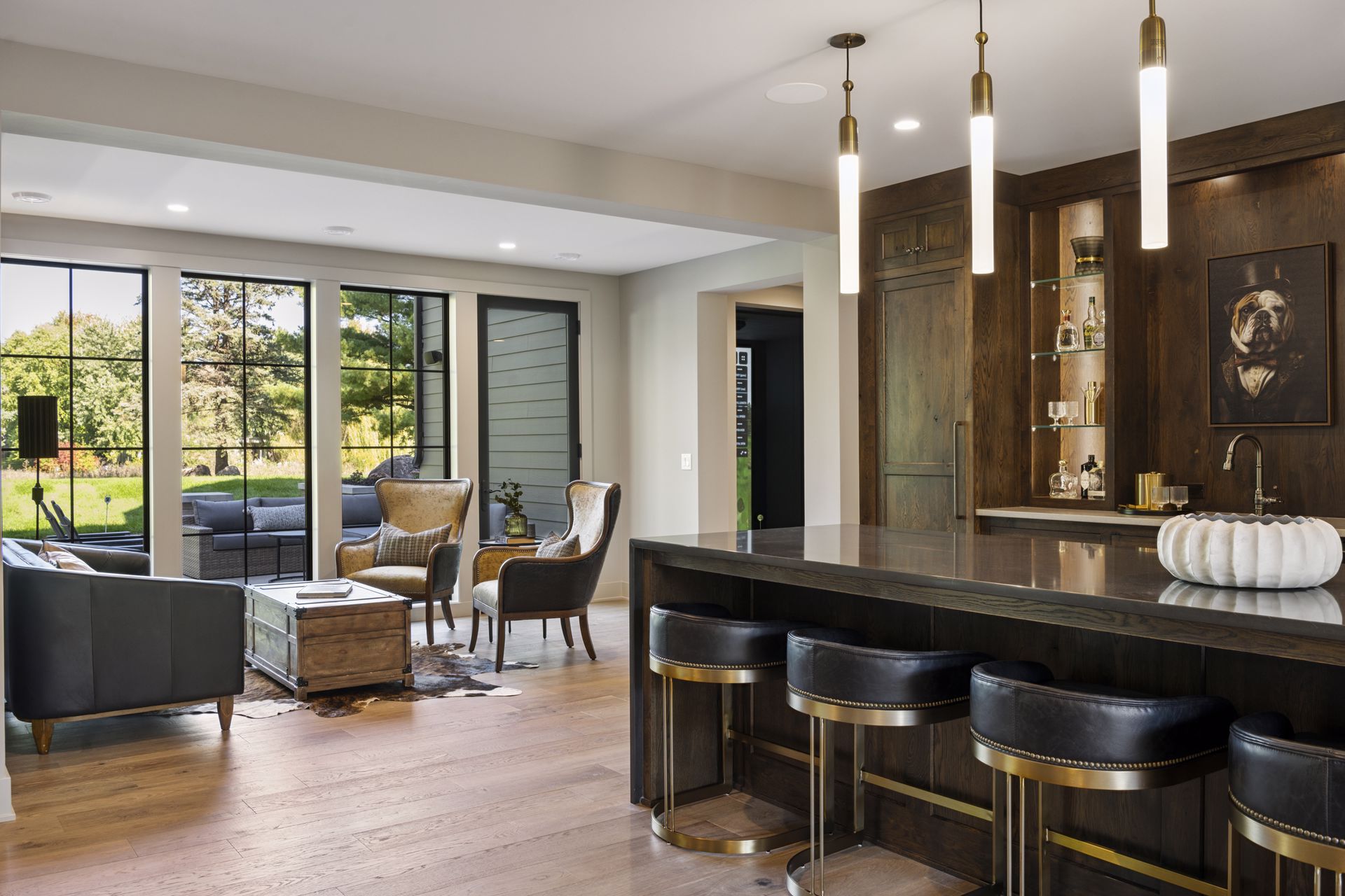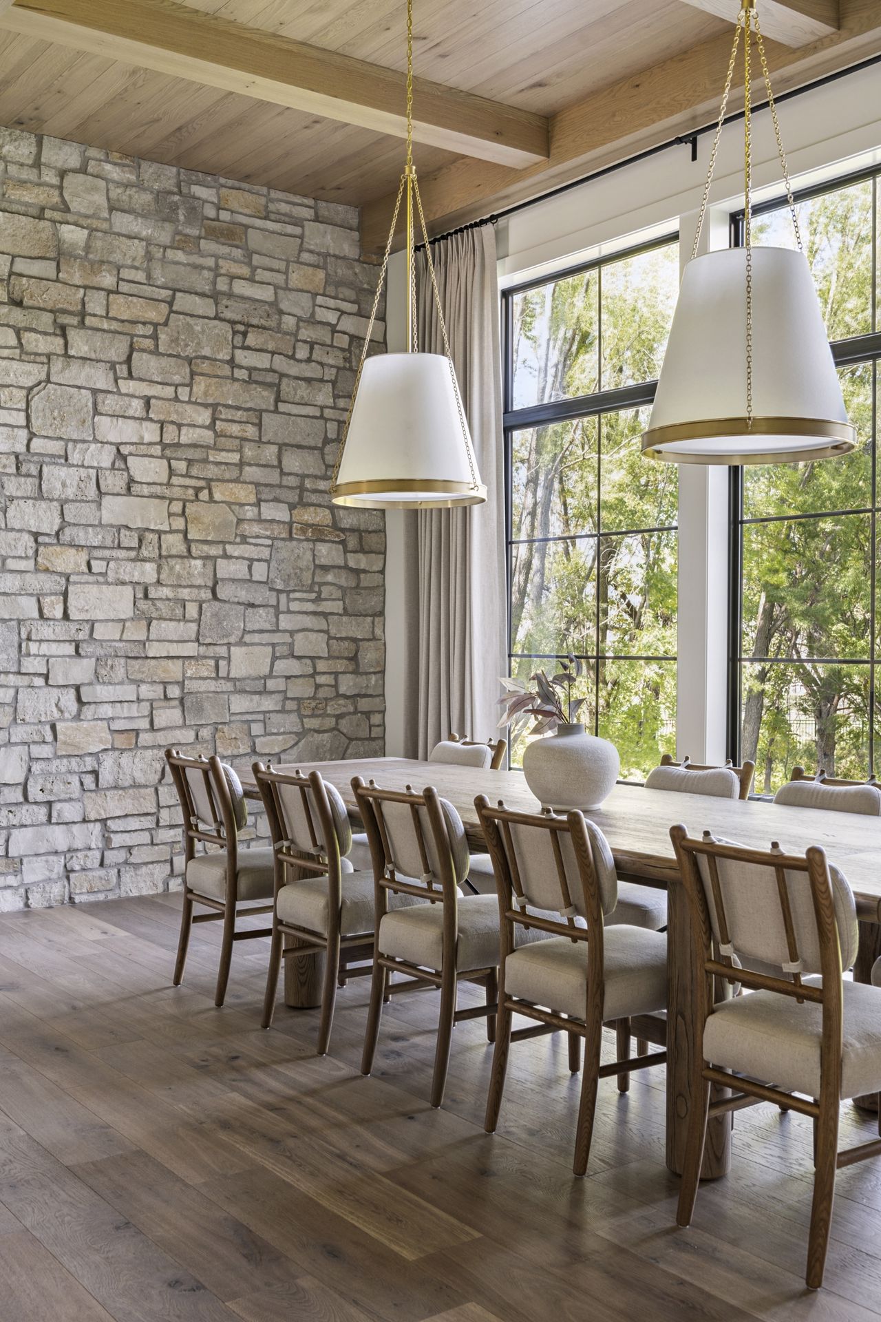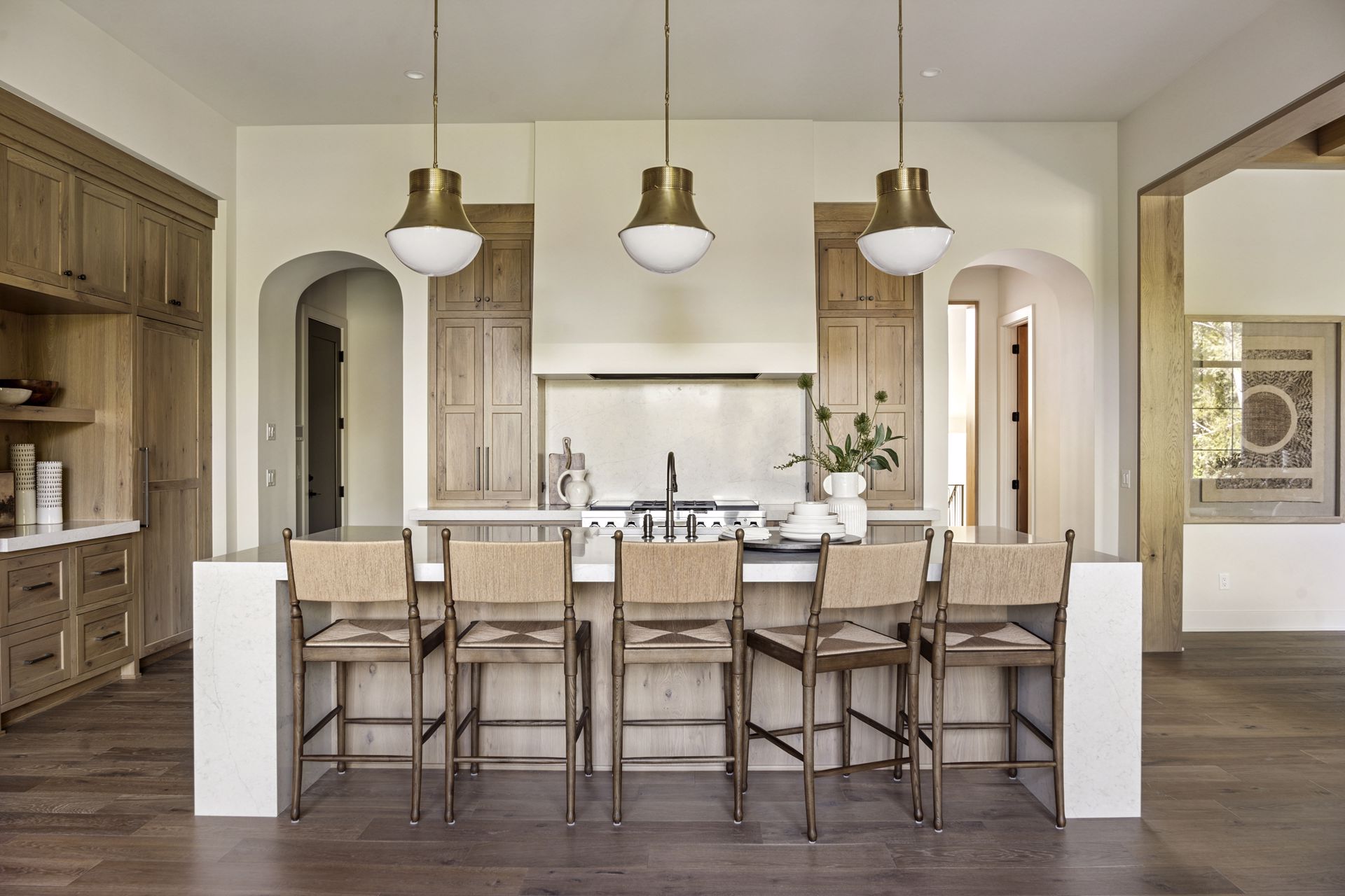- Central Kitchen overlooks Great Room and Dining Room with the warmth of wood ceilings & beams, and rear views through windows over the Dining Room from the spacious Kitchen island