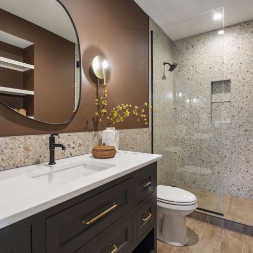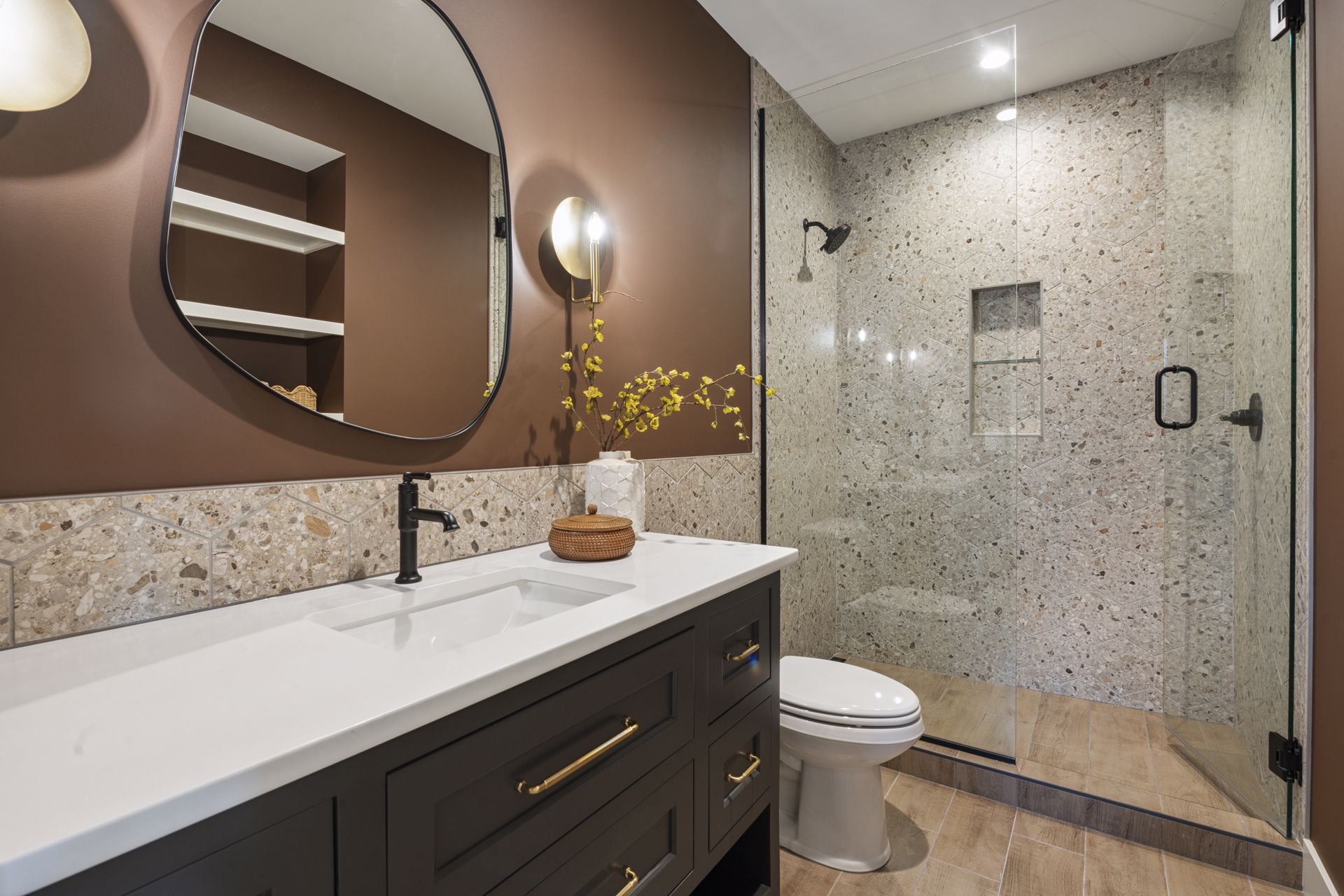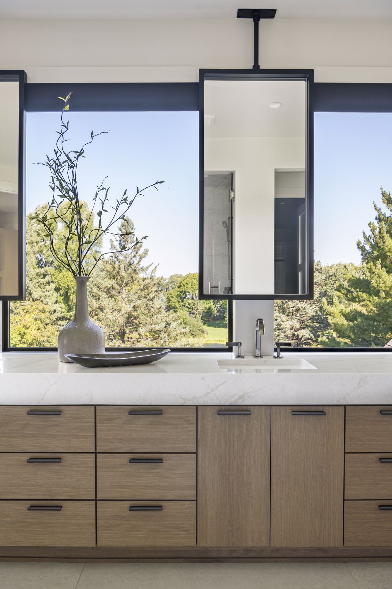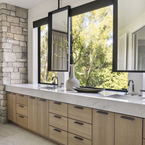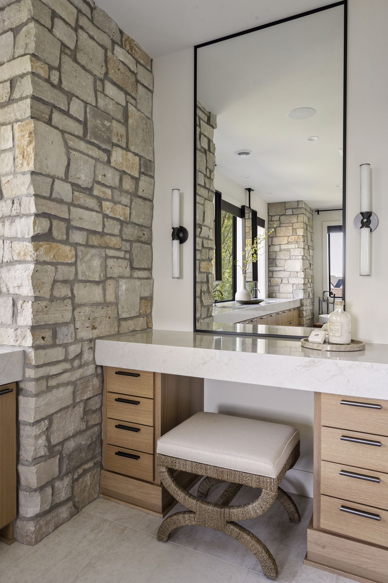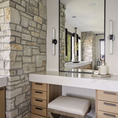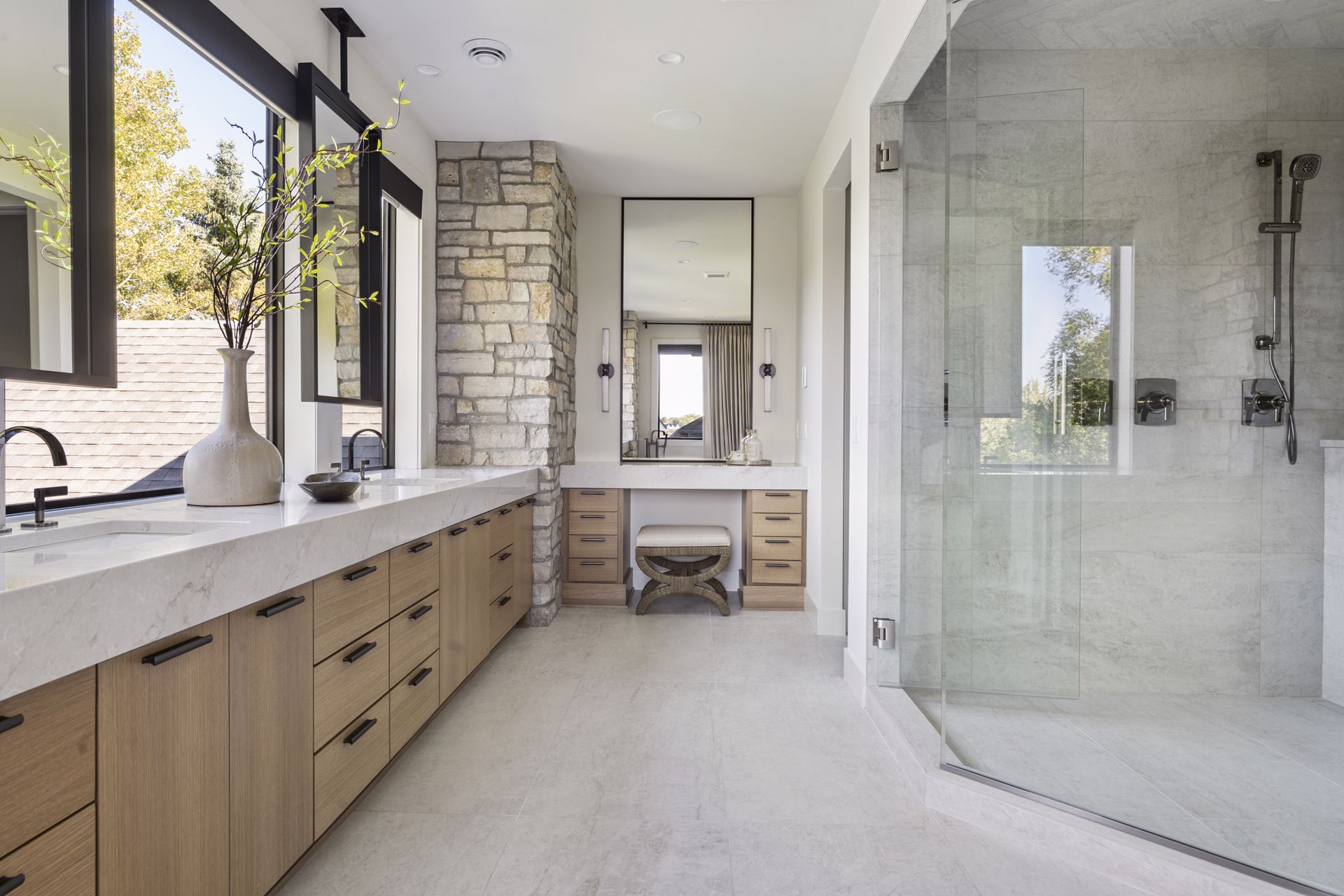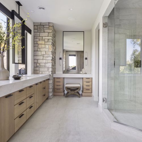 - Owners Bath features natural stone accent wall flanking dual vanities with ample storage, custom mirrors hung over windows overlooking the backyard, glass two-person shower in addition to free-standing tub and spacious Owners Closet with custom shelving & island