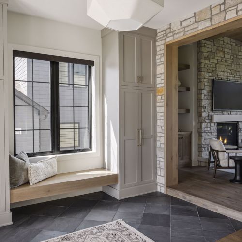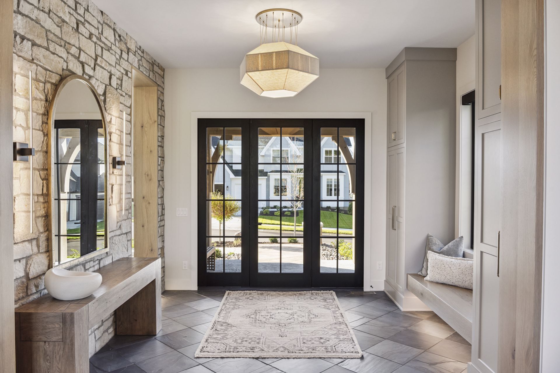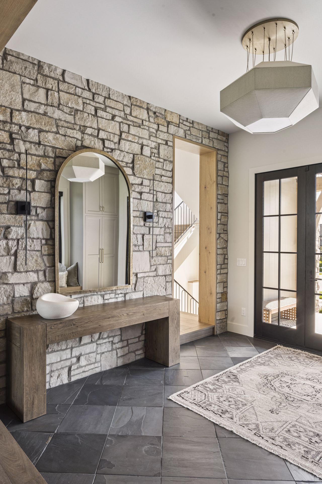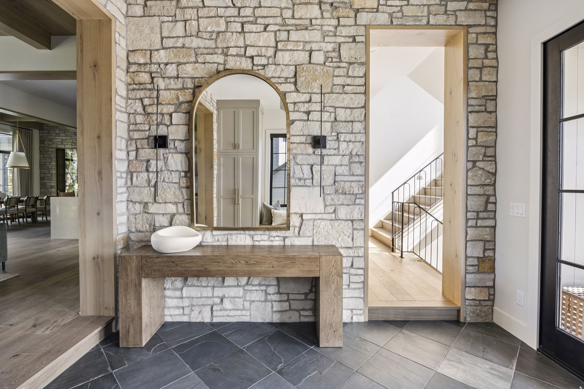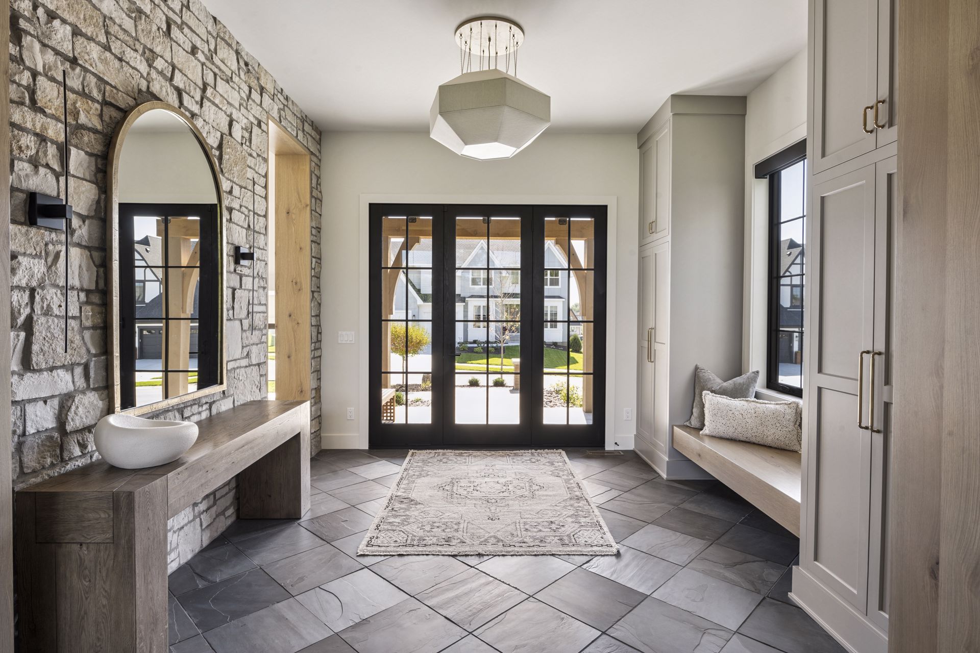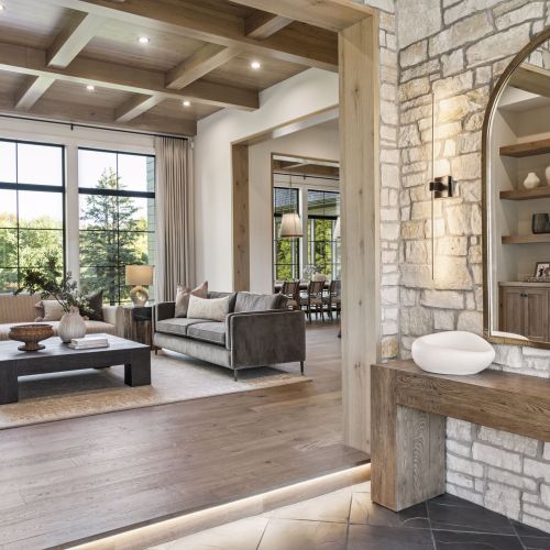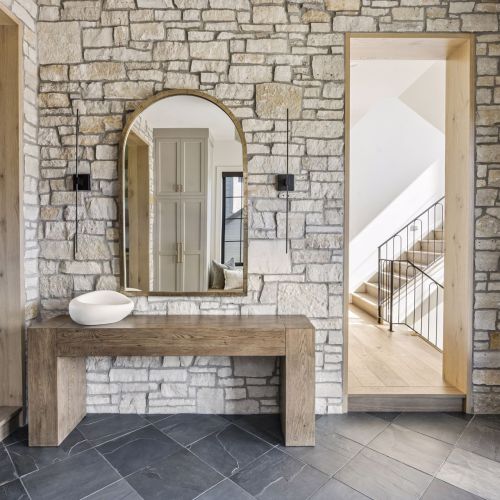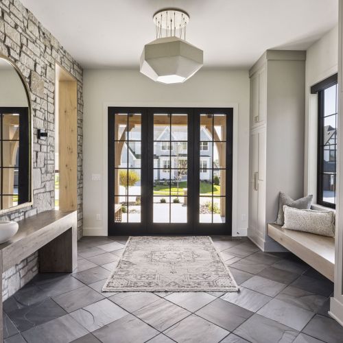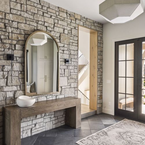 - Guests are greeted with a large Entry featuring natural stone accent walls, custom built-in cabinetry and front facing grand staircase with windows galore and a 3-story overlook in front of the glass.