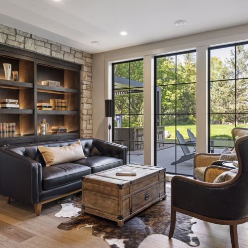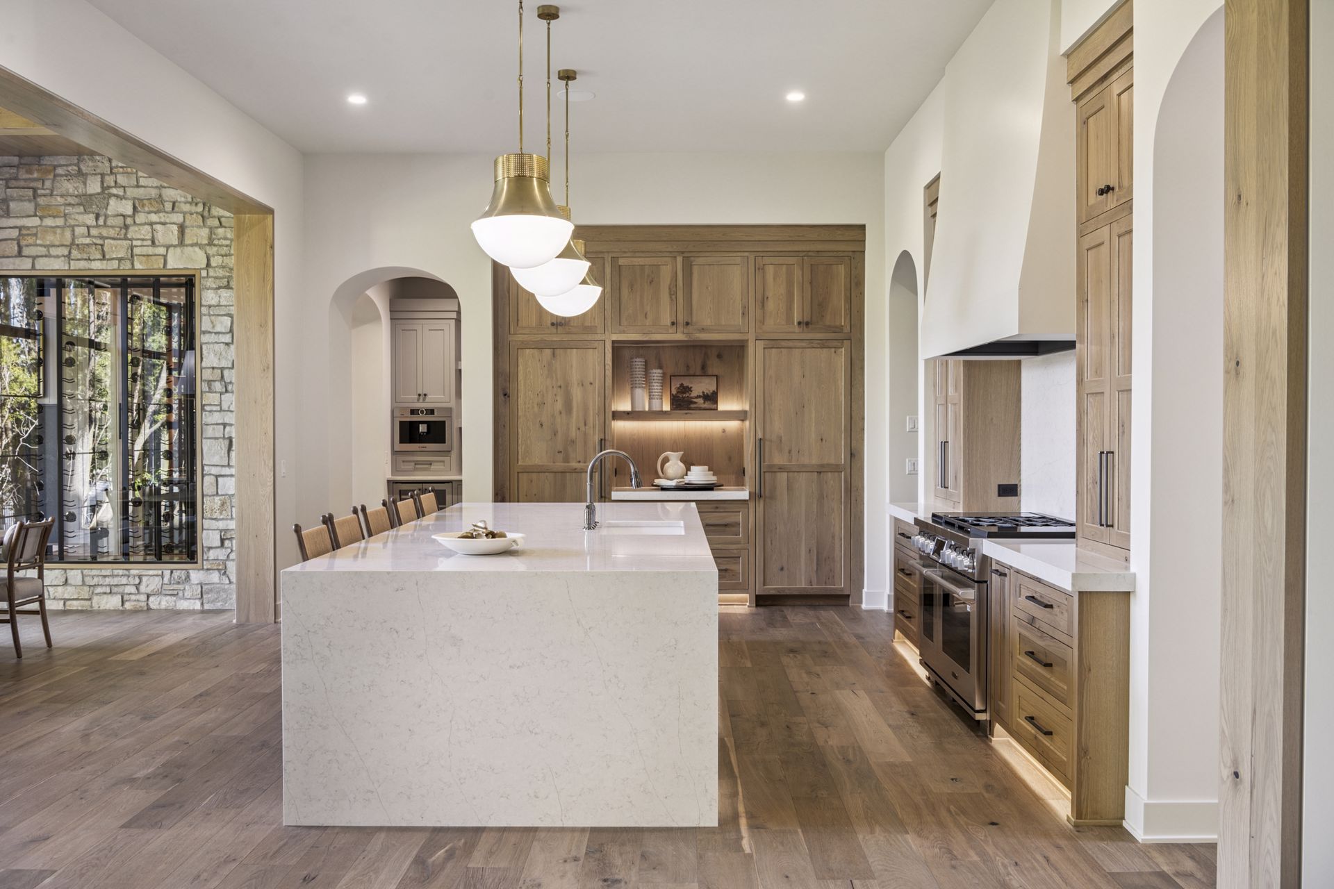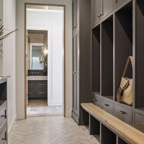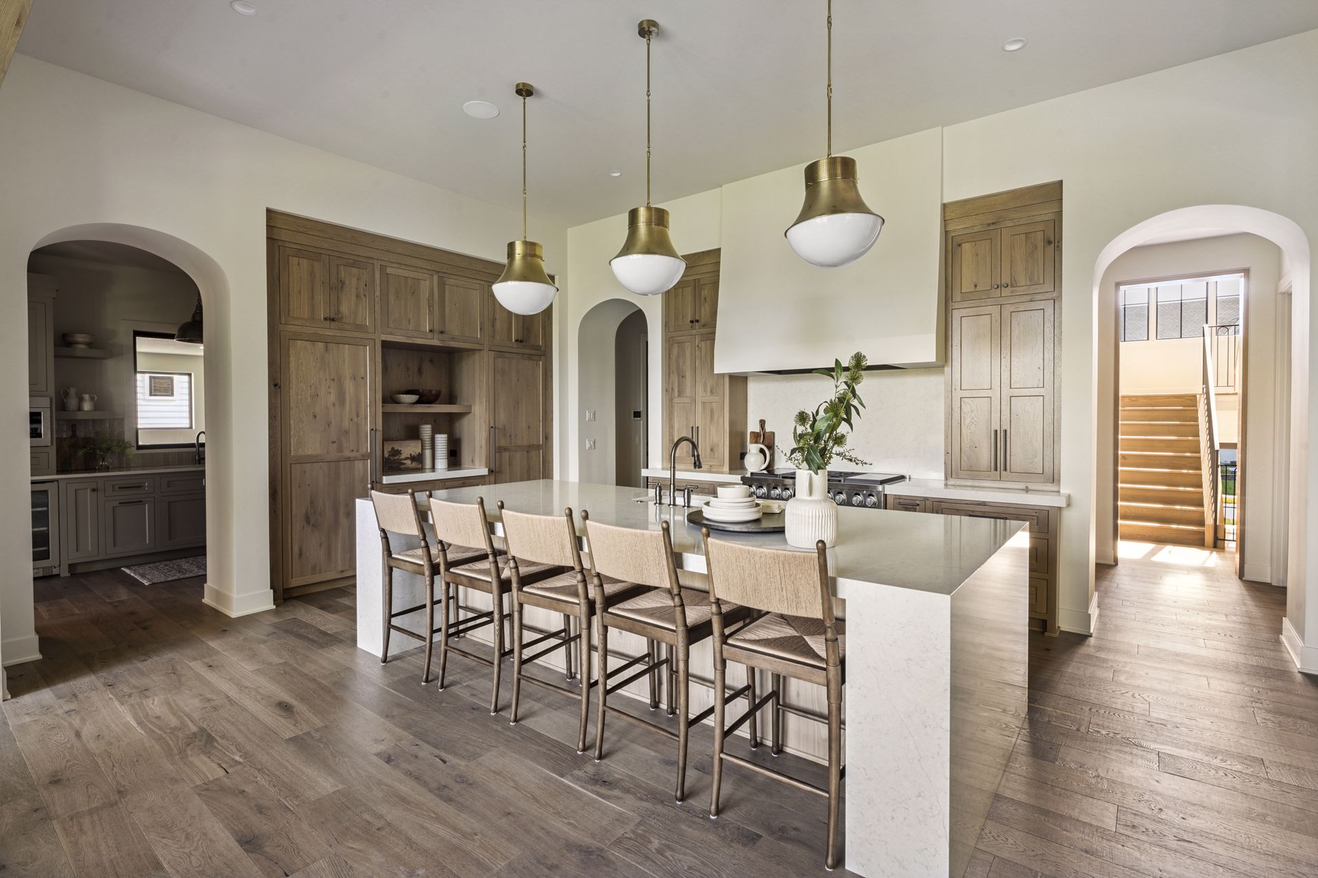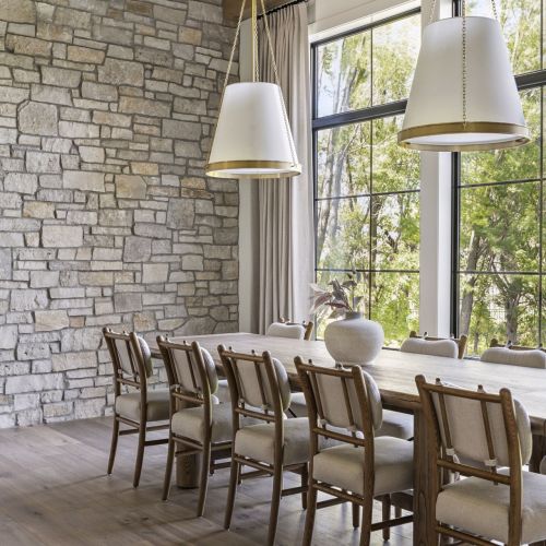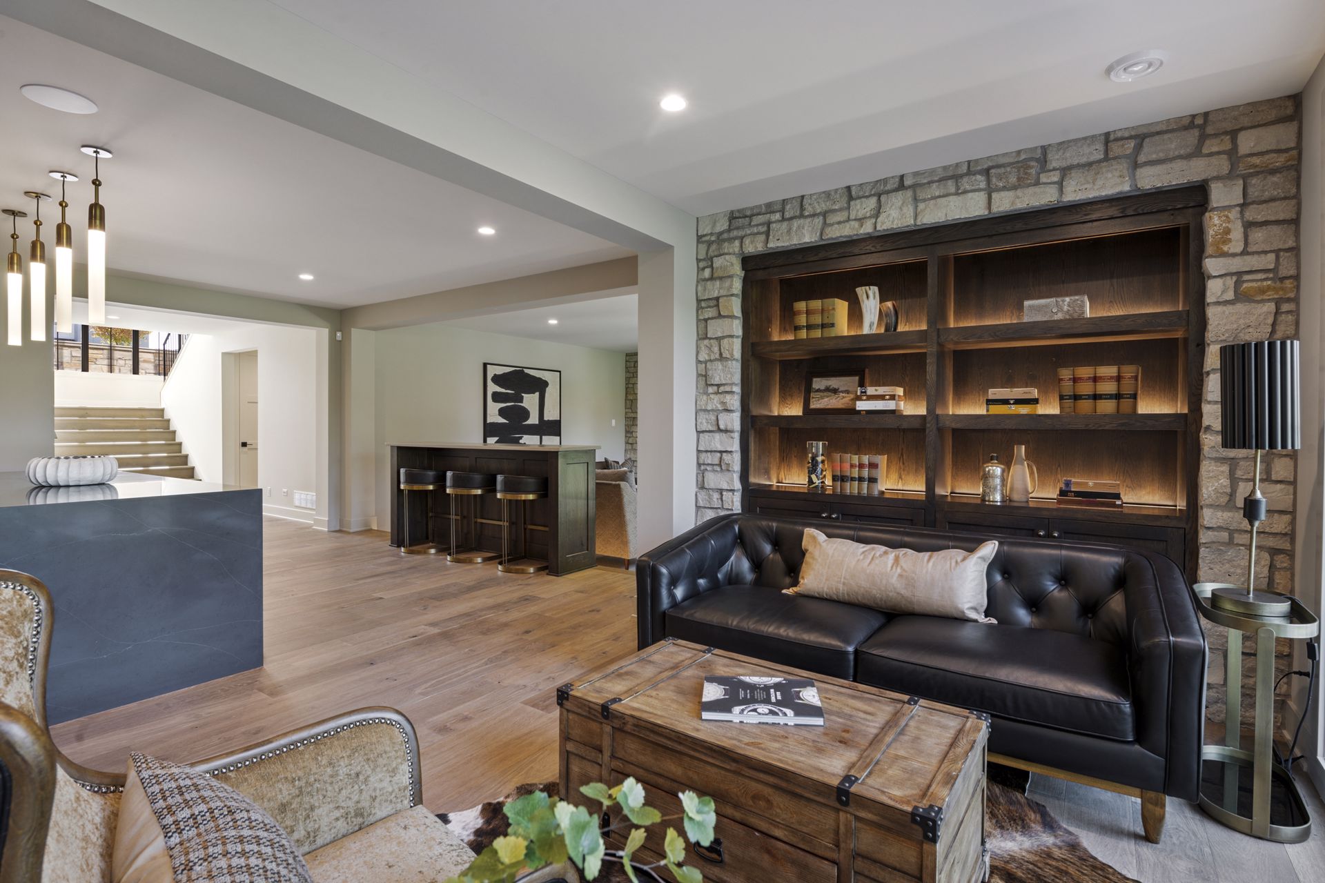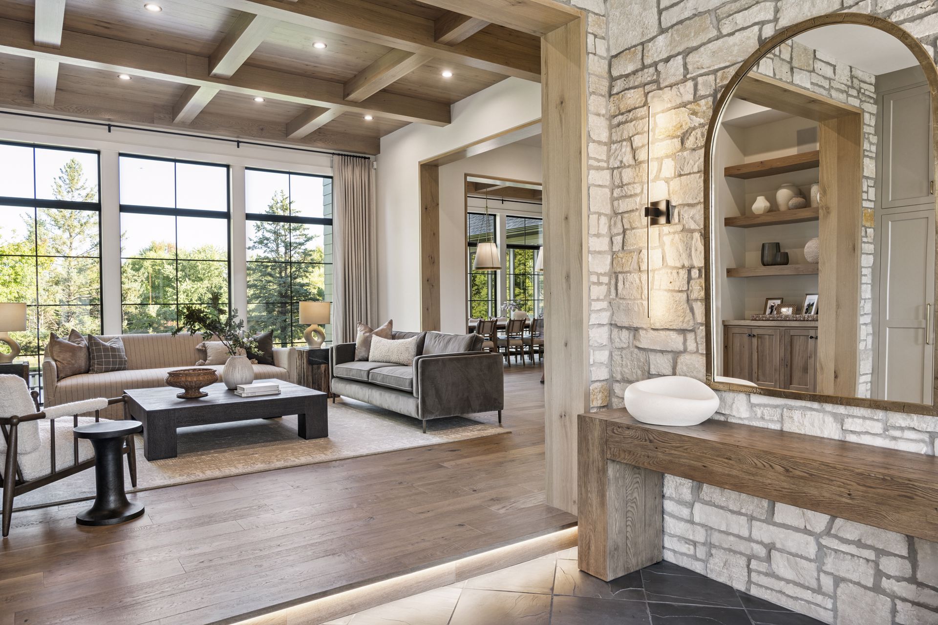 - Guests are greeted with a large Entry featuring natural stone accent walls, custom built-in cabinetry and front facing grand staircase with windows galore and a 3-story overlook in front of the glass.