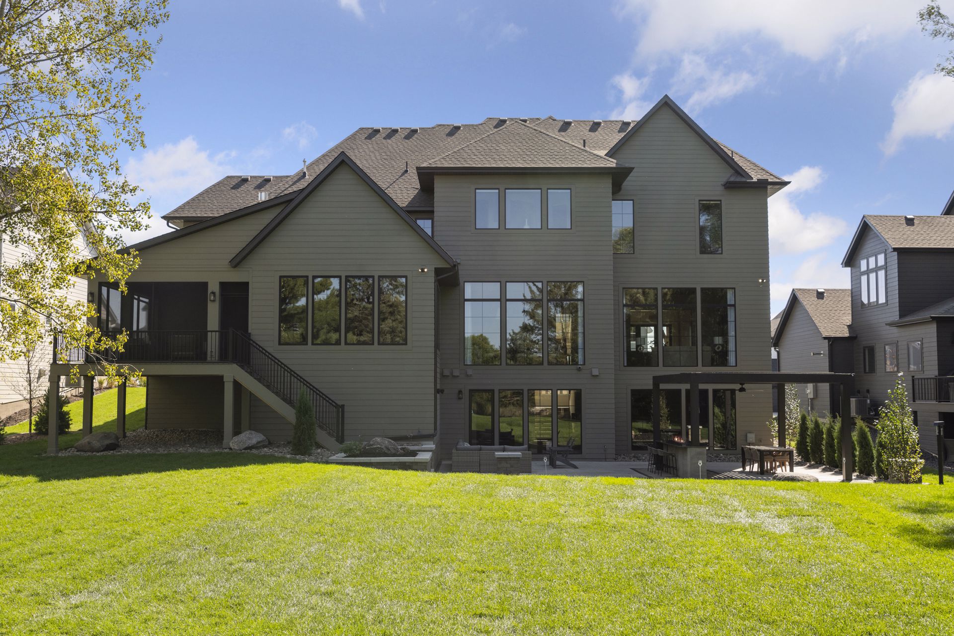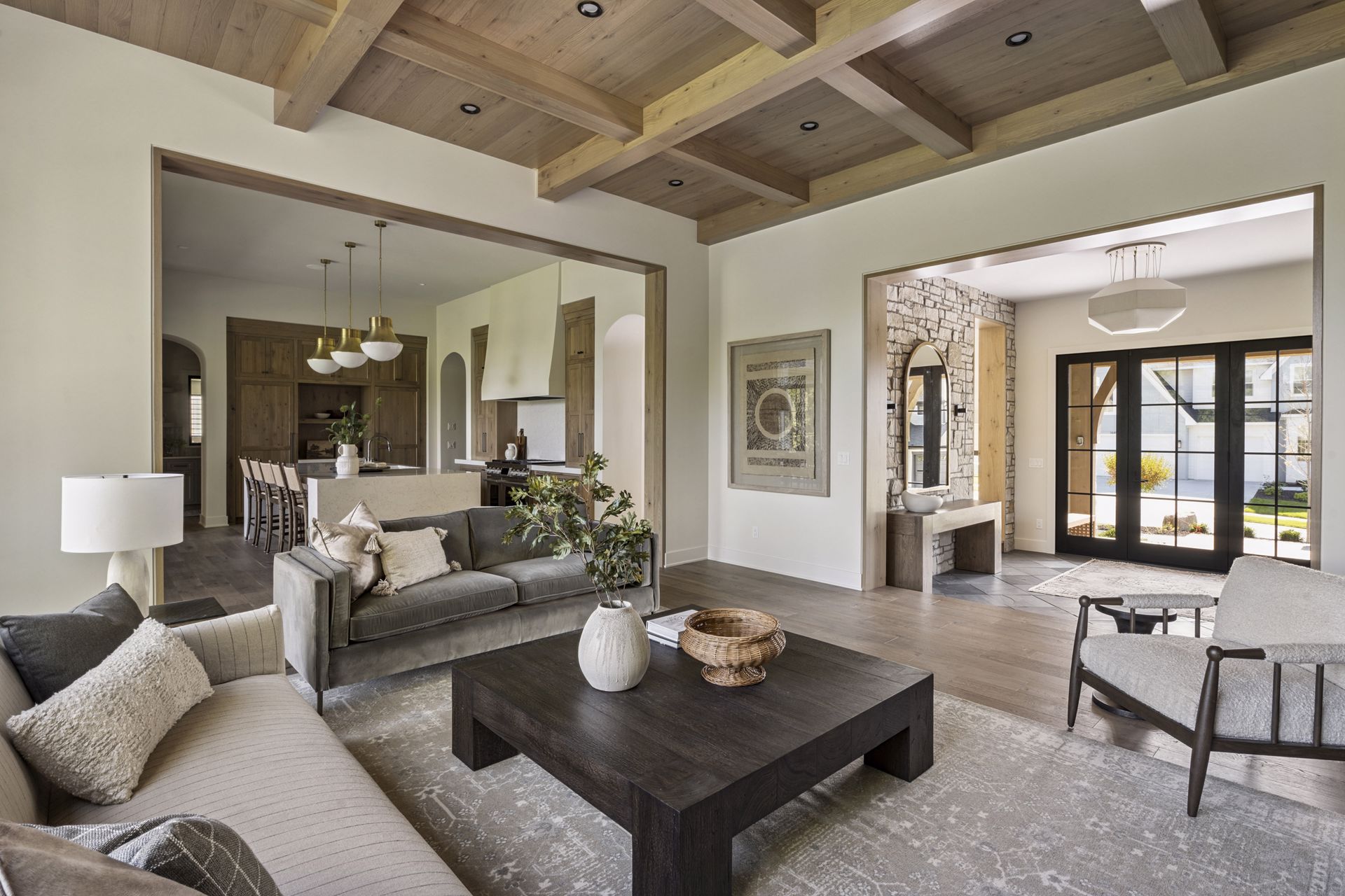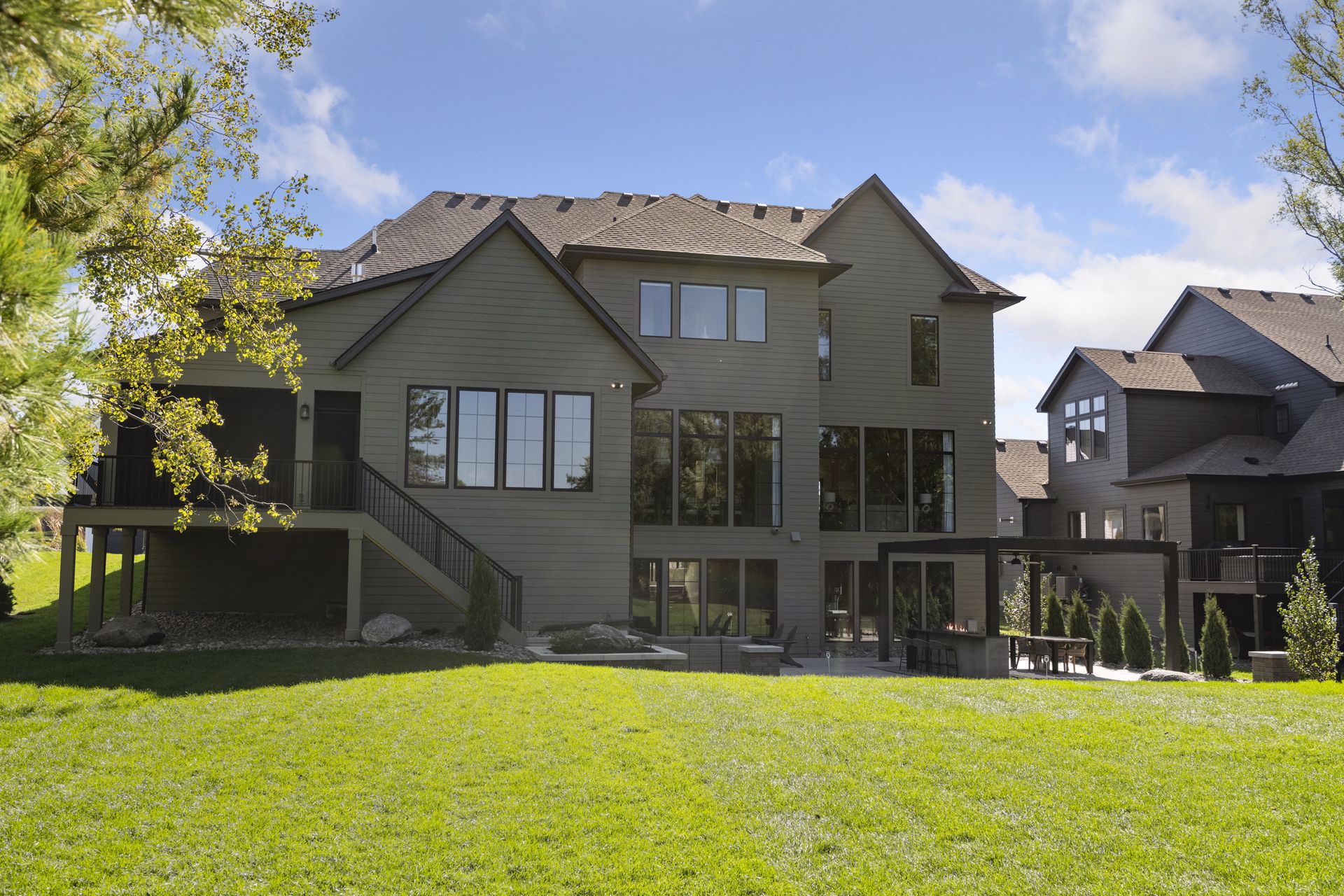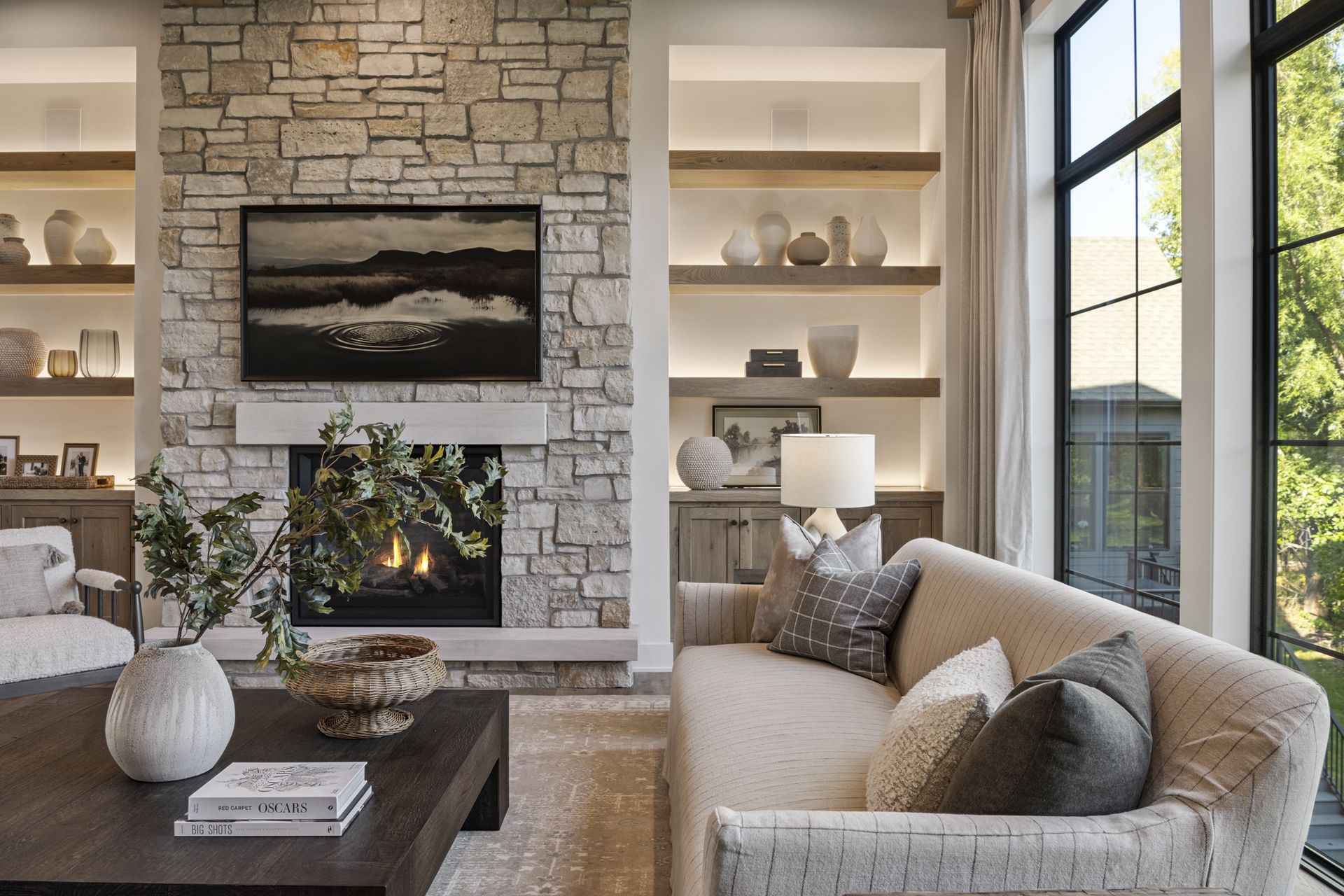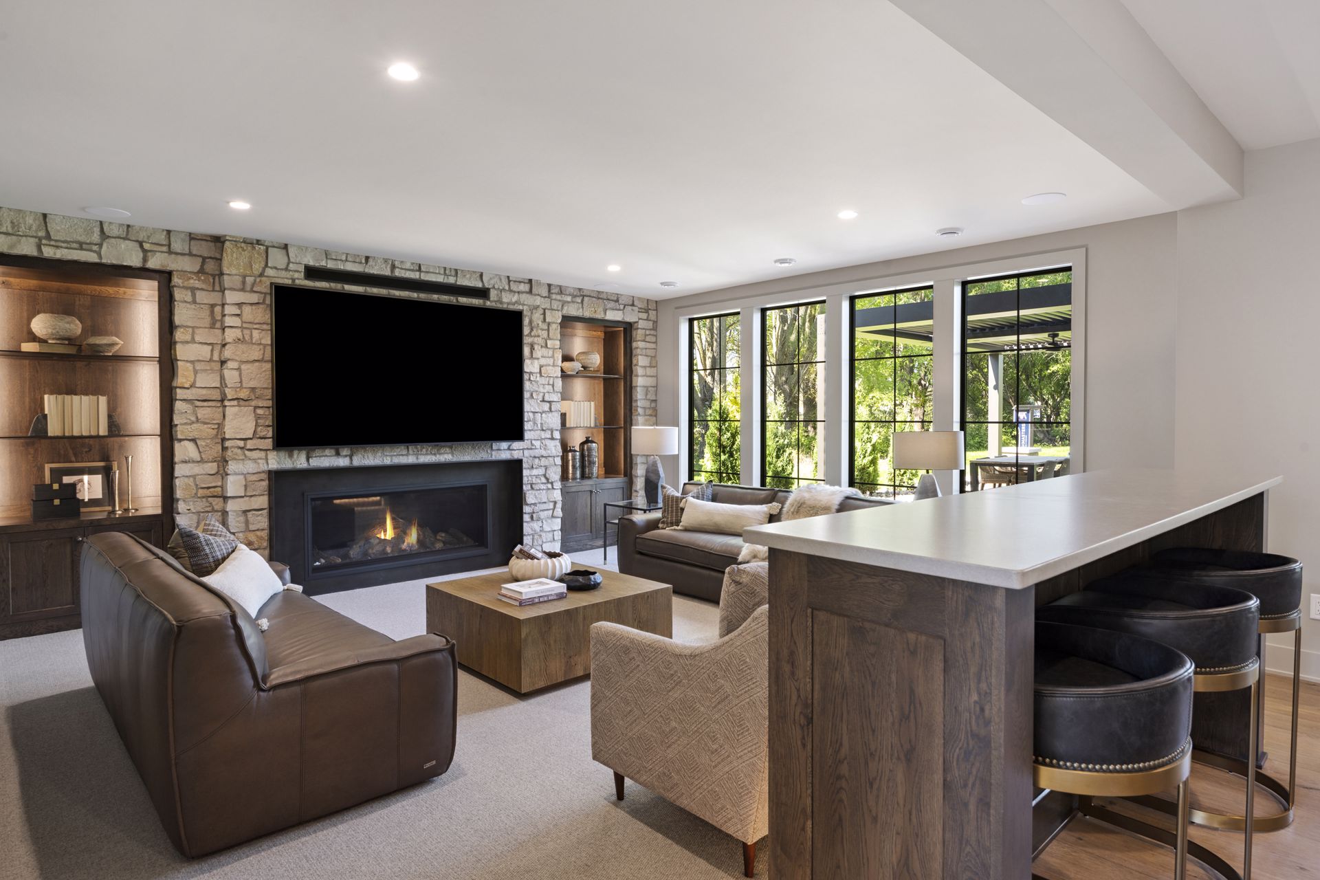 - Guests are greeted with a large Entry featuring natural stone accent walls, custom built-in cabinetry and front facing grand staircase with windows galore and a 3-story overlook in front of the glass.