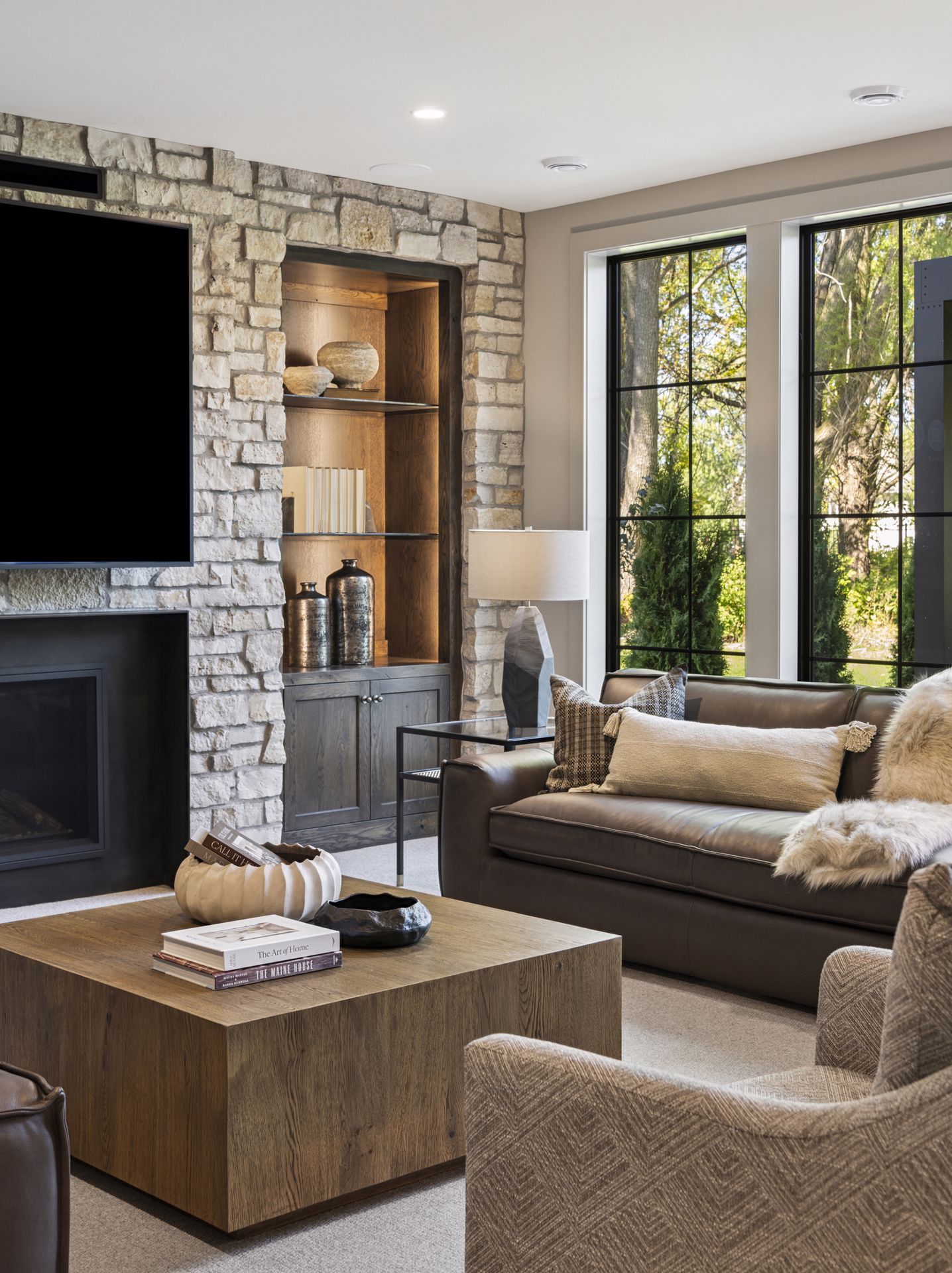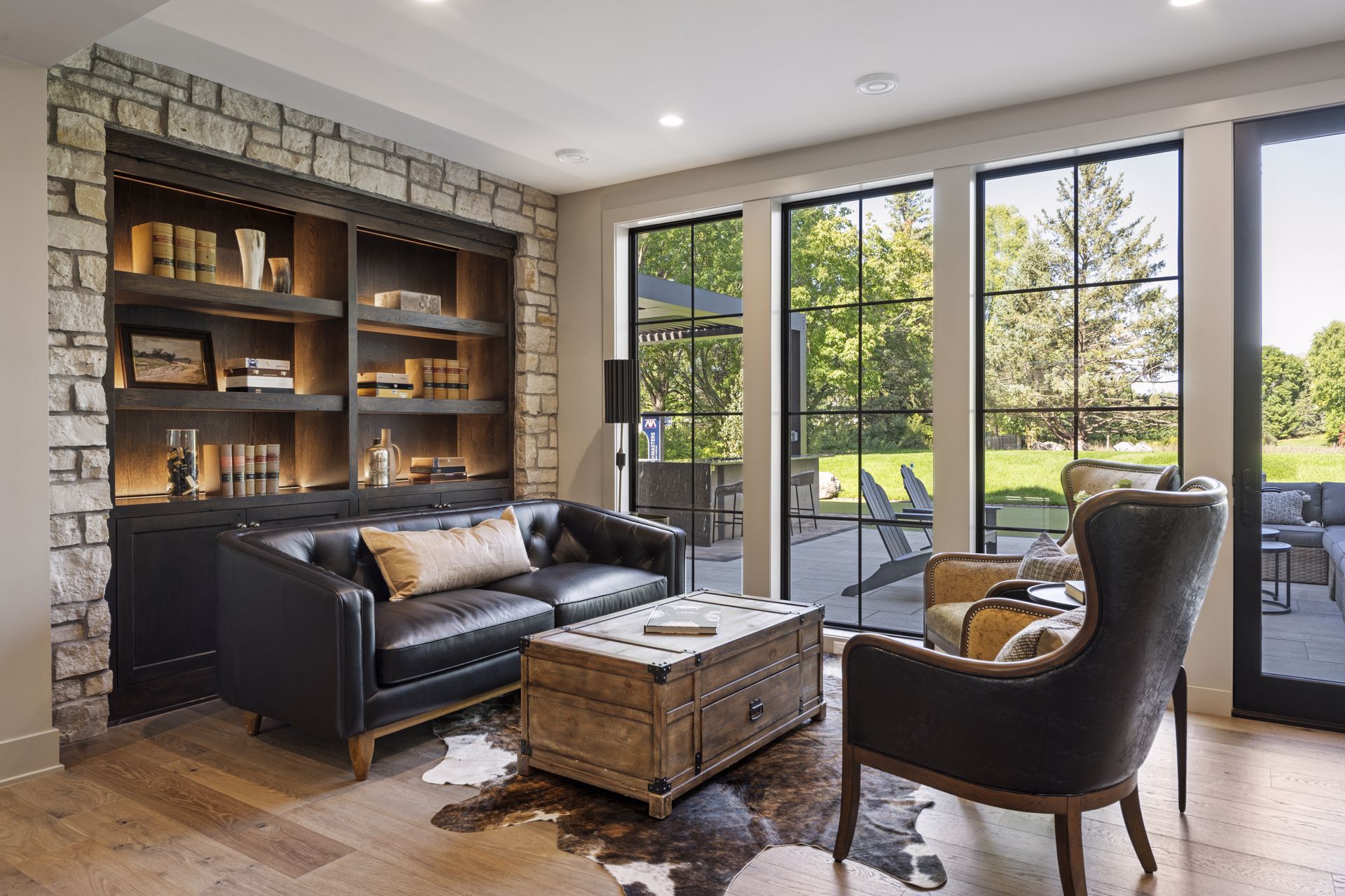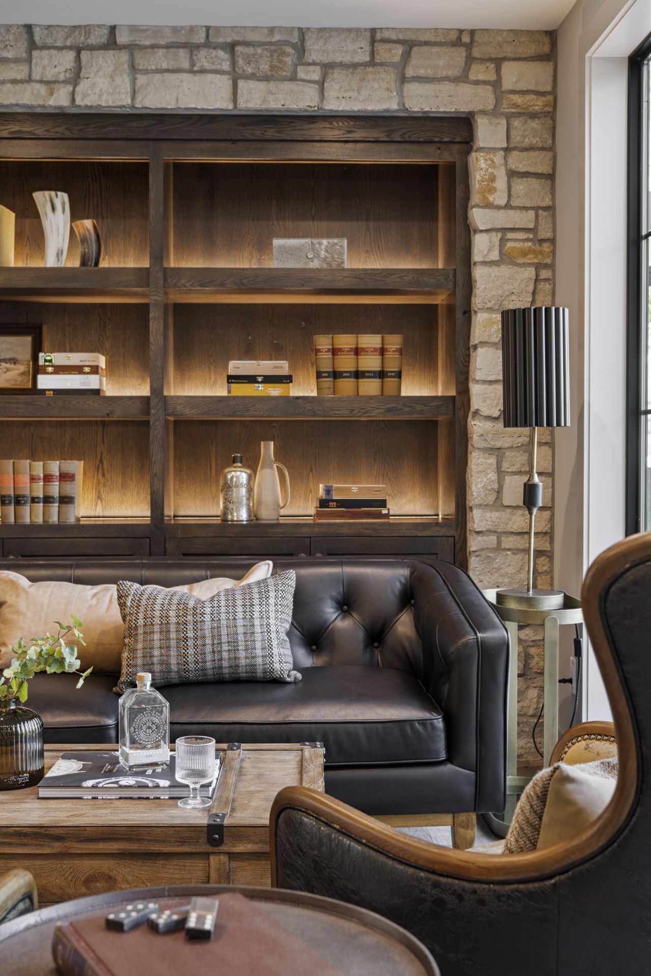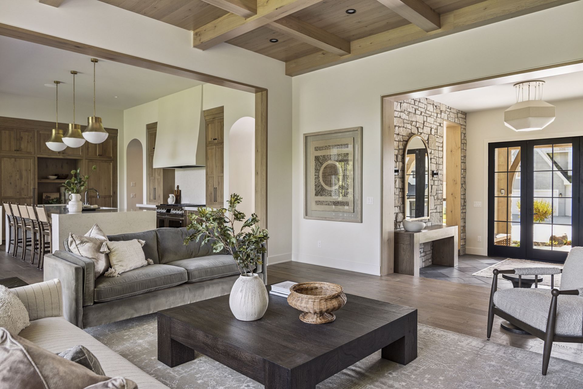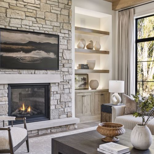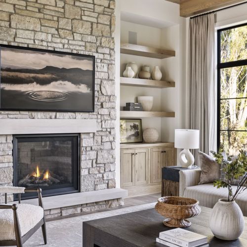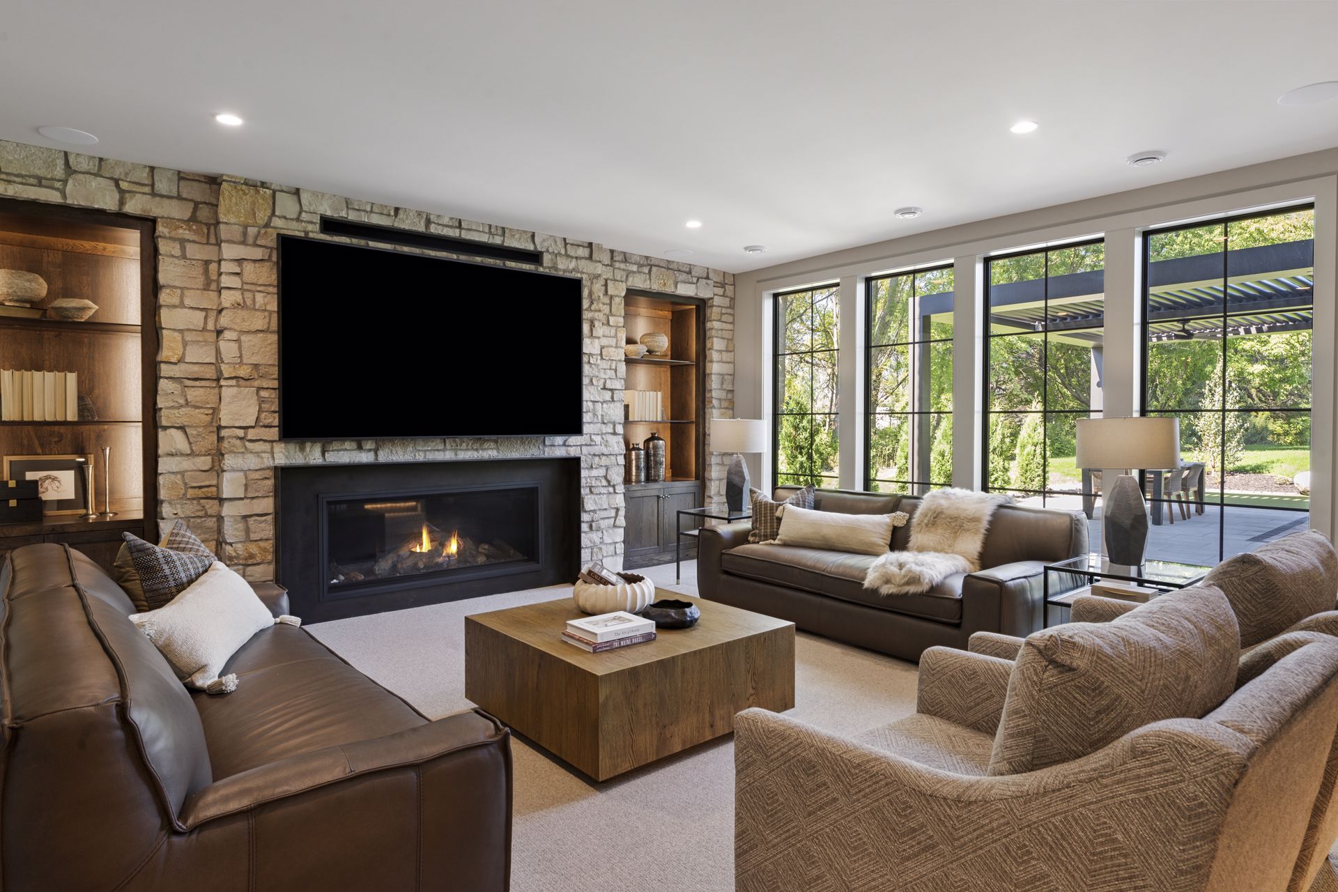 - Guests are greeted with a large Entry featuring natural stone accent walls, custom built-in cabinetry and front facing grand staircase with windows galore and a 3-story overlook in front of the glass.