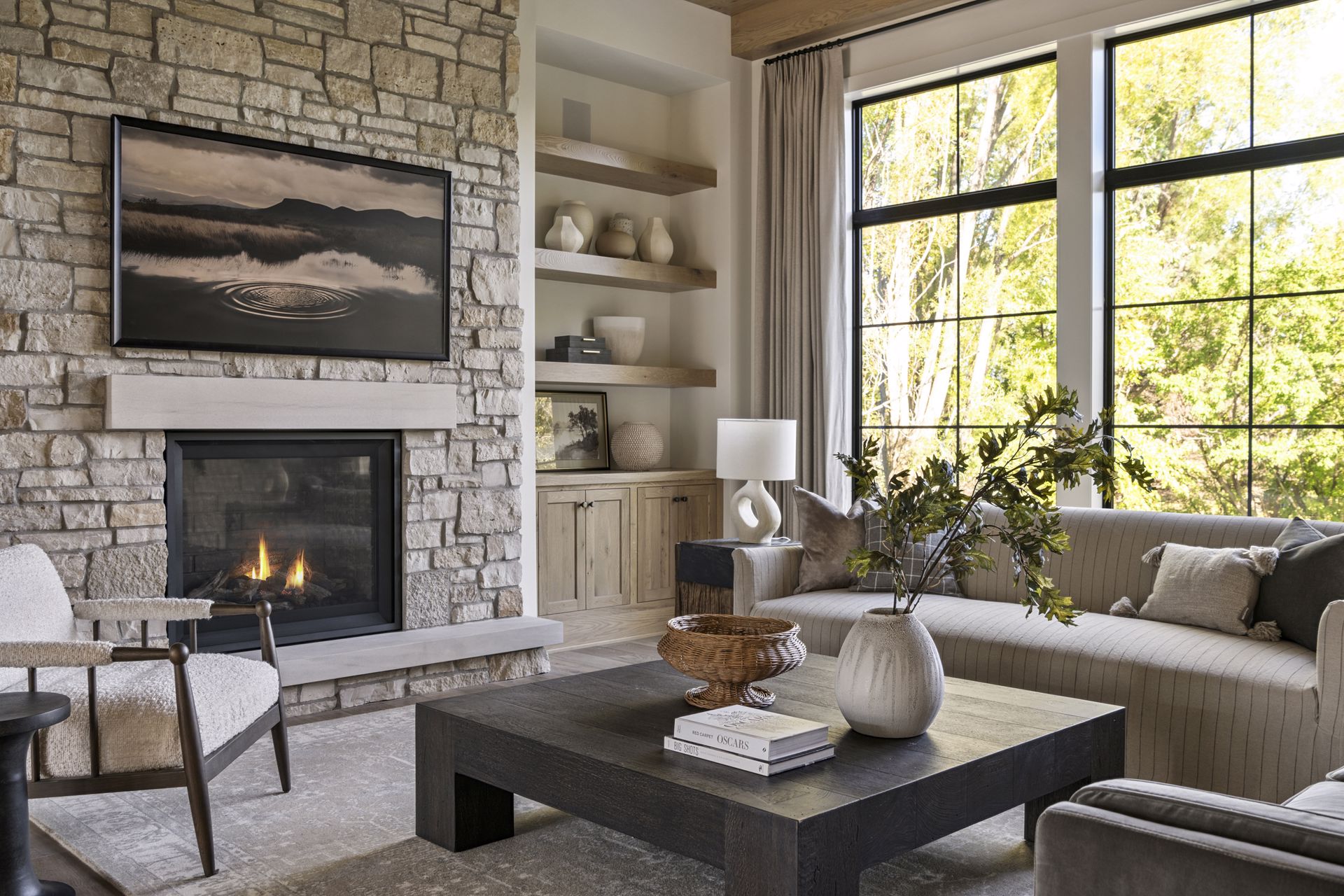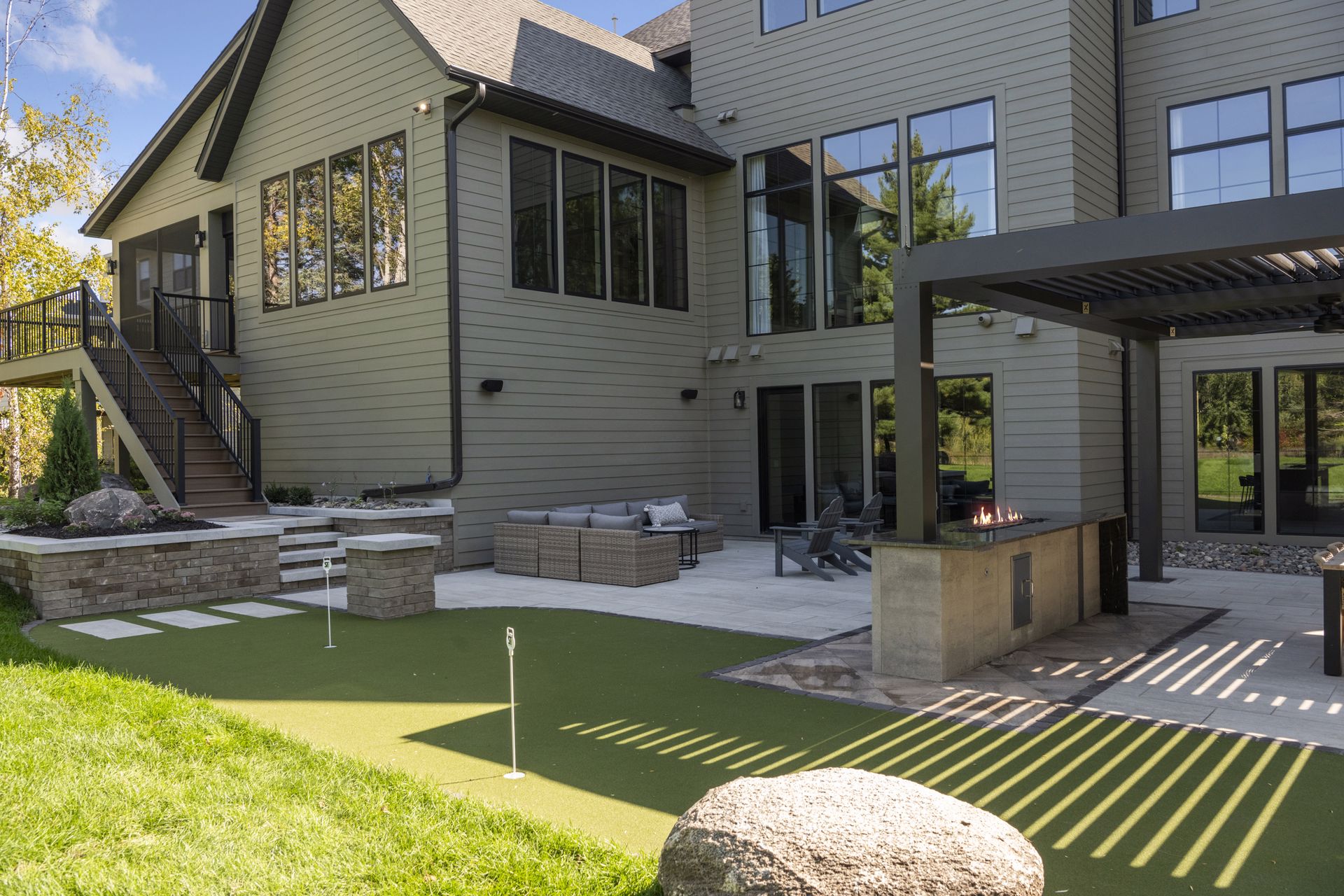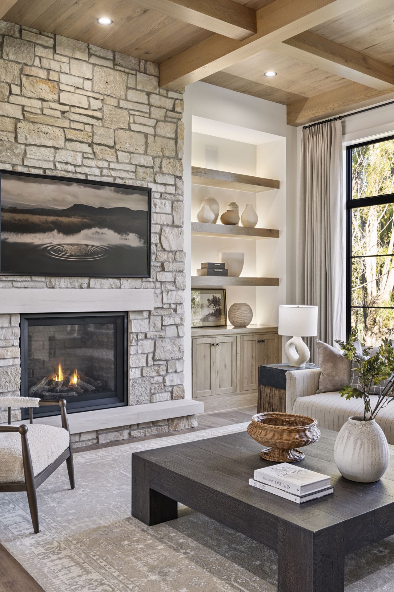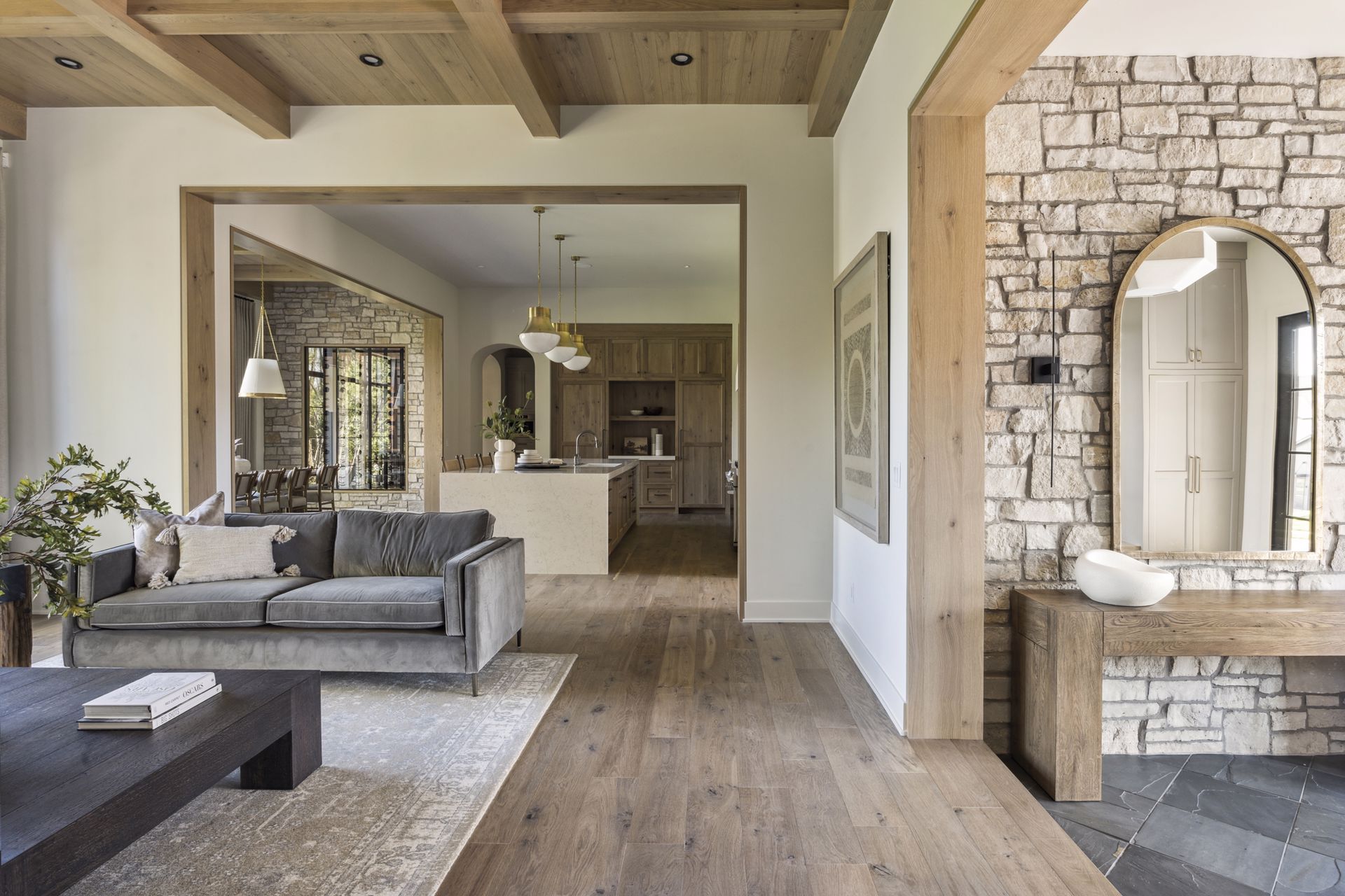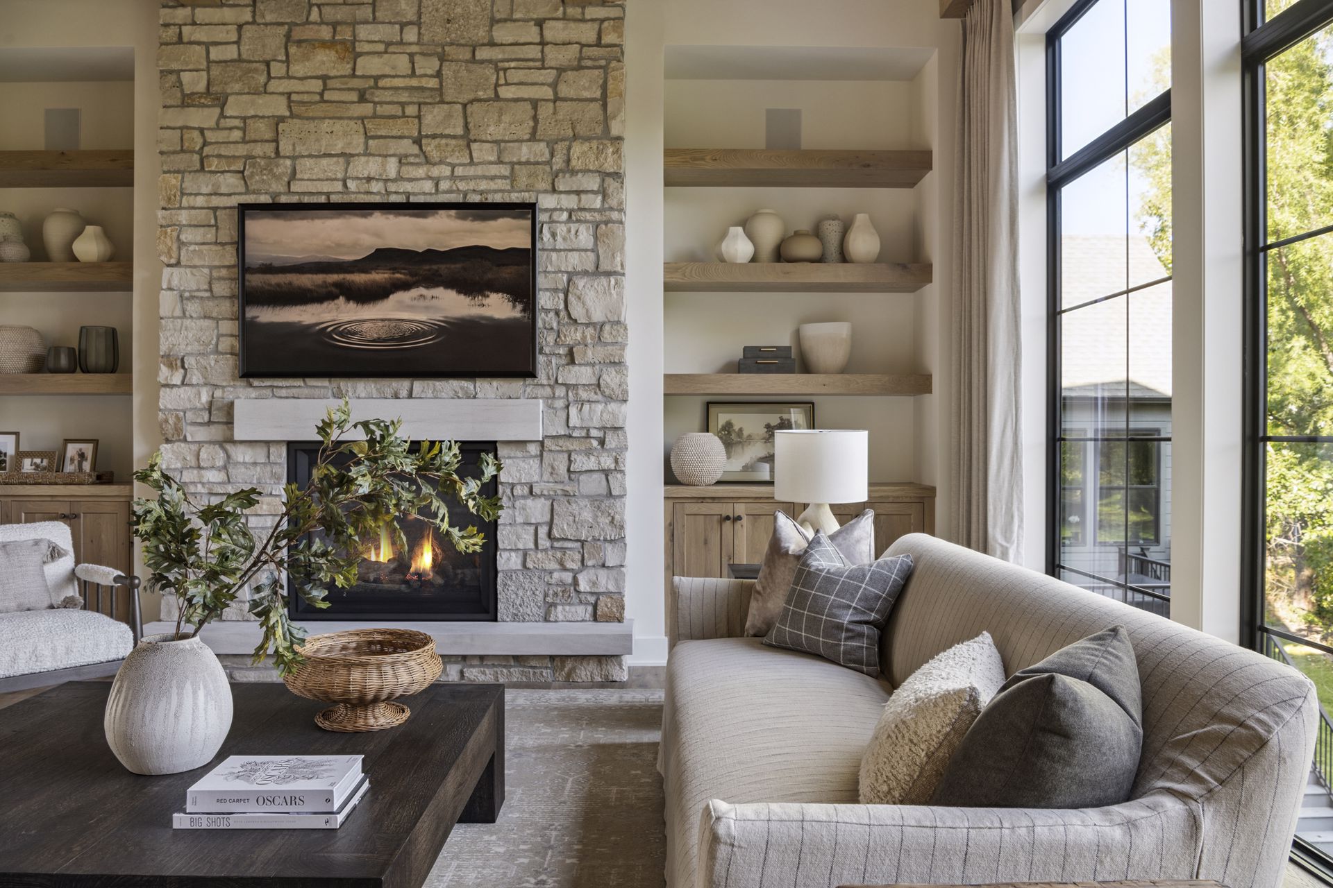 - Guests are greeted with a large Entry featuring natural stone accent walls, custom built-in cabinetry and front facing grand staircase with windows galore and a 3-story overlook in front of the glass.