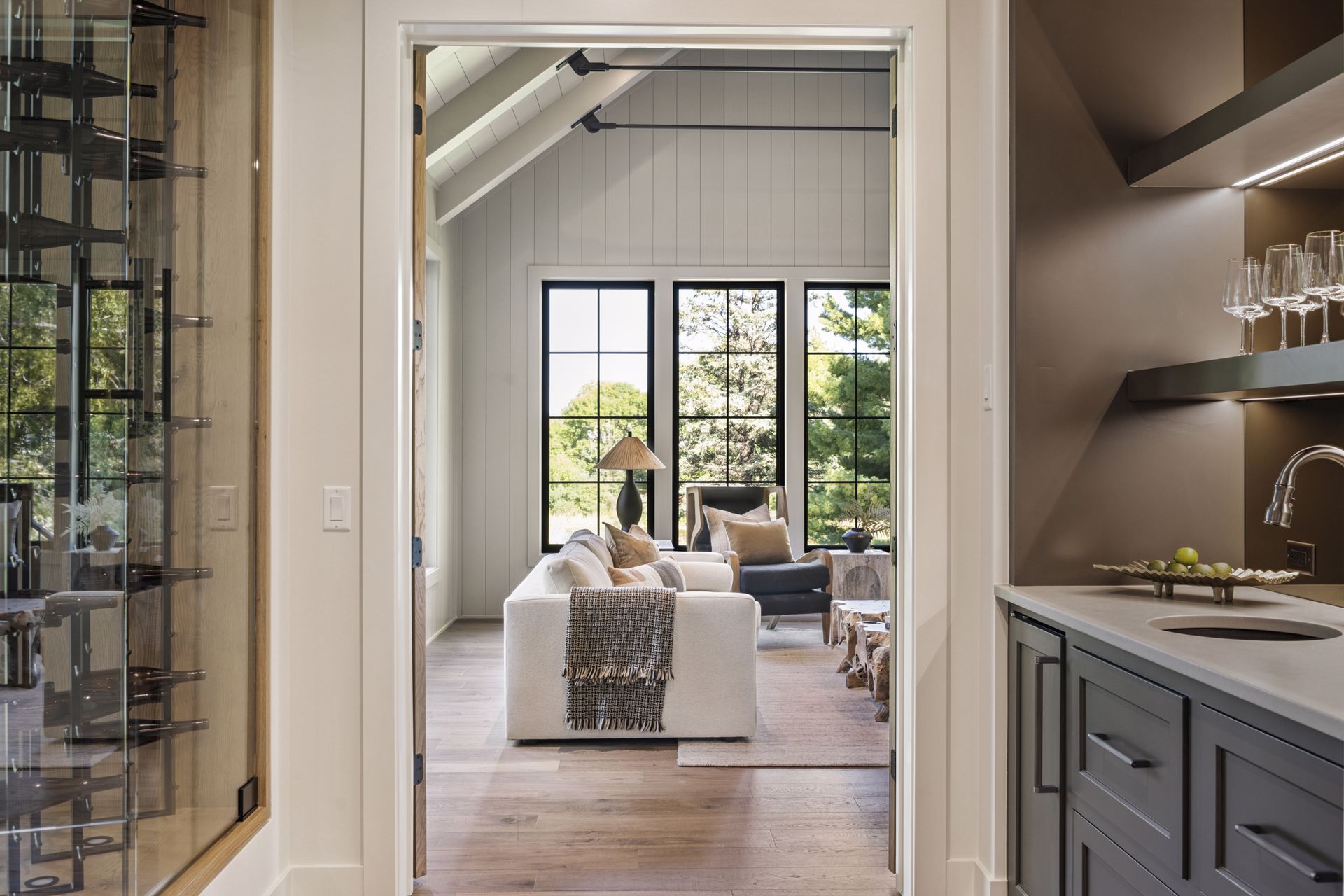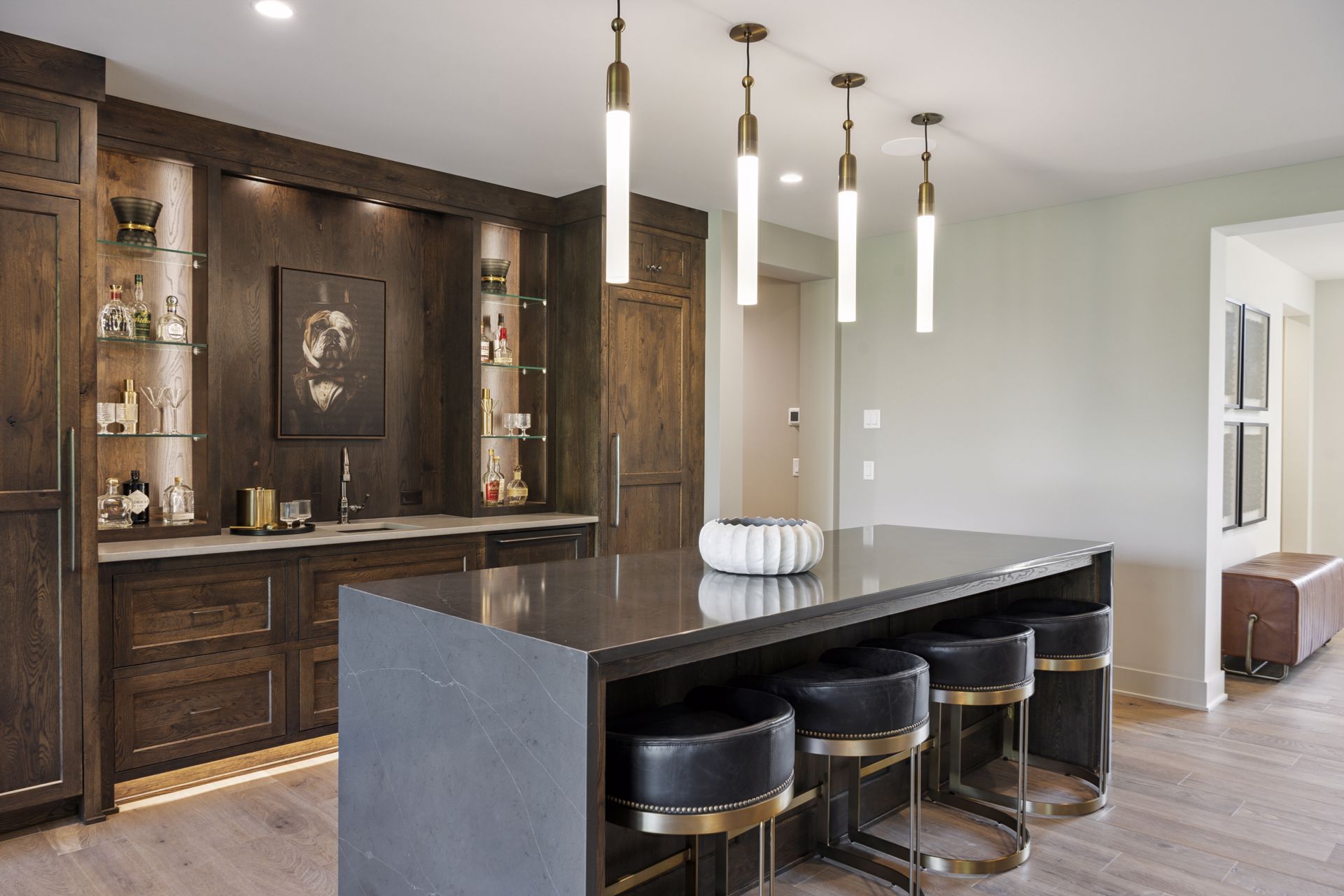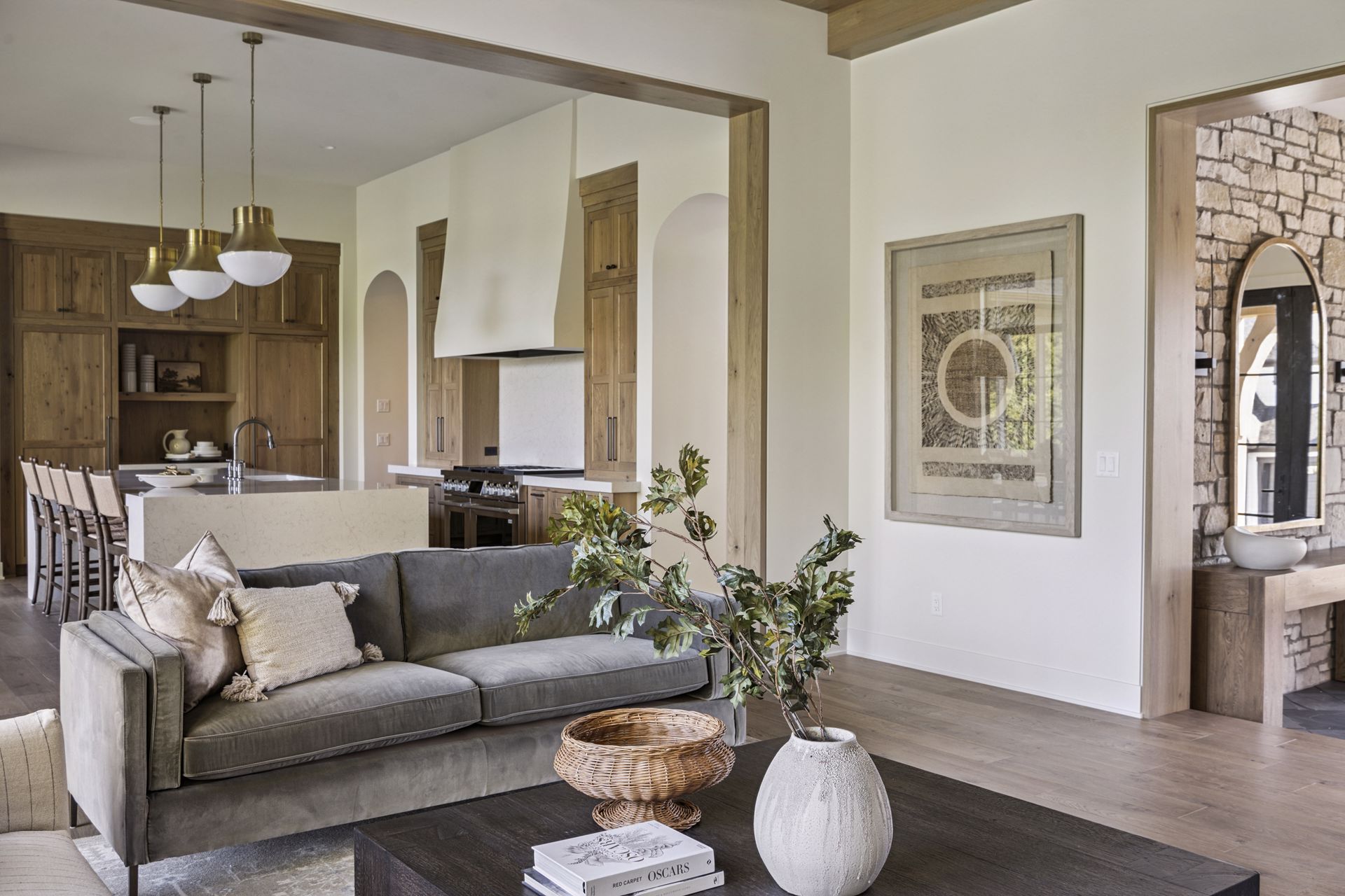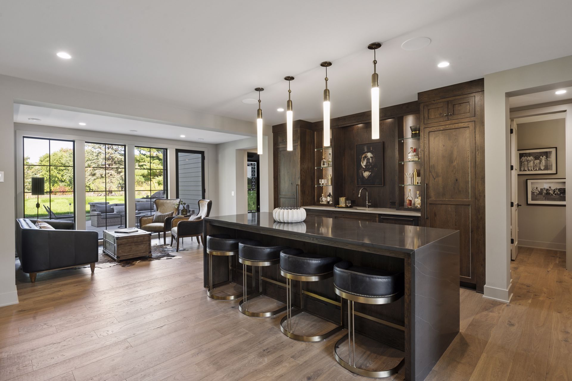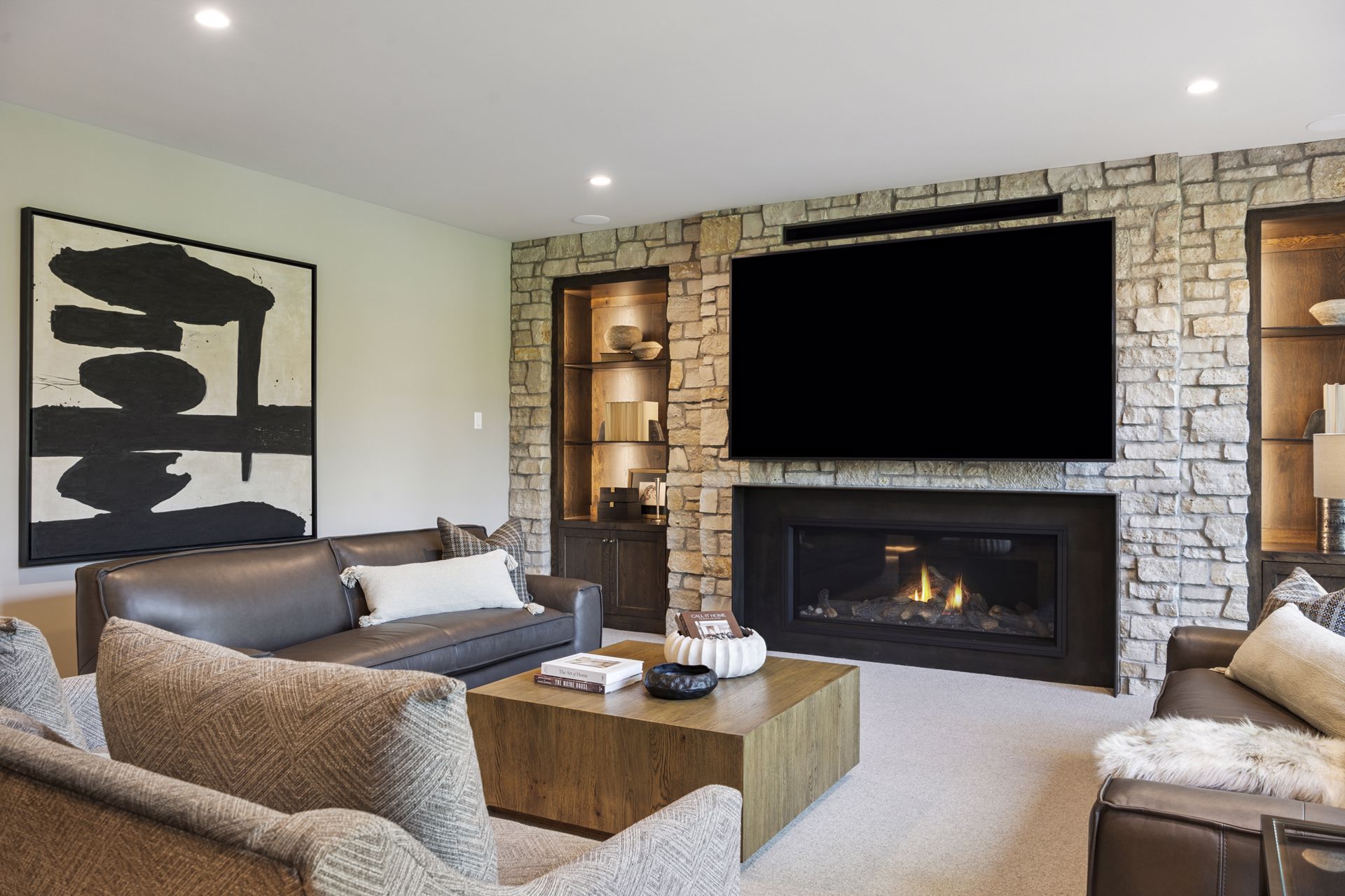 - Guests are greeted with a large Entry featuring natural stone accent walls, custom built-in cabinetry and front facing grand staircase with windows galore and a 3-story overlook in front of the glass.