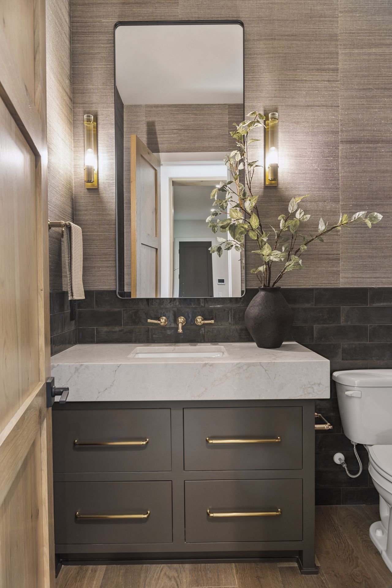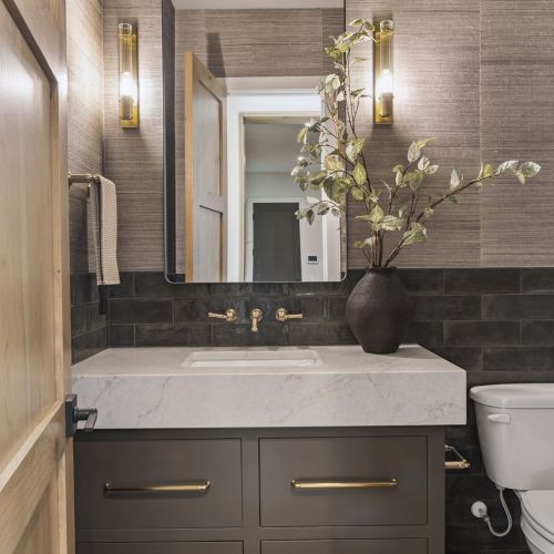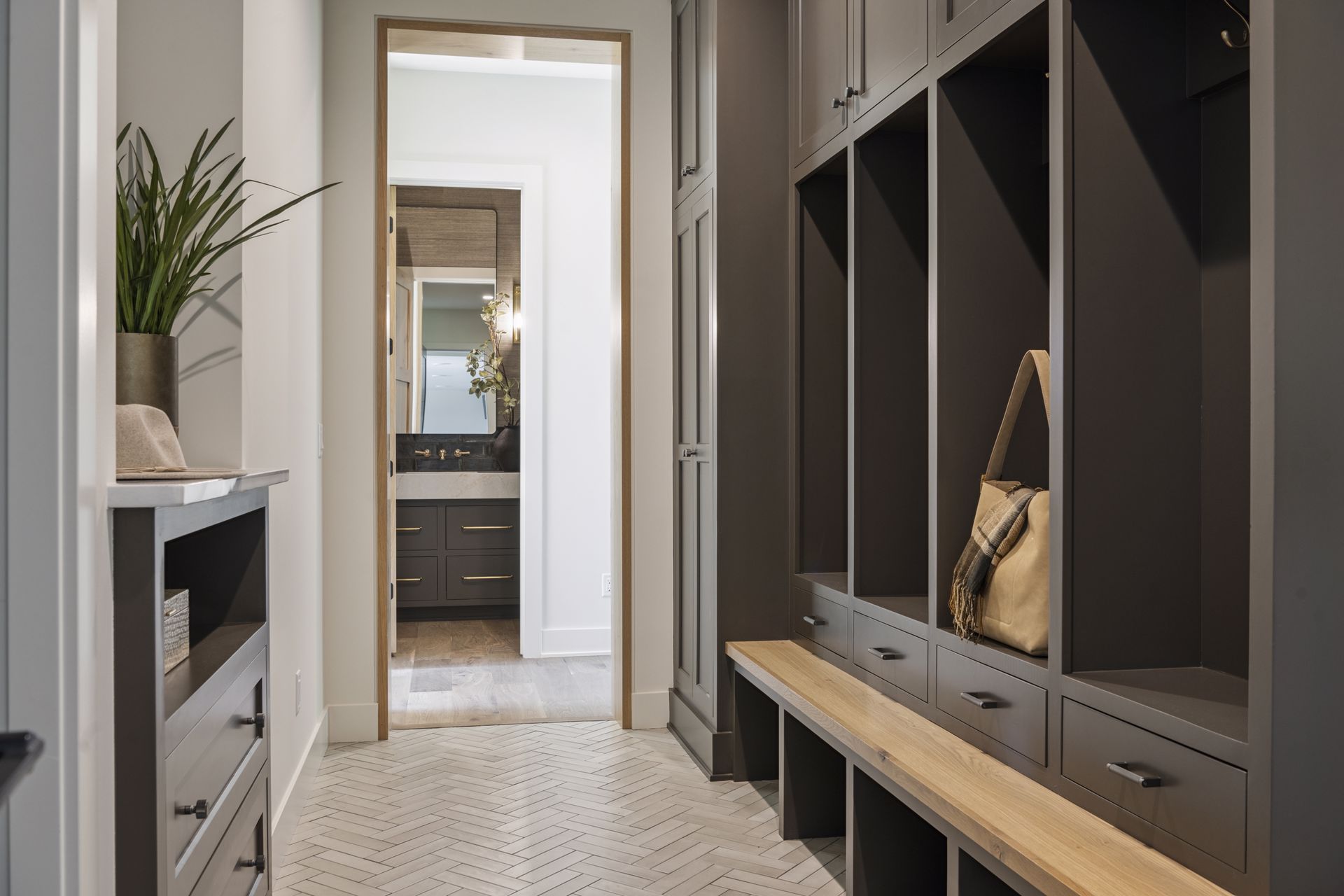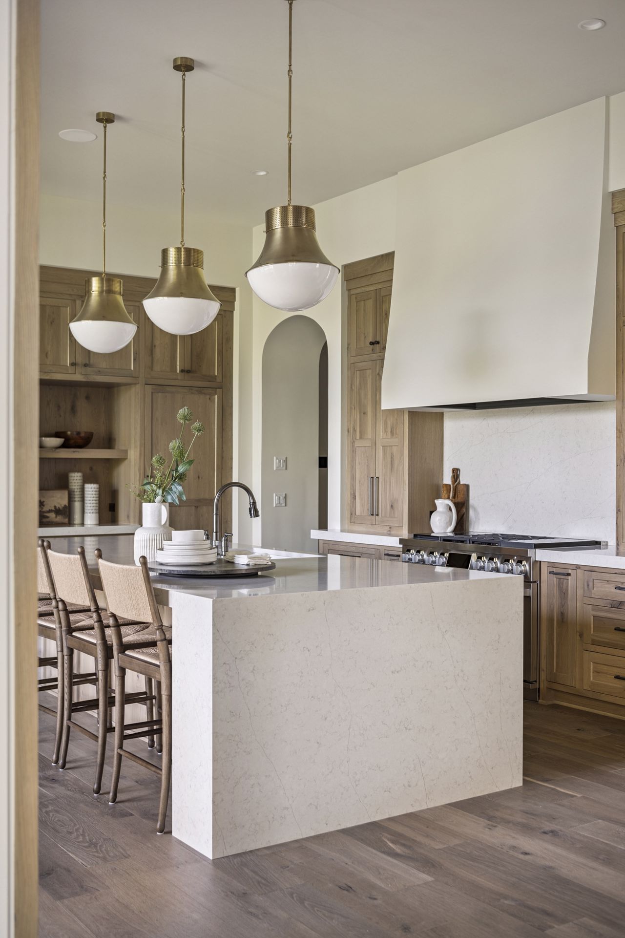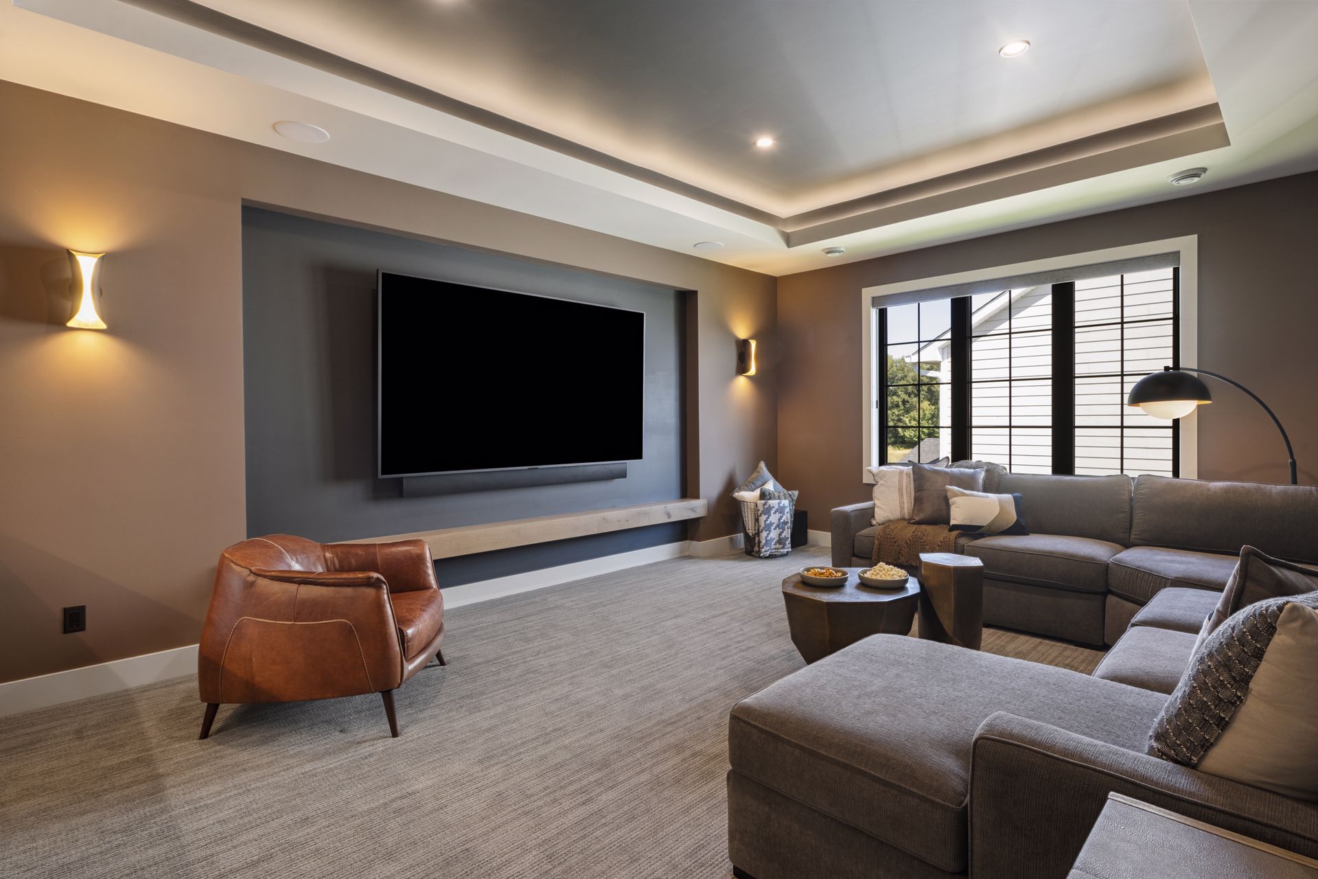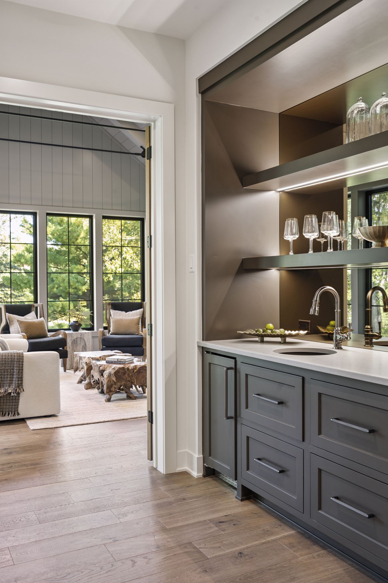 - Guests are greeted with a large Entry featuring natural stone accent walls, custom built-in cabinetry and front facing grand staircase with windows galore and a 3-story overlook in front of the glass.