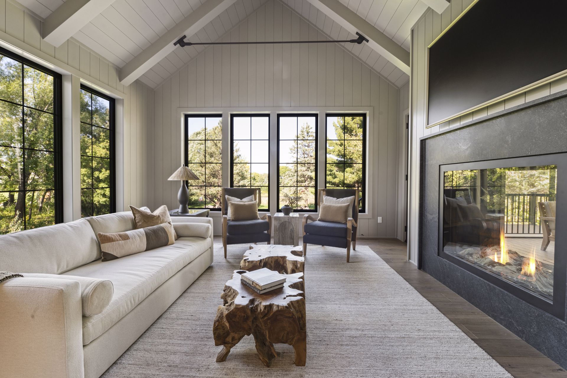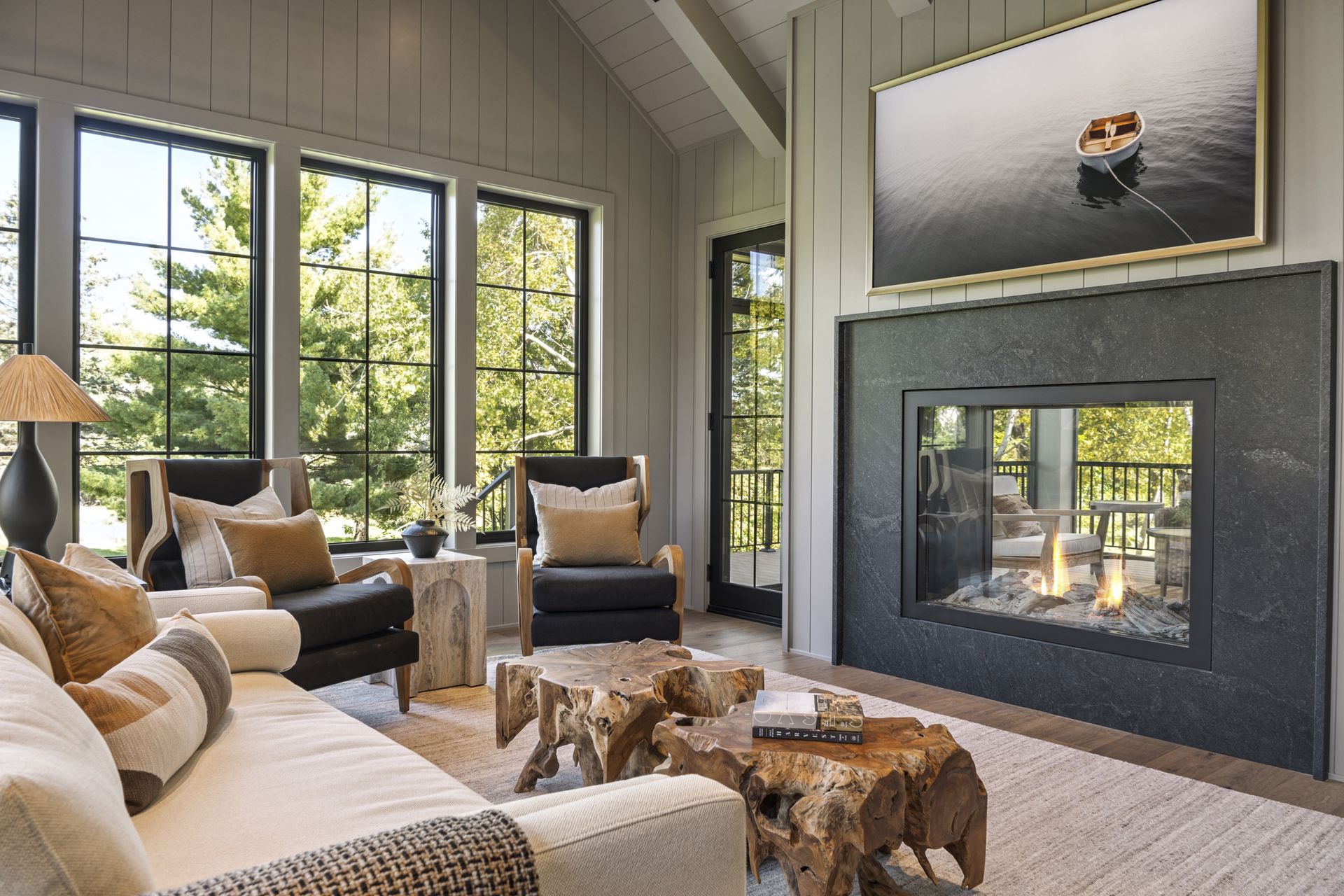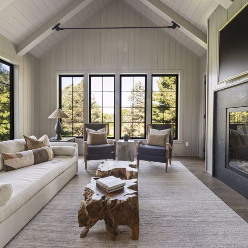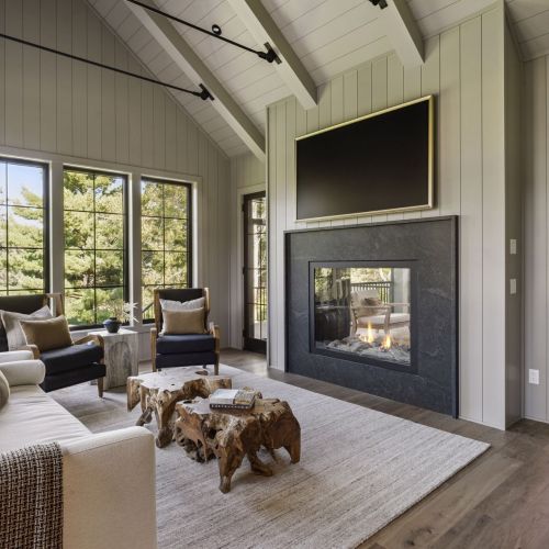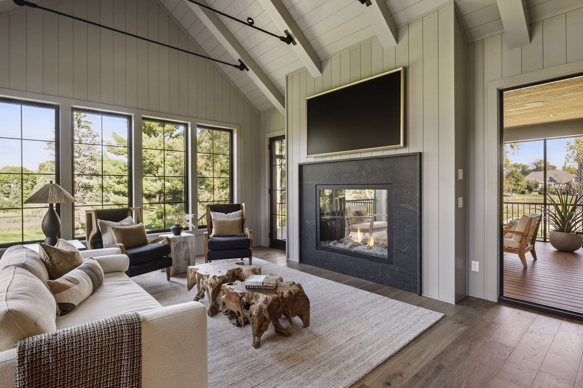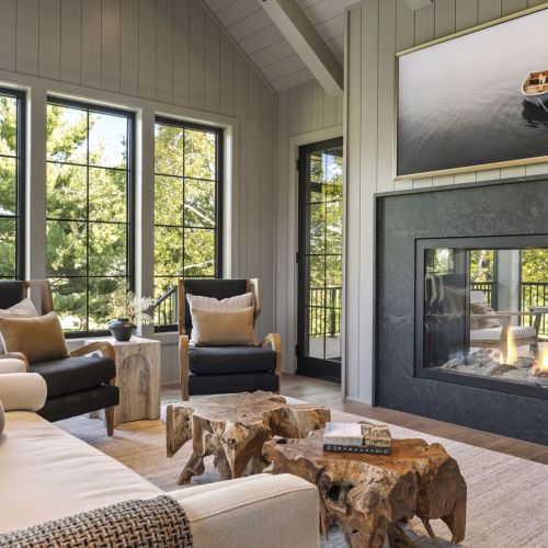 - Rear-oriented Sunroom and Screen Porch offers quiet and cozy getaway space featuring a dual sided fireplace and abundance of windows for natural light