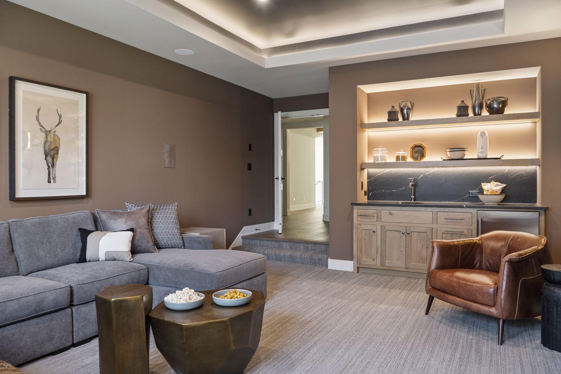- The highlight of the upper floor is the grand hallway with wood flooring and raised ceiling with beams leading to a spacious bonus room featuring a full Wet Bar with sink, faucet & beverage center