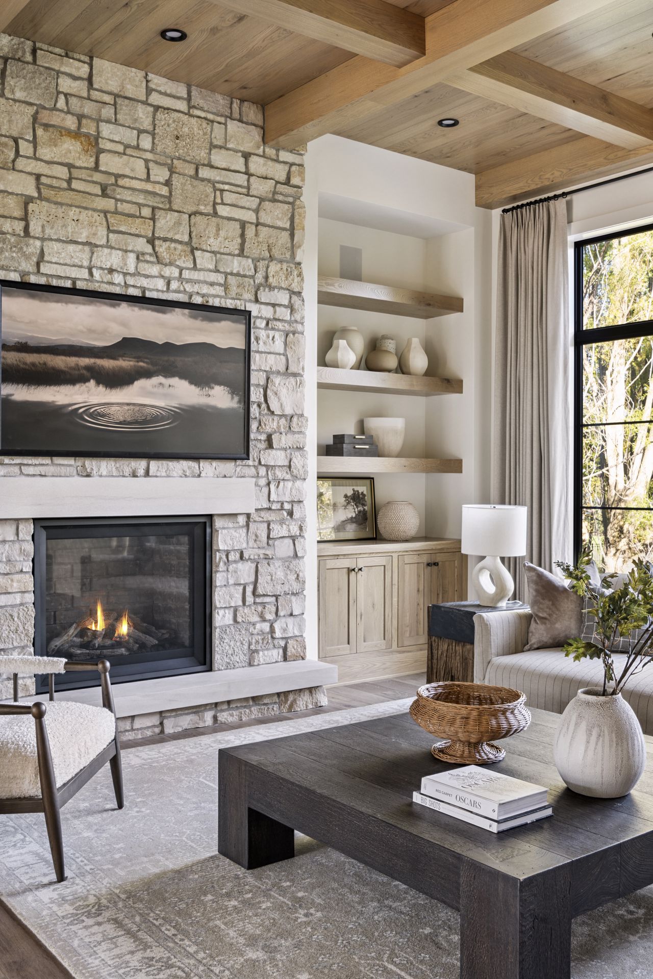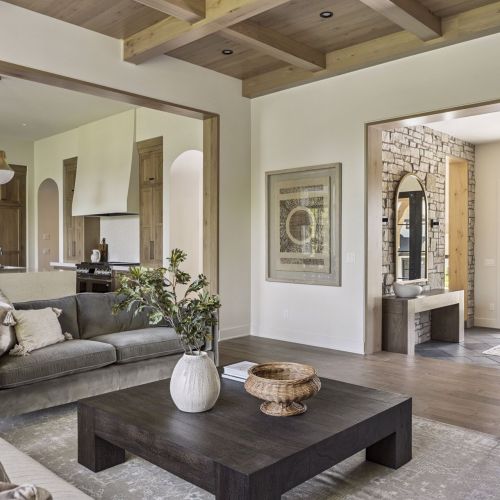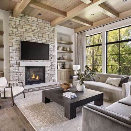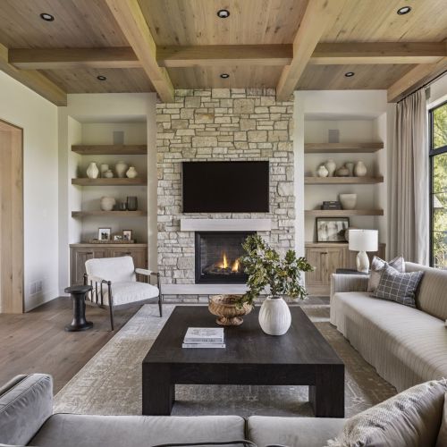 - Owners Suite offers double doors, dramatic raised wood ceiling and beams, natural stone fireplace, wood floors throughout & private sitting area