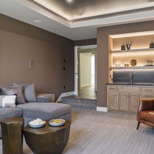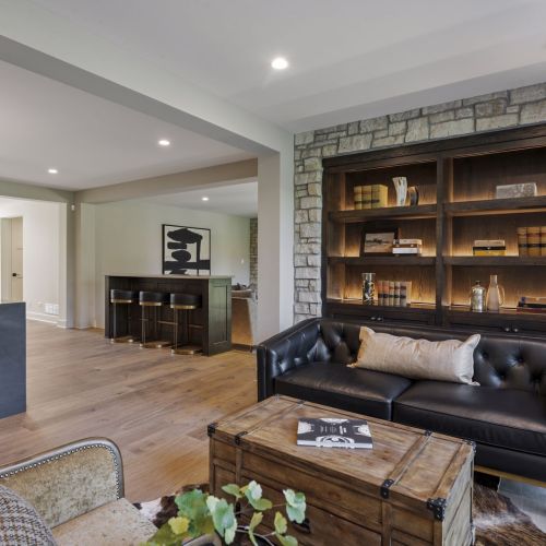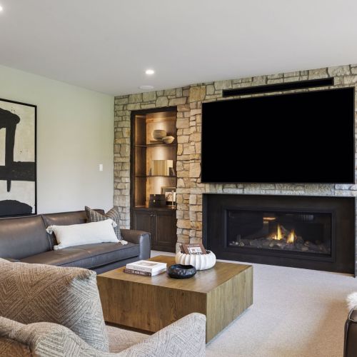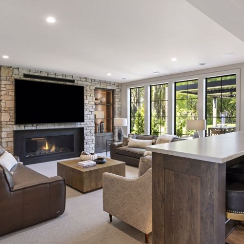 - The Lower Level is complete with a Family Room featuring a natural stone fireplace wall with entertainment built-ins, Games area, Wet Bar and Lounge plus 5th Bedroom,¾ Bath, ½ Bath