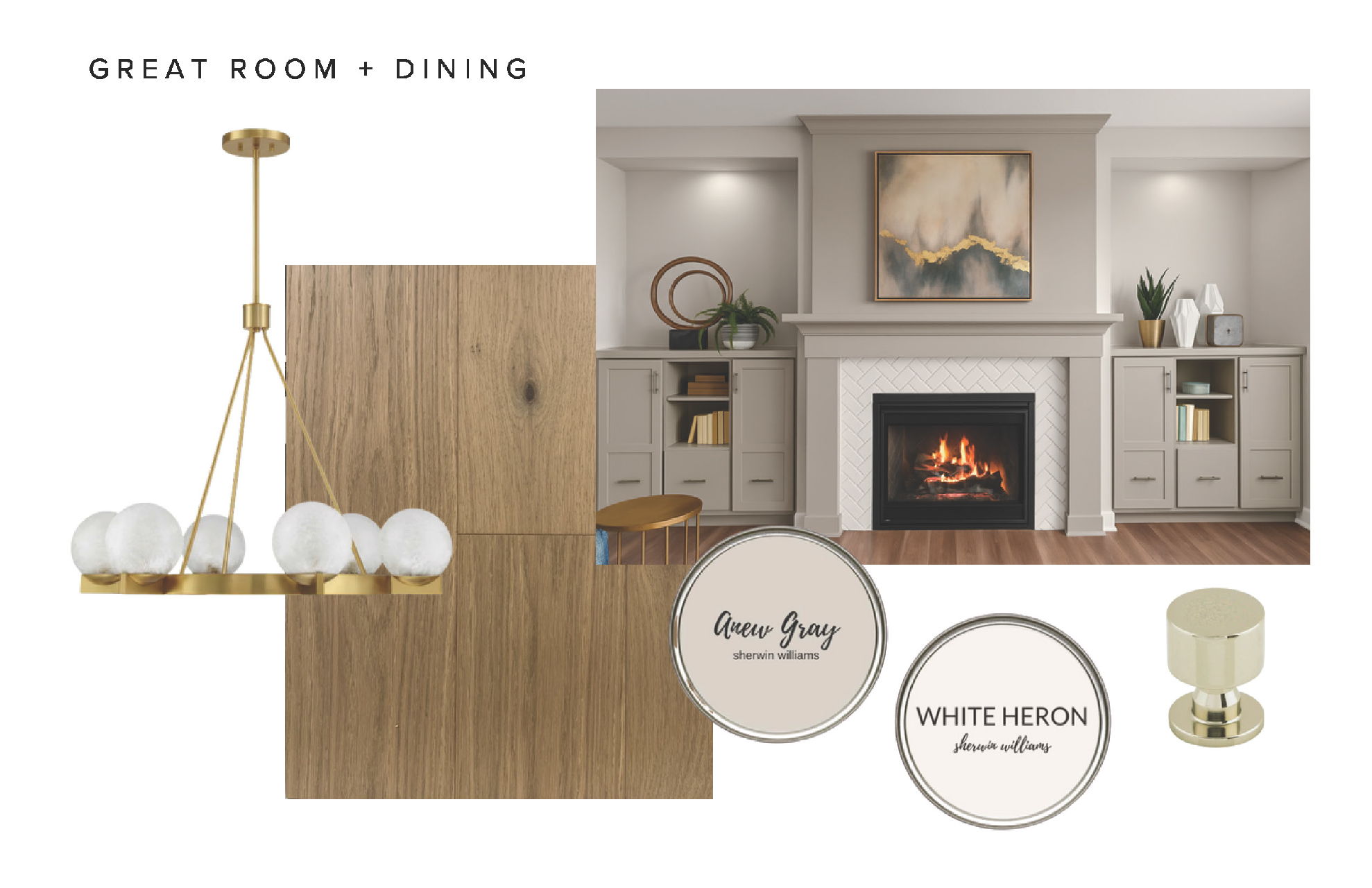 - Great Room showcases a tiled fireplace with base cabinets and complemented by large windows for enjoying exterior views.