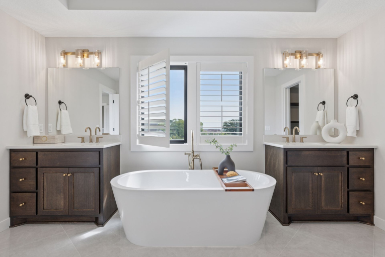 - Owners Bath features an optional raised ceiling, added makeup counter, walk-around tiled shower, and a free-standing soaking tub for a relaxing retreat.