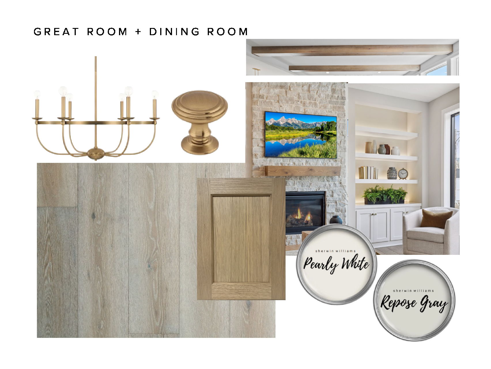 - Great Room features warm wood ceiling beams and a floor to ceiling stone fireplace with paint grade wood shelving and base cabinets for additional storage.