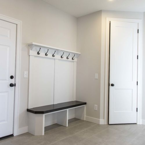 - Walk-in Pantry conveniently located between the garage and kitchen for easy grocery unloading.