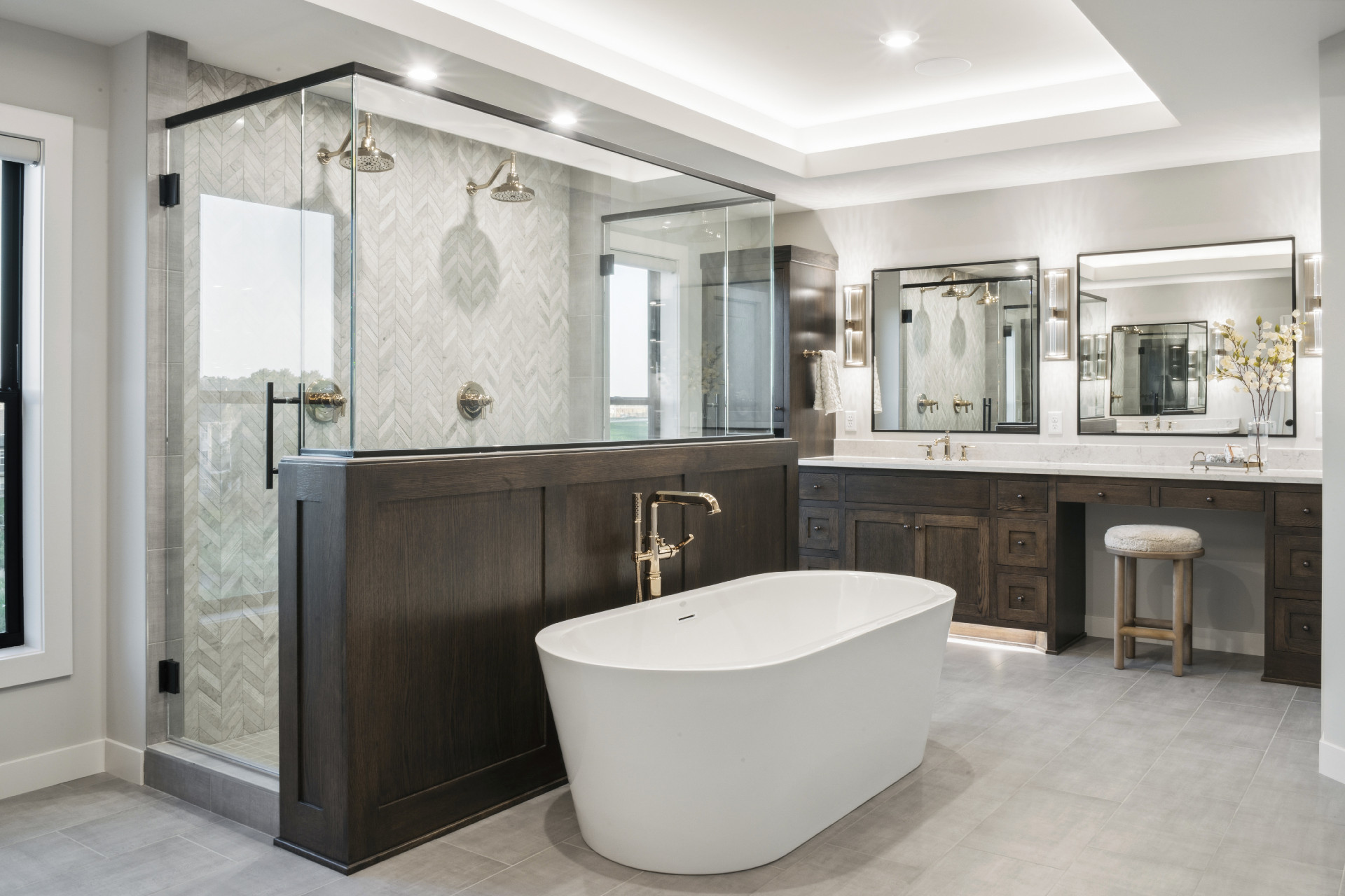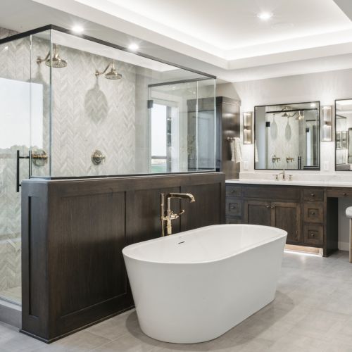 - Owner’s Bath features a striking, oversized walk-in glass shower with dual shower heads, a luxurious free-standing soaking tub, his & hers vanities with ample storage and a make-up desk.
