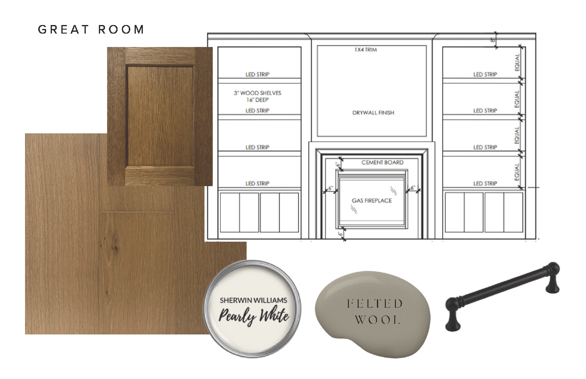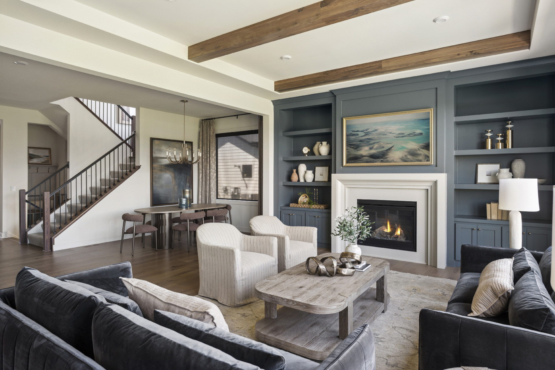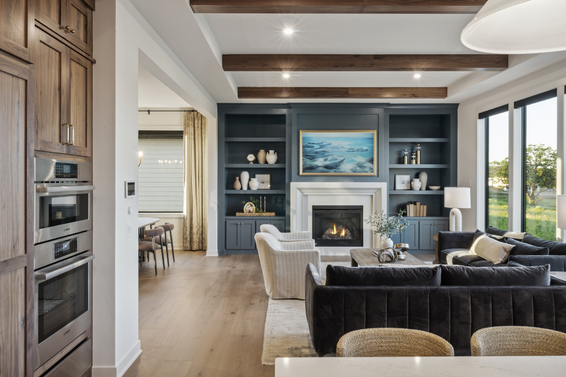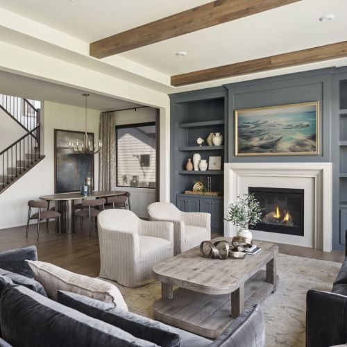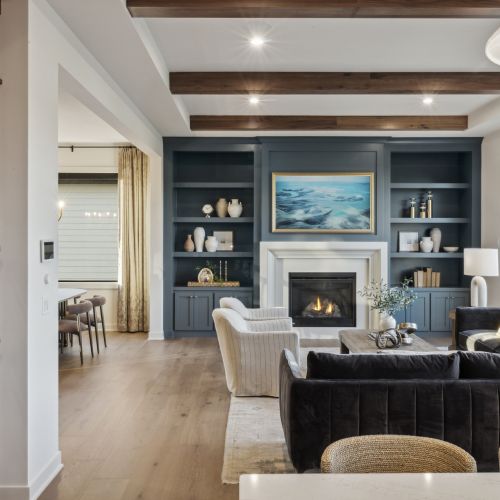 - Great Room features a modern fireplace design with custom-built white oak cabinetry and shelves.