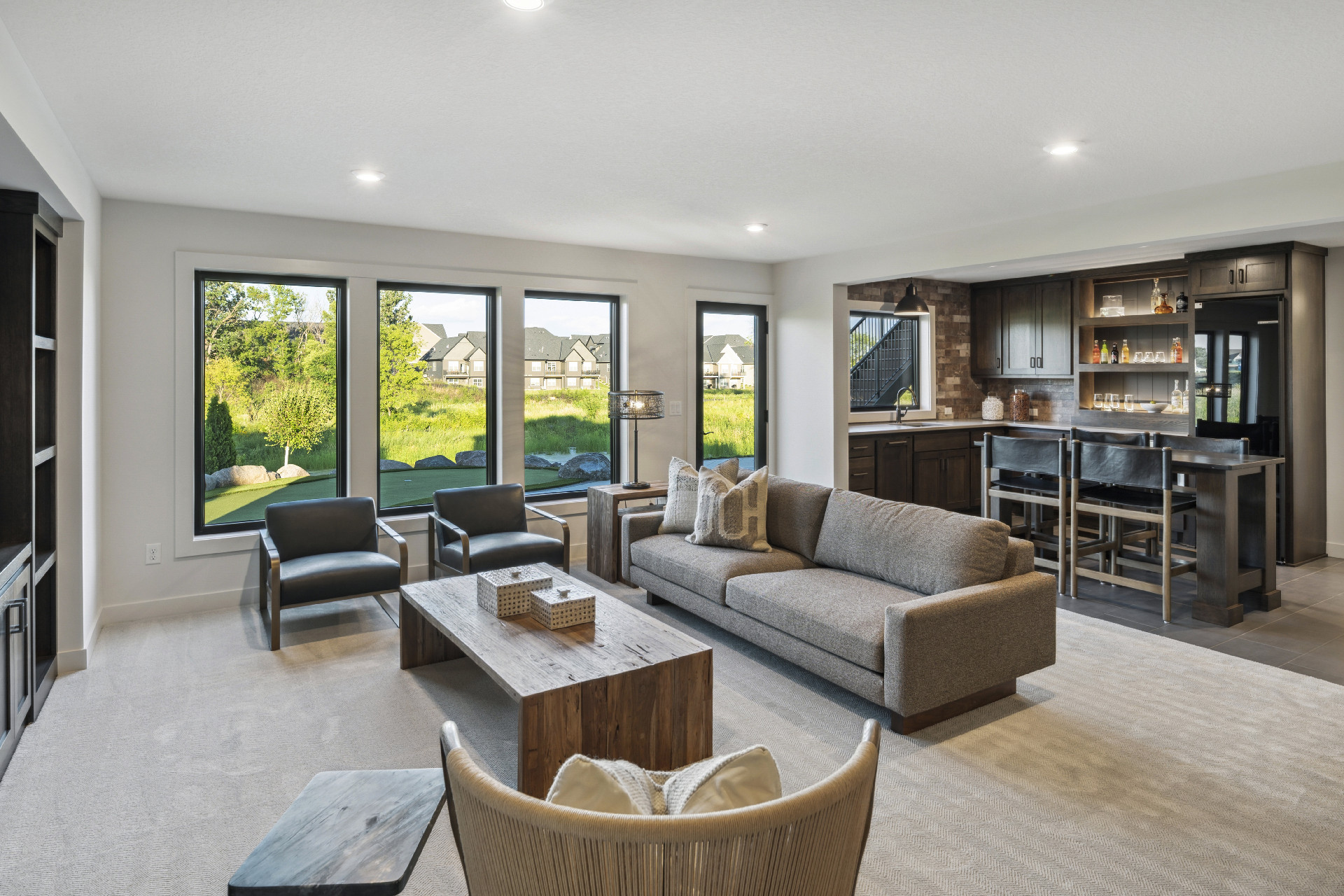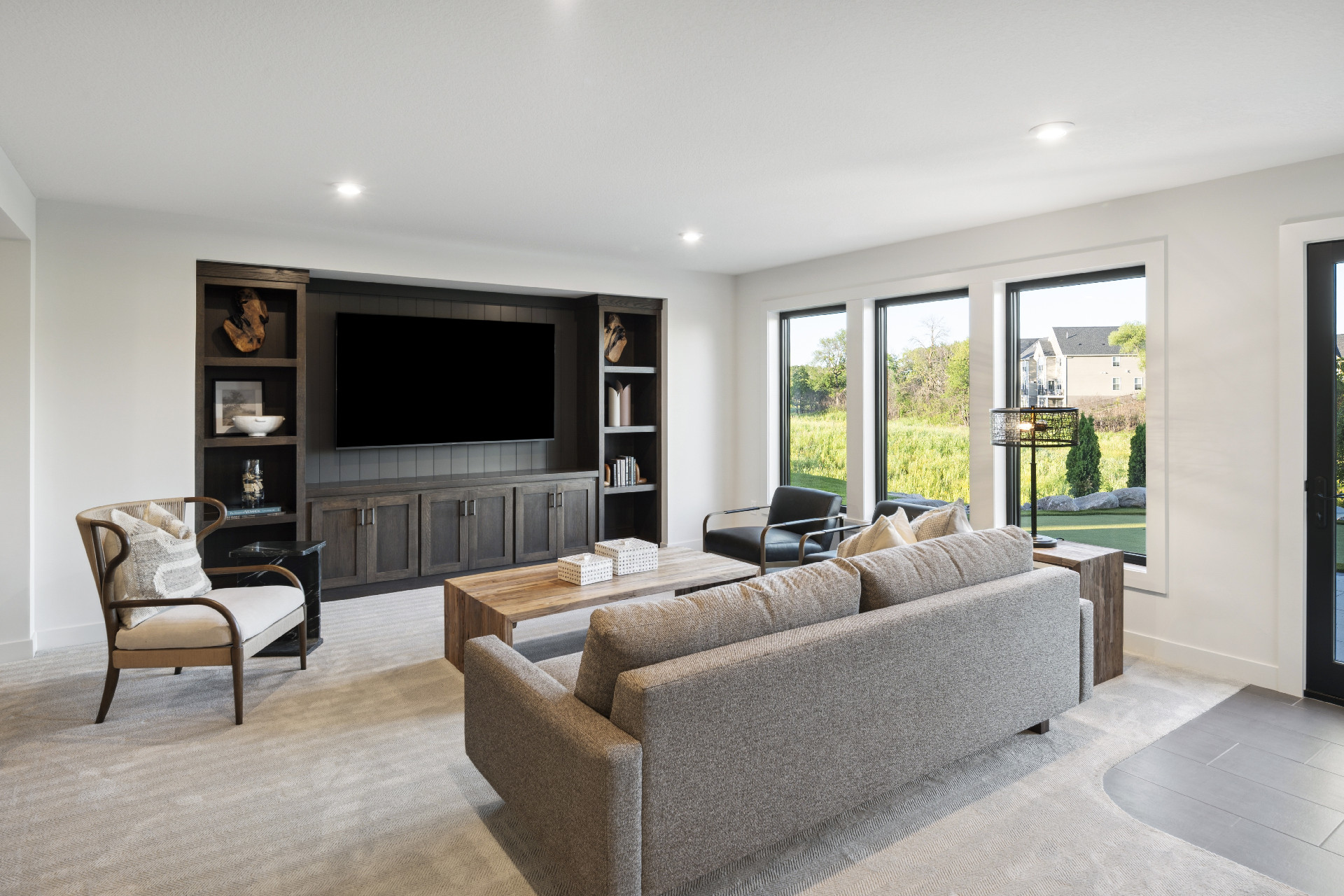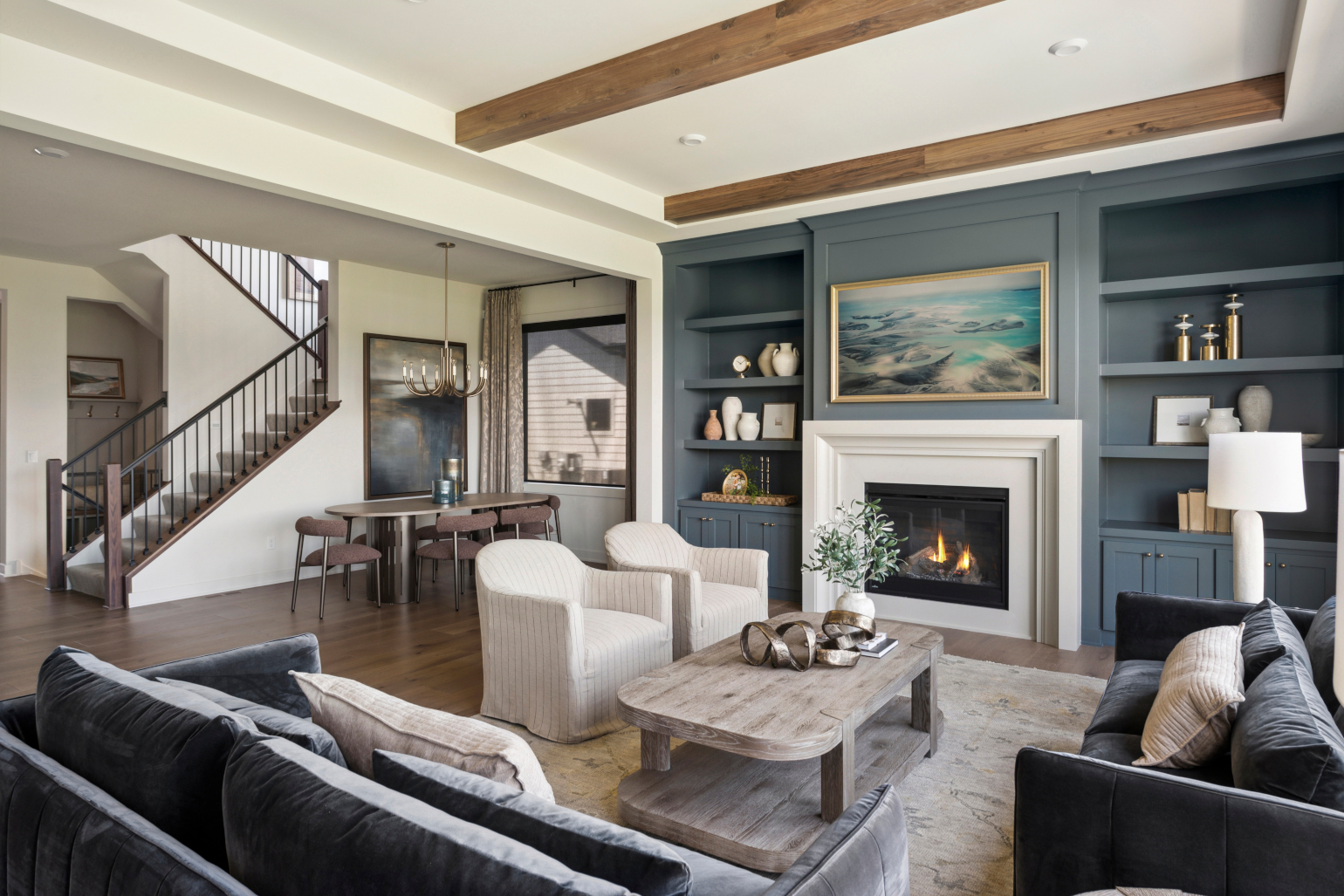 - Great Room features a modern fireplace design with custom-built white oak cabinetry and shelves.