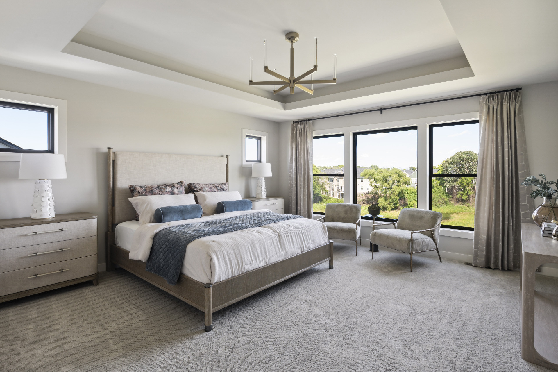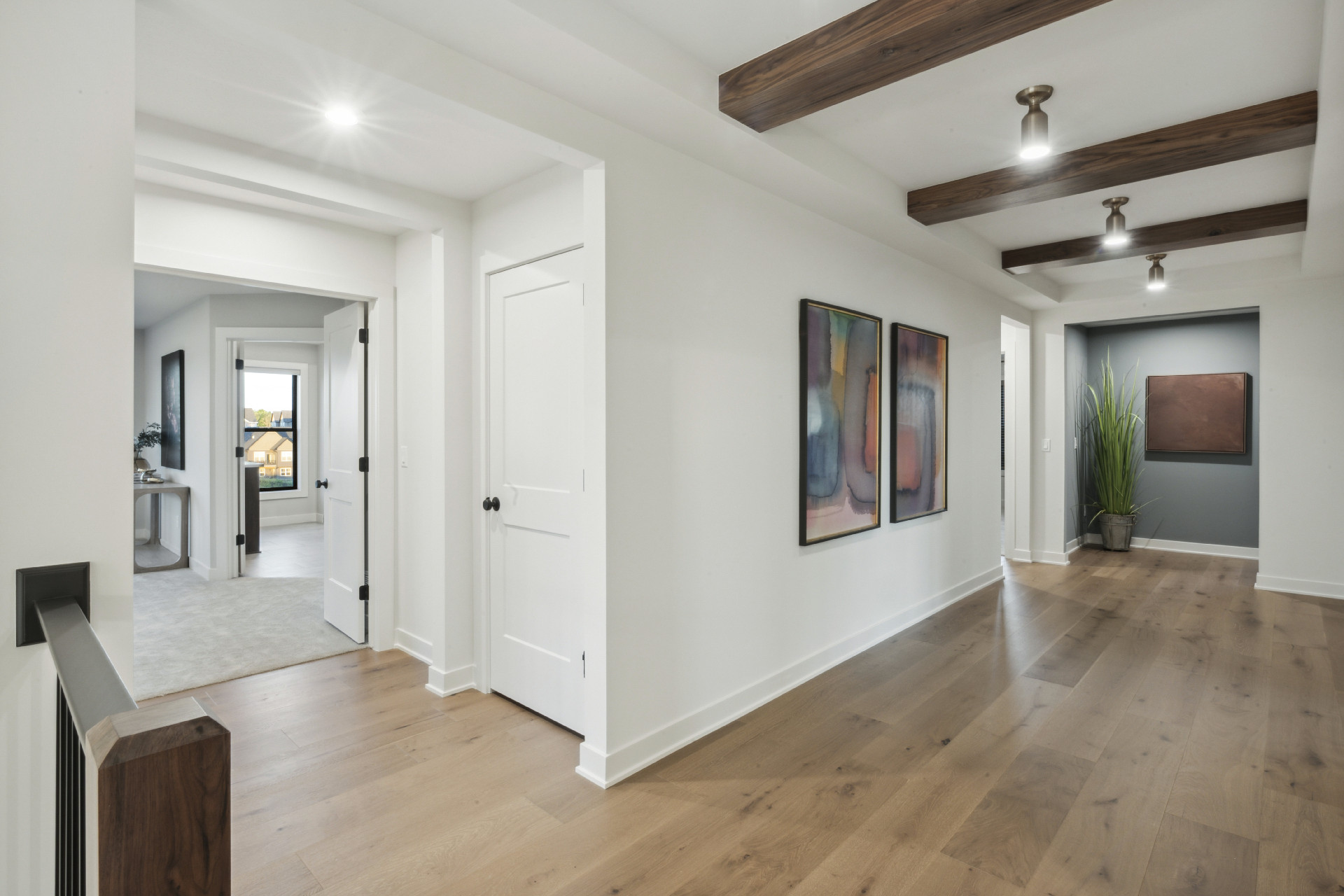 - Bright & airy Owners Suite features double entry doors, optional raised ceiling detail with white oak beams and double doors leading into Bathroom.