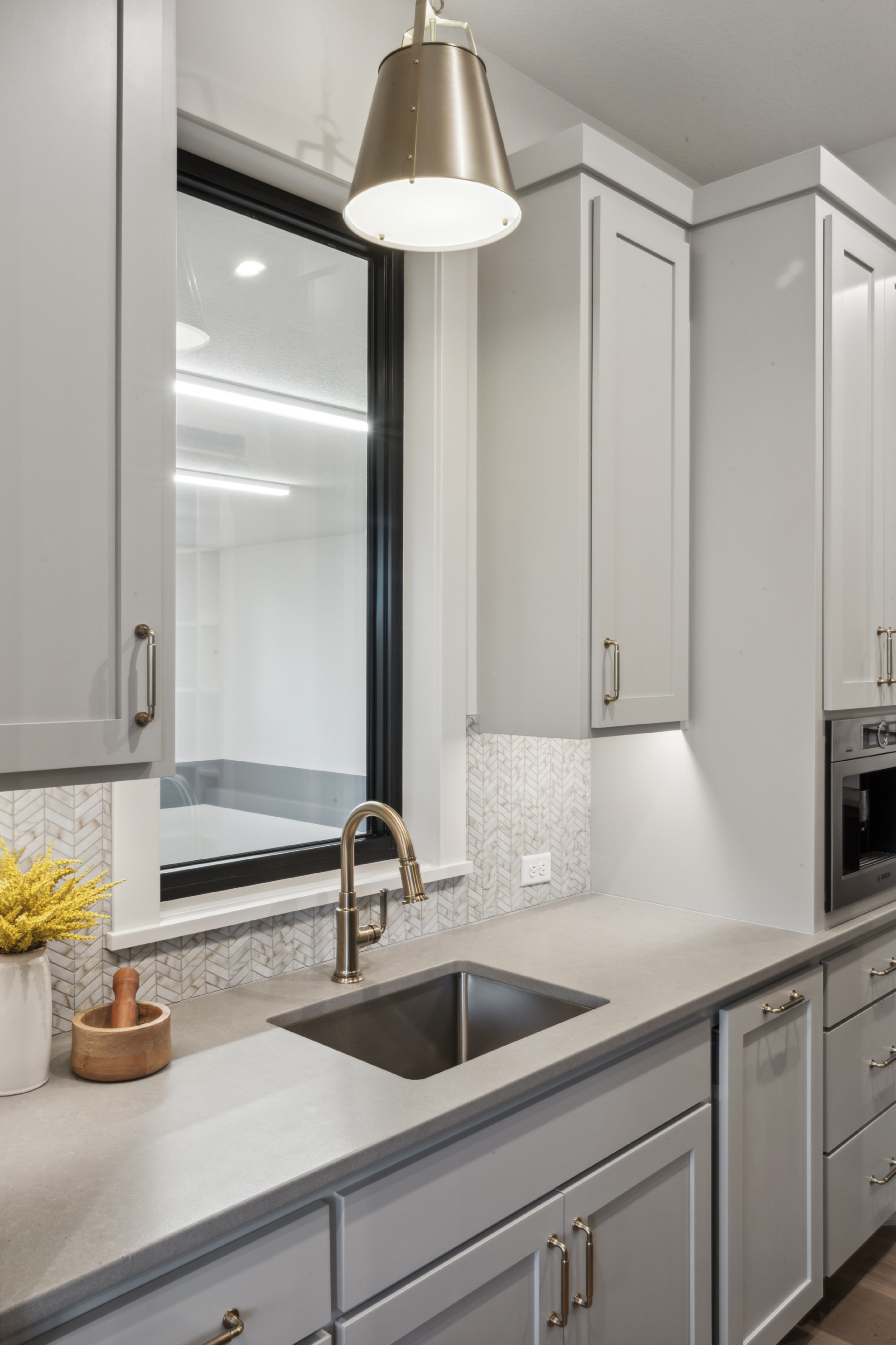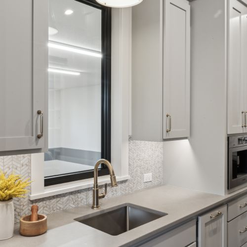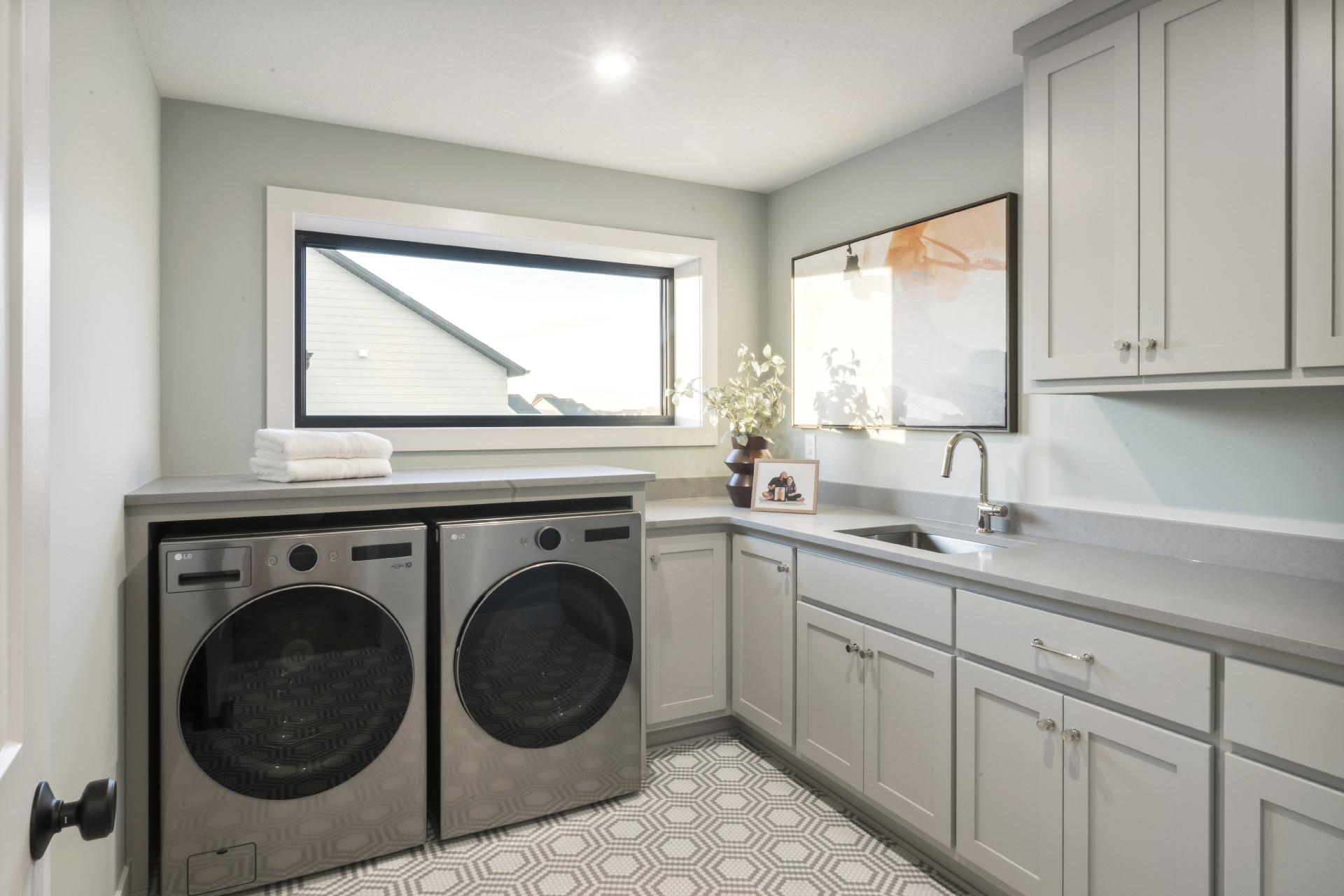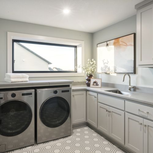 - A spacious Laundry Room with a generous folding counter, abundant cabinets for storage and a large, oversized window to pour in natural light.