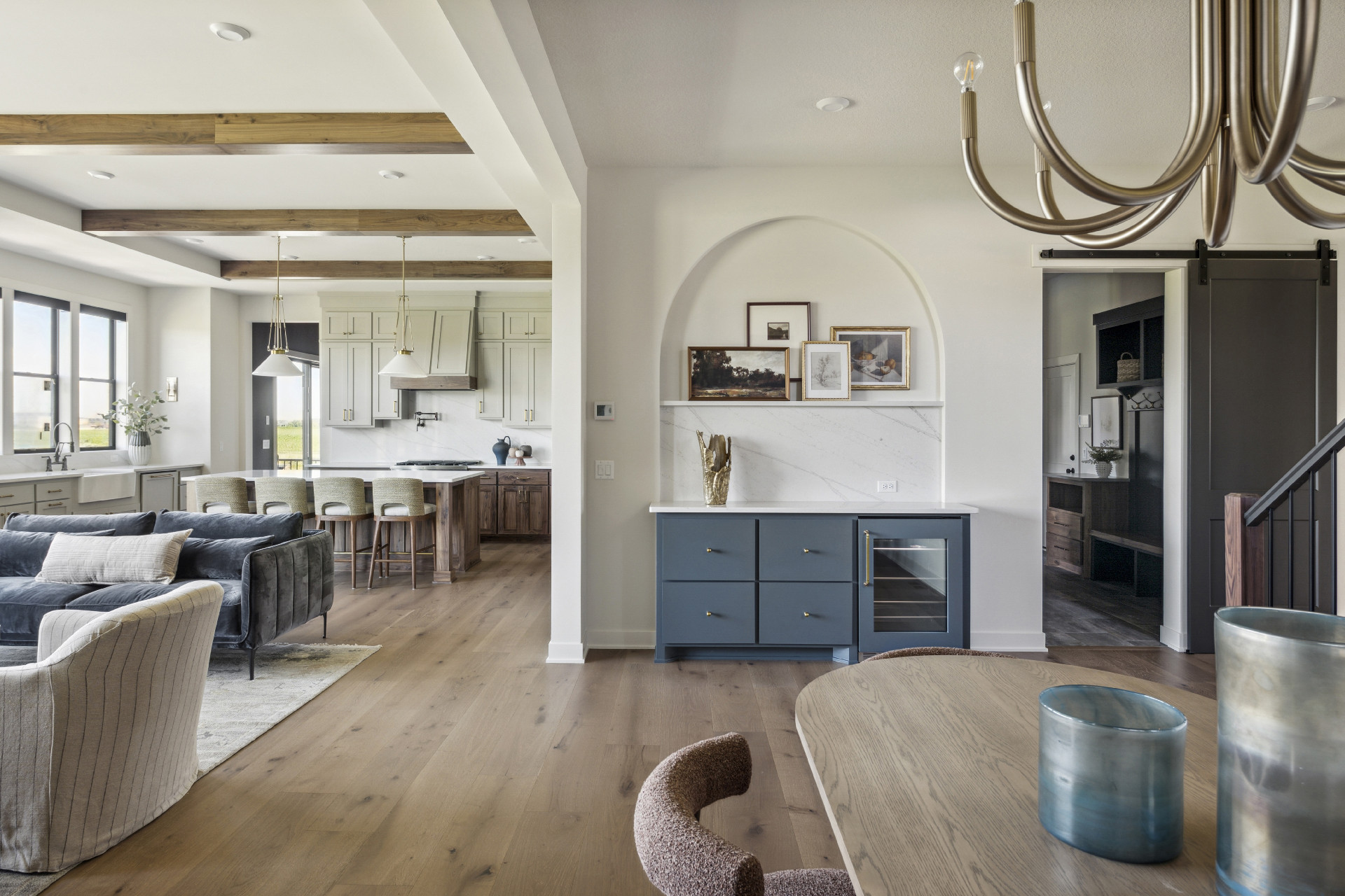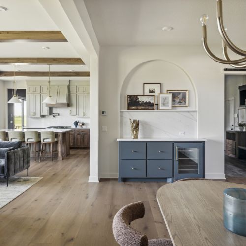 - Dramatic 10-foot ceilings throughout the Main Level featuring white oak wood ceiling beams flowing seamlessly through the Great Room and Kitchen.