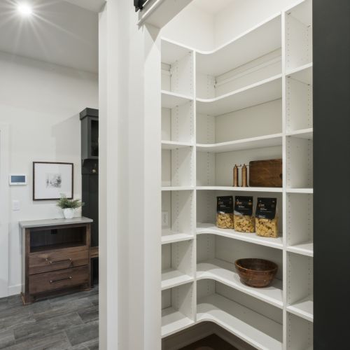 - Walk-through Prep Kitchen with a spacious walk in Pantry between Kitchen and Mudroom for handy grocery unloading and hiding everyday appliances.