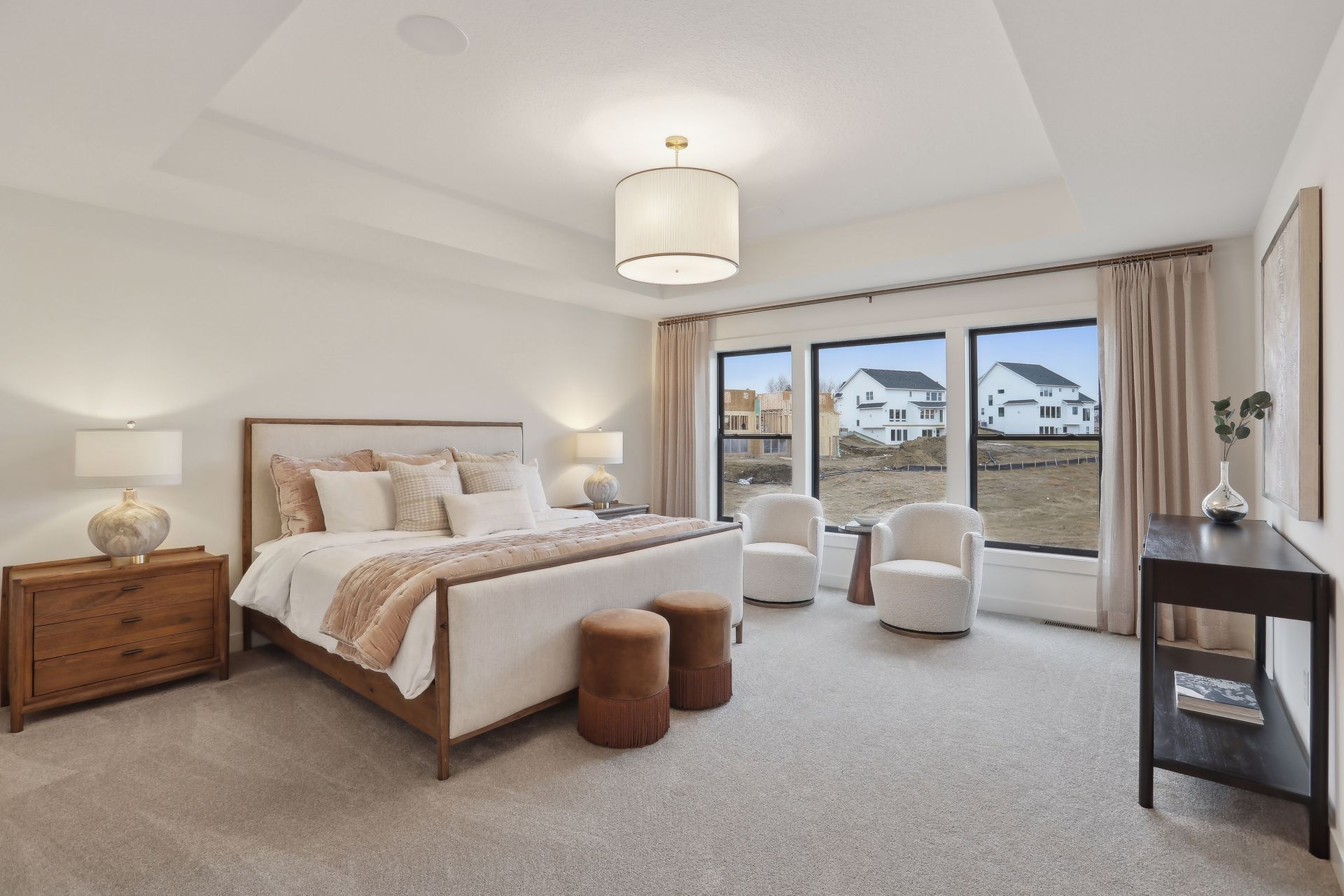 - Owner's Suite boasts double entry doors, a dramatic raised ceiling and bank of 3 large windows for abundant natural daylight, creating a bright and airy retreat.