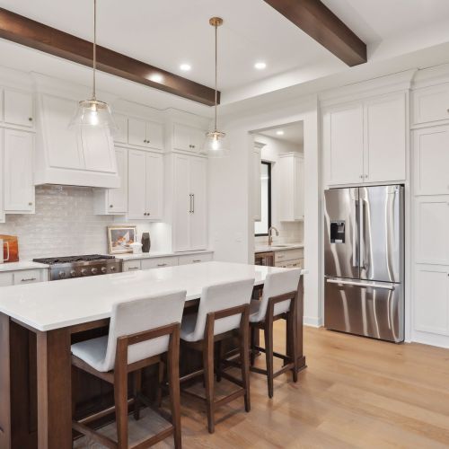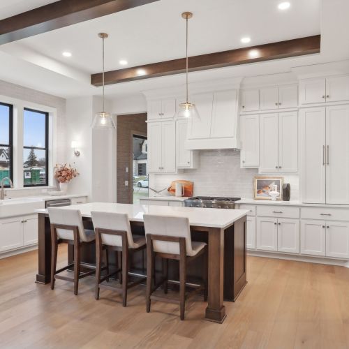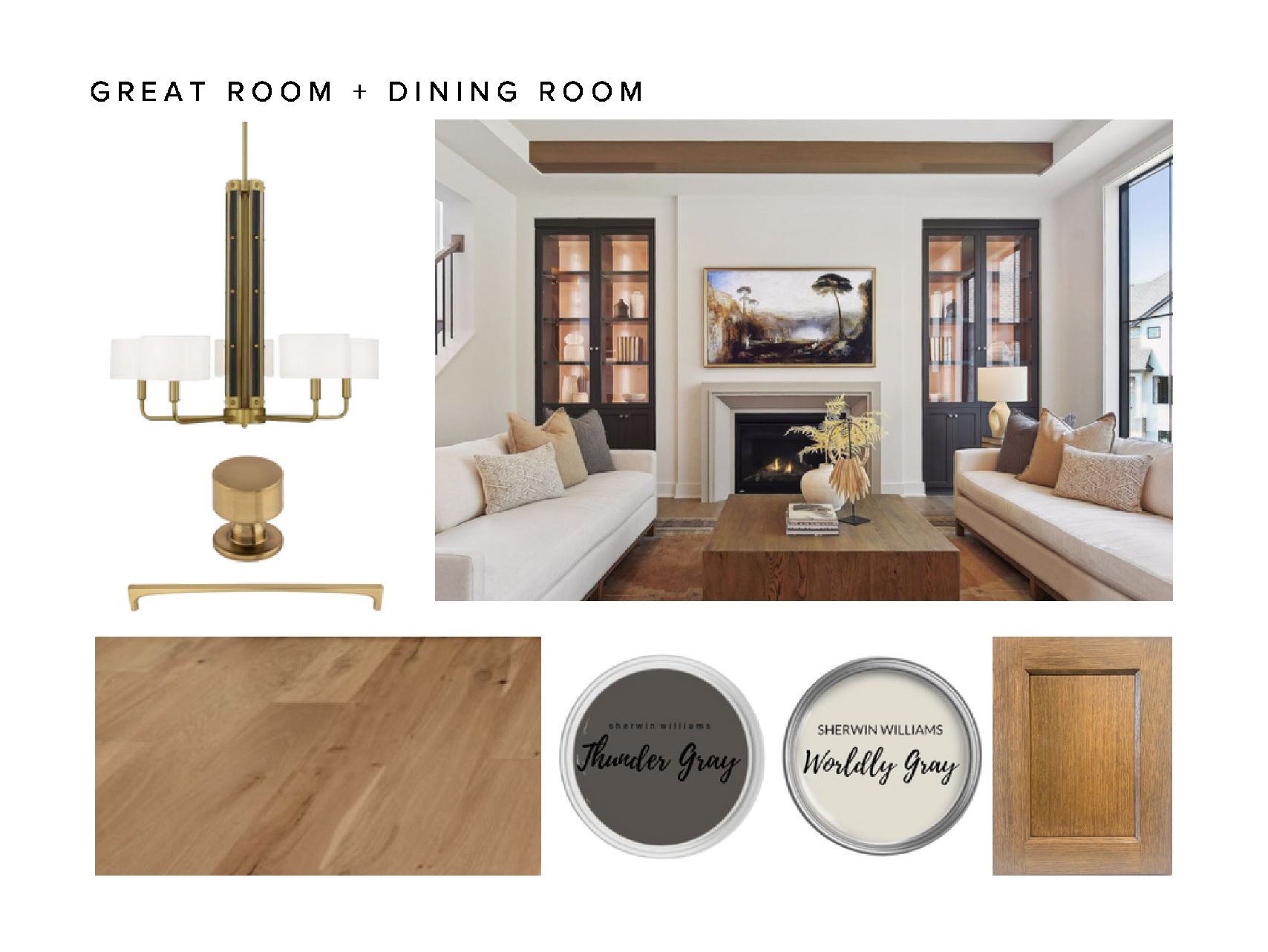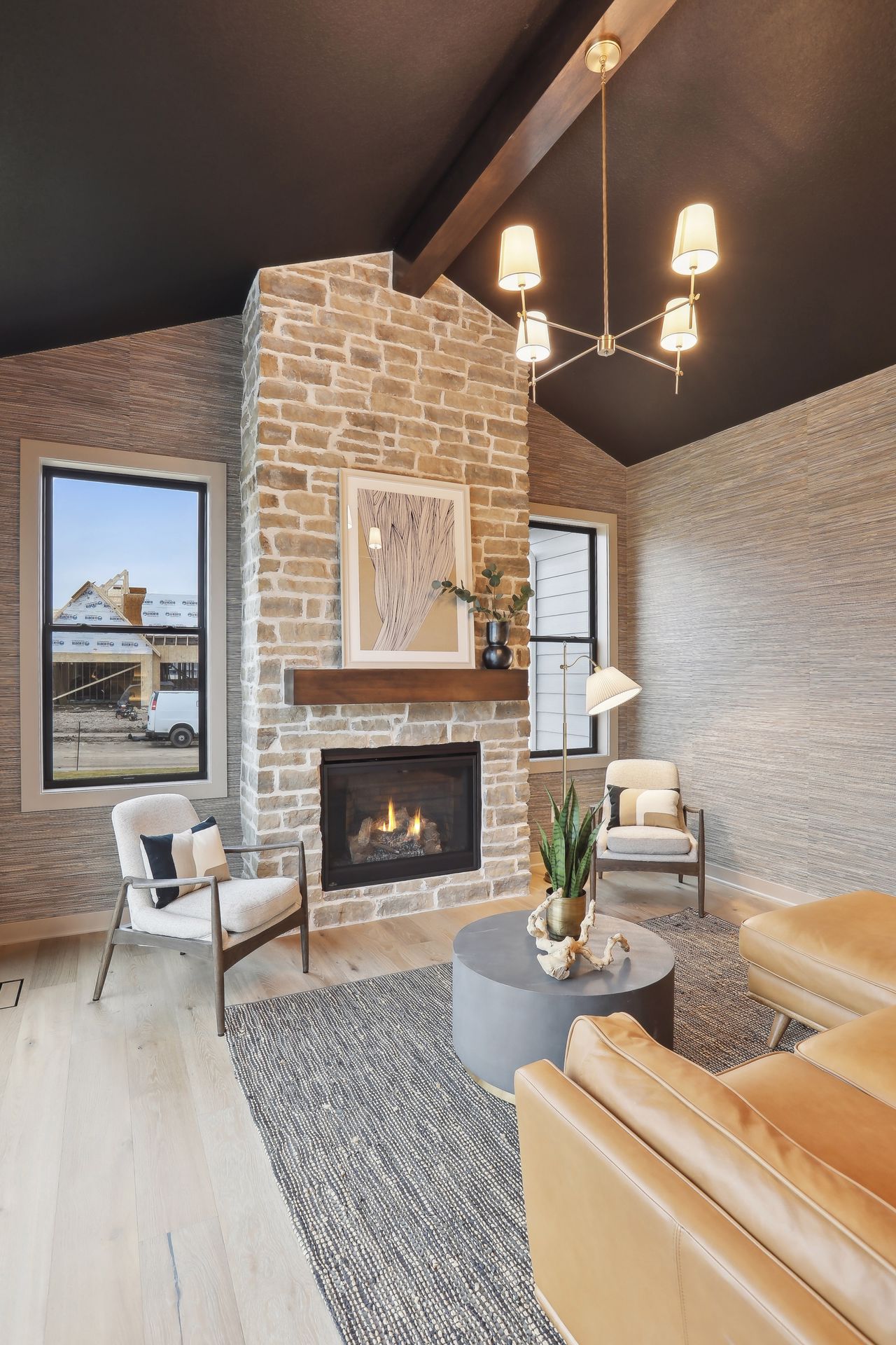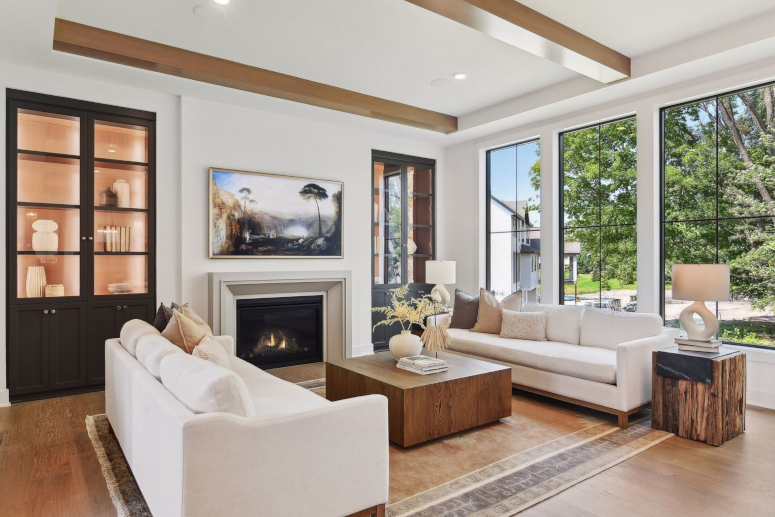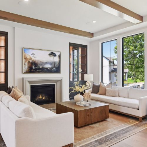 - Great Room features a modern fireplace with custom built in cabinetry and warm wood ceiling beams continuing into the Dinette & Kitchen