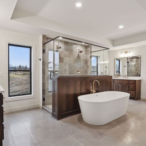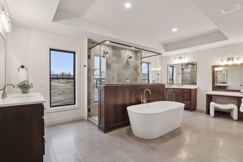 - Owners Bath features separate vanities with built in linen cabinets and make-up vanity, a free-standing soaking tub in front of an all-glass dual shower and a spacious walk-in closet.