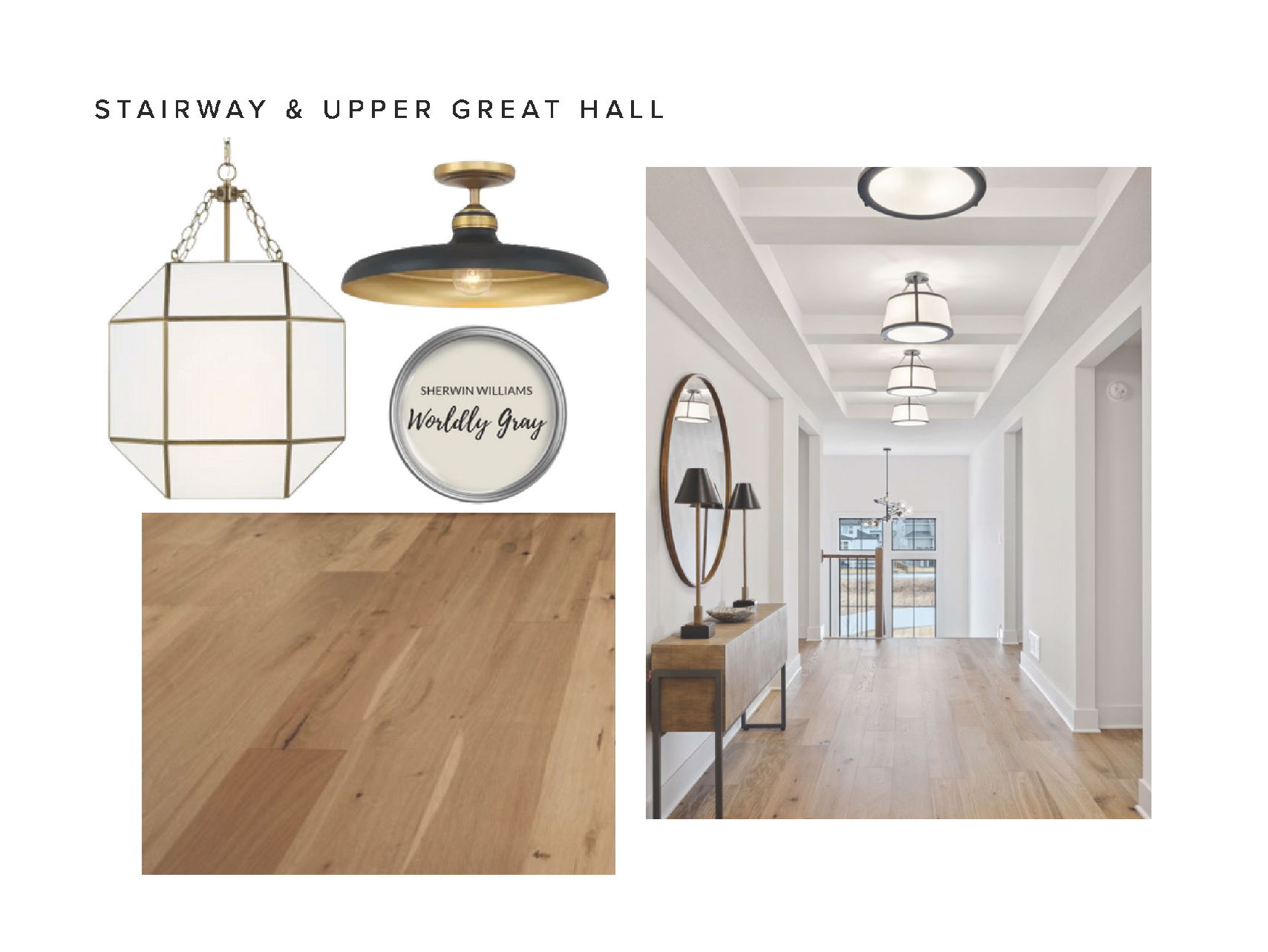- Spacious Great Hall with wood flooring, raised ceiling with decorative beams and lighting.