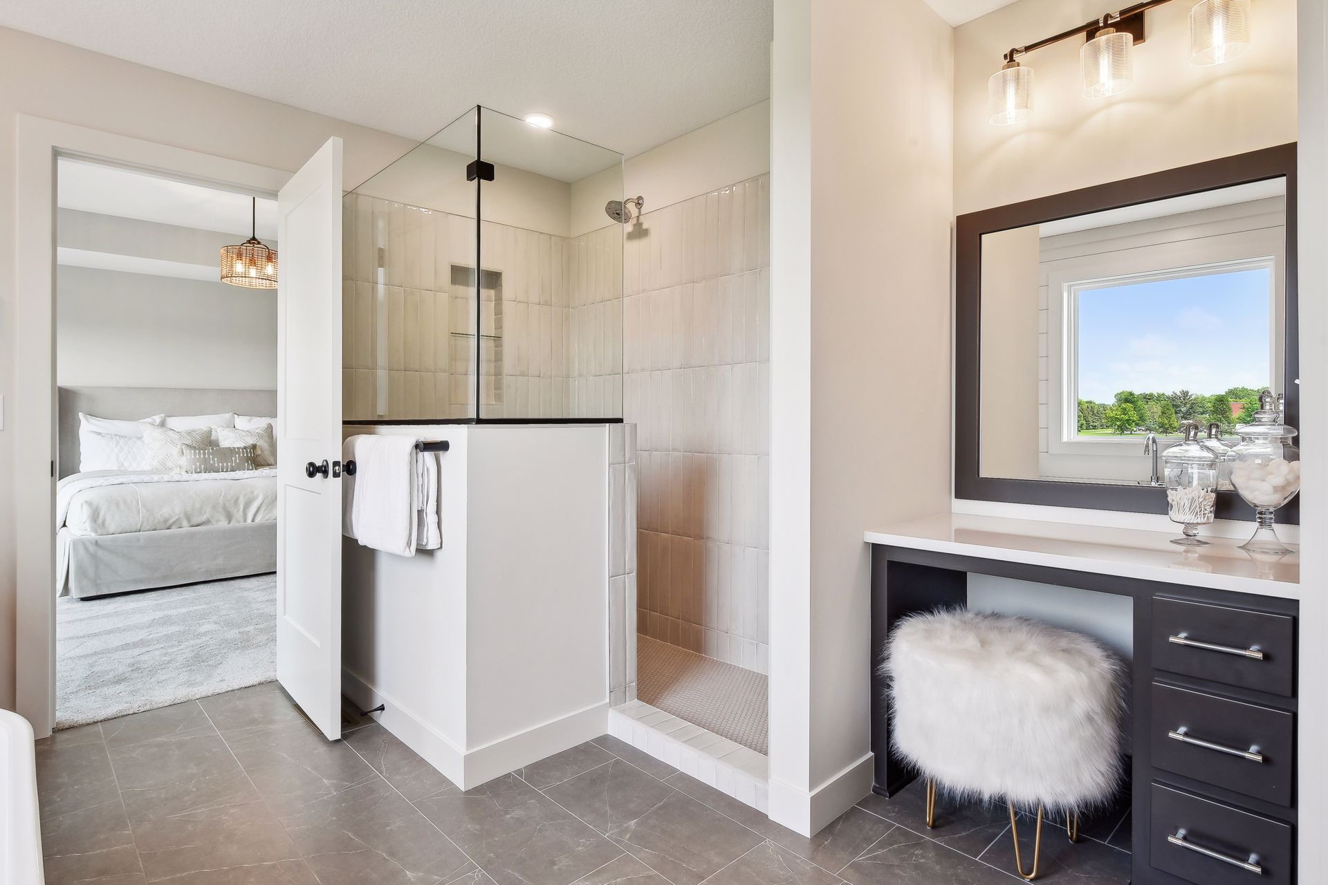 - Two bedrooms share a Jack & Jill bath with a private shower/toilet room, while a suite bedroom enjoys a private bath and walk-in closet.