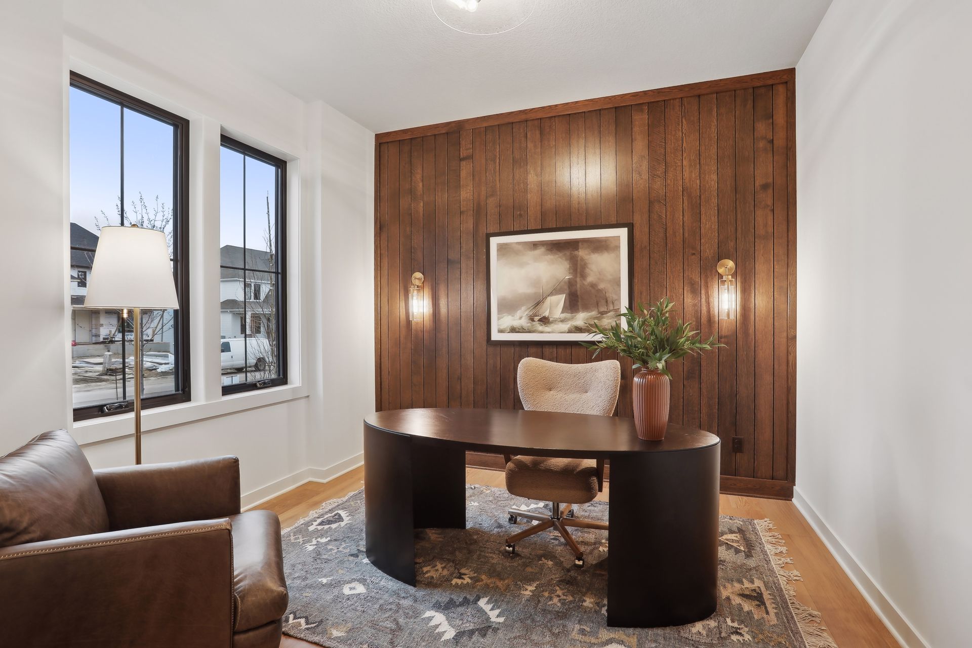 - Study/Home Office with modern full view glass doors conveniently located right off the front entry, offering the perfect space for work or client meetings.