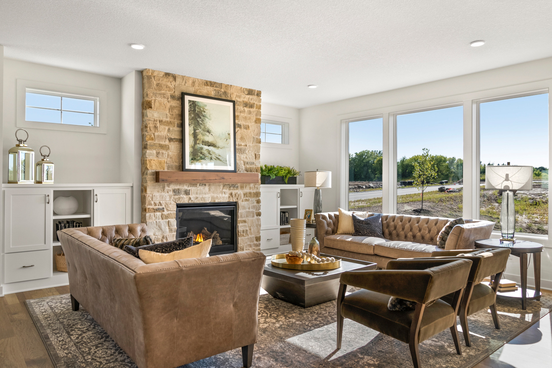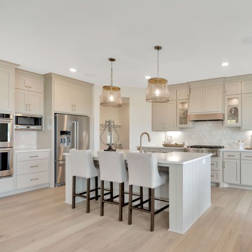 - Central Kitchen that overlooks a spacious Great Room with stone fireplace & custom built in cabinetry, perfect for entertaining and everyday living.