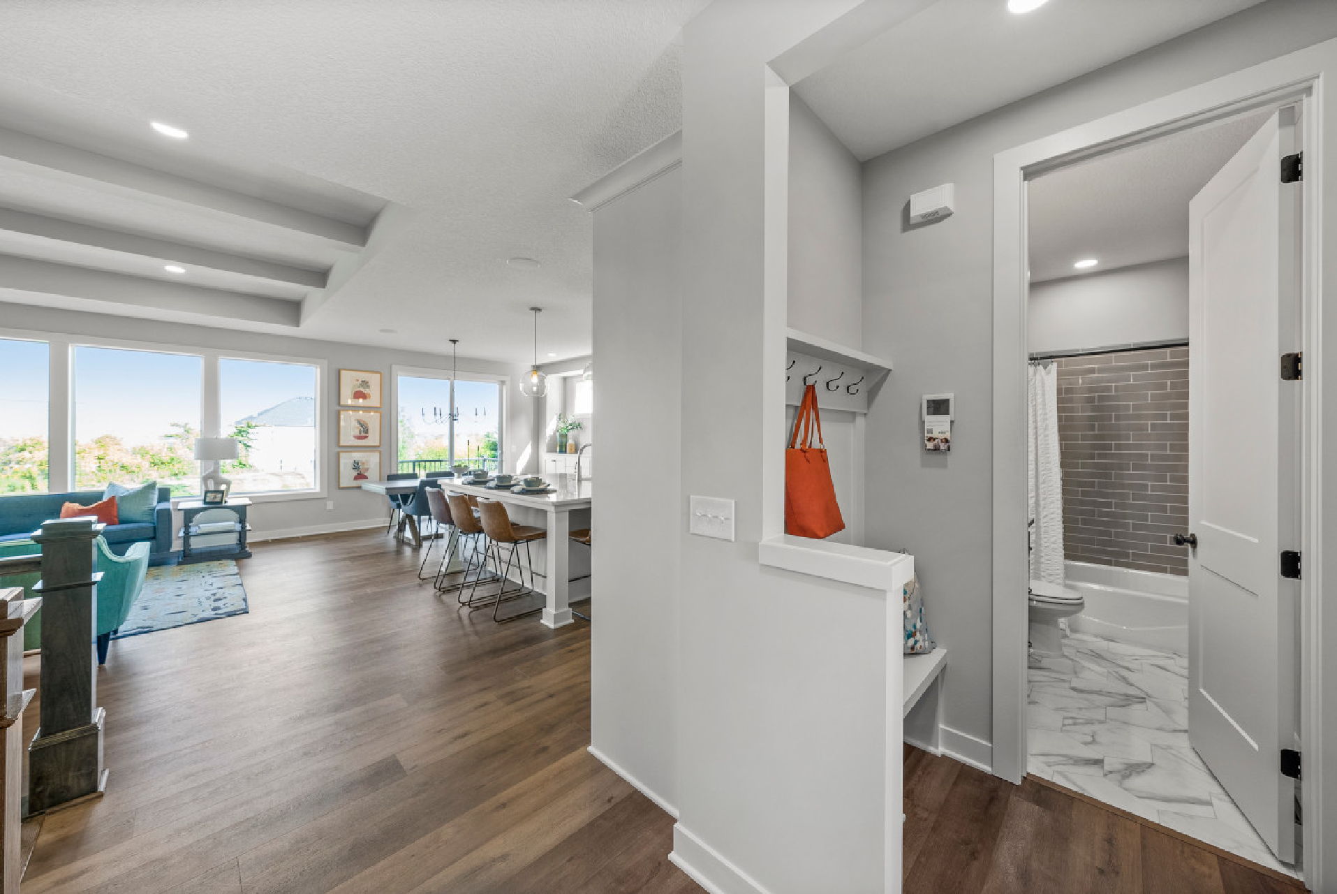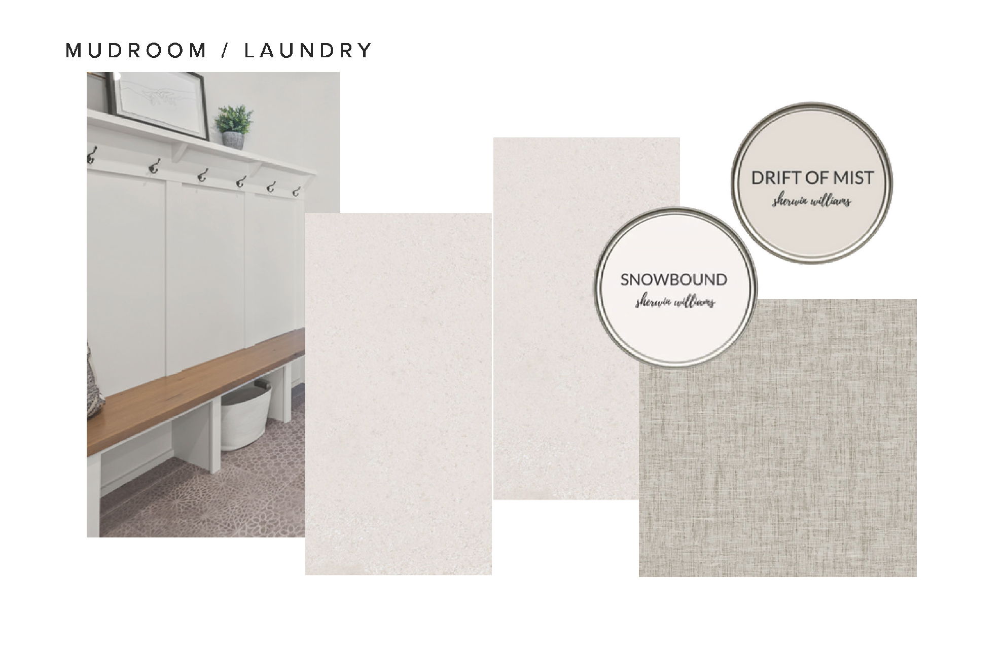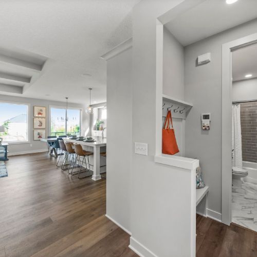 - The Mudroom & Laundry Room is designed as a dual-purpose space featuring a functional laminate countertop over the washer and dryer, locker bench for everyday organization, and a sliding barn door for stylish separation.