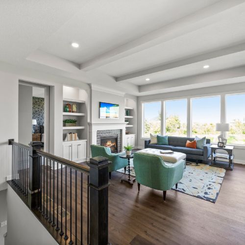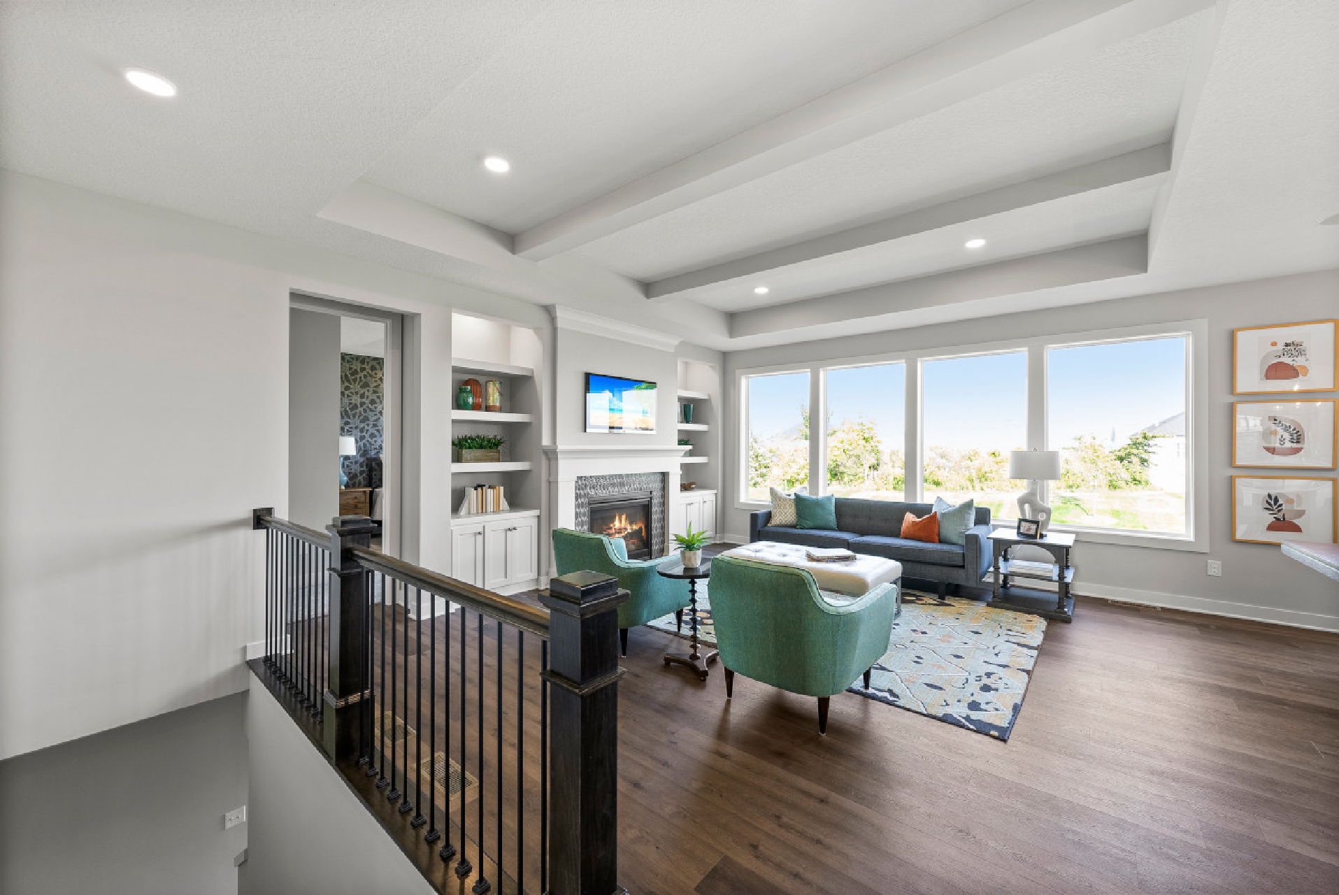 - A bright and inviting Great Room featuring an abundance of natural light, a striking floor-to-ceiling stone fireplace flanked by built-in cabinetry, and a raised ceiling with decorative drywall beams that add architectural interest.