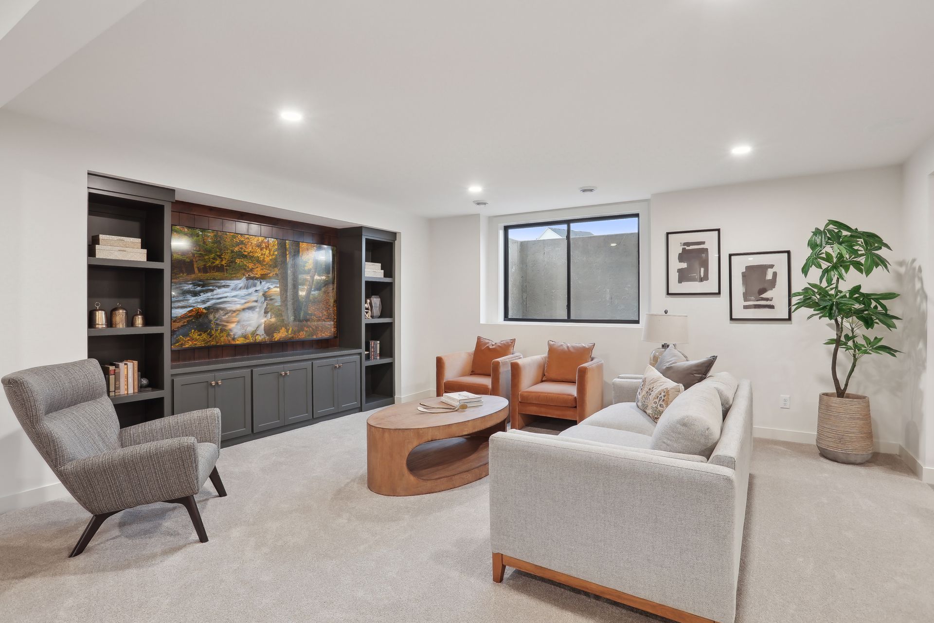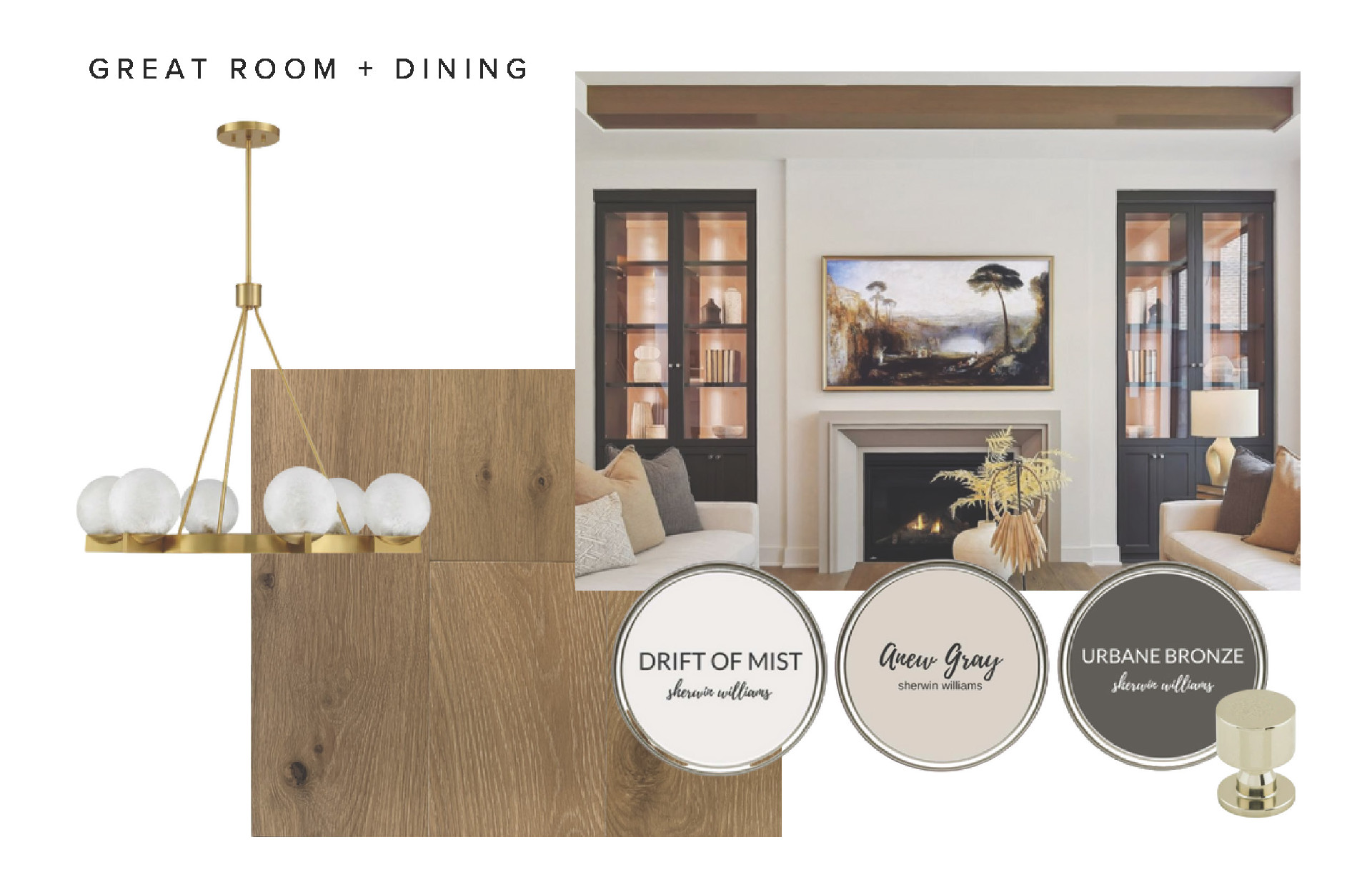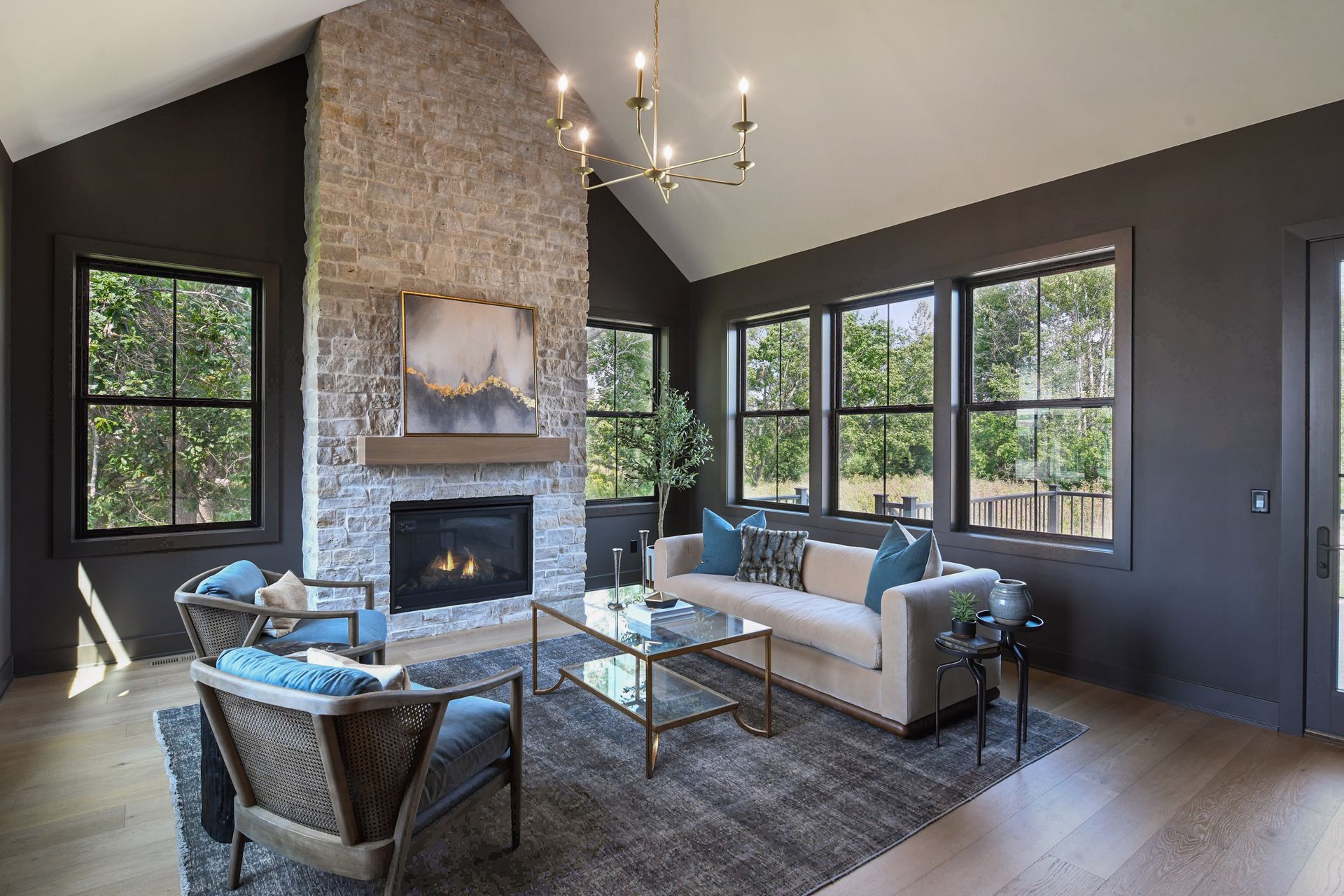 - Great Room features a modern fireplace design with custom-built cabinetry and glass doors.