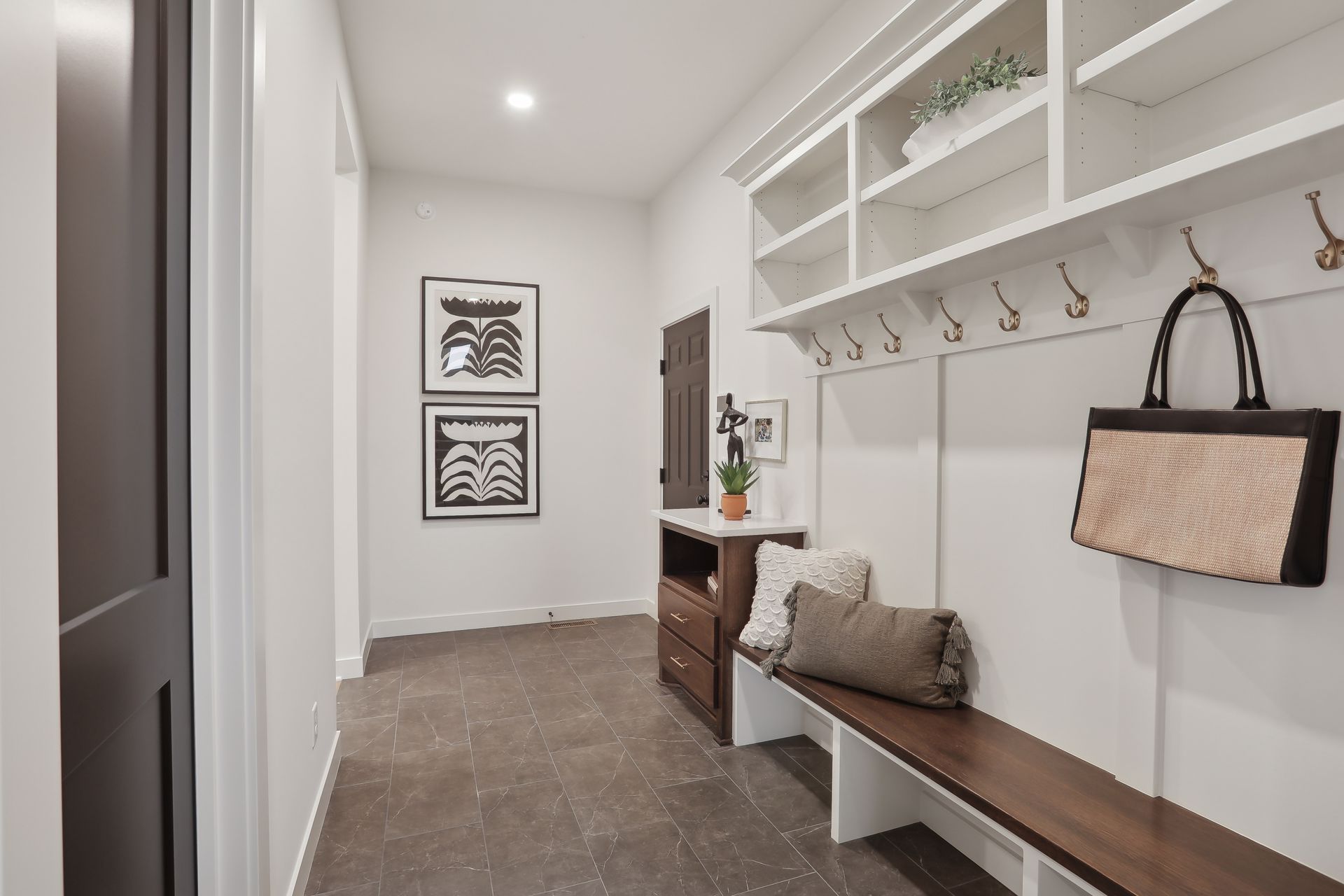 - A welcoming front entry leads to a private Study with optional double doors and a paneled accent wall, a conveniently located private Half Bath, and a functional entry bench for guests.
