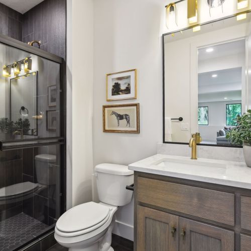 - Two bedrooms share a Jack & Jill Bath with private shower/toilet room between the vanities in each bedroom’s dressing area.