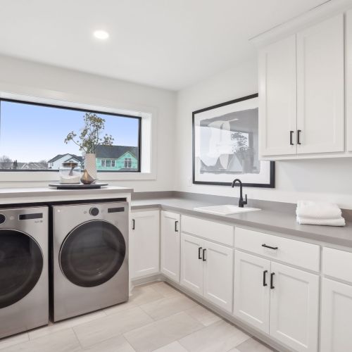 - A spacious Laundry Room with a generous folding counter, abundant cabinets for storage and a large, oversized window to pour in natural light.