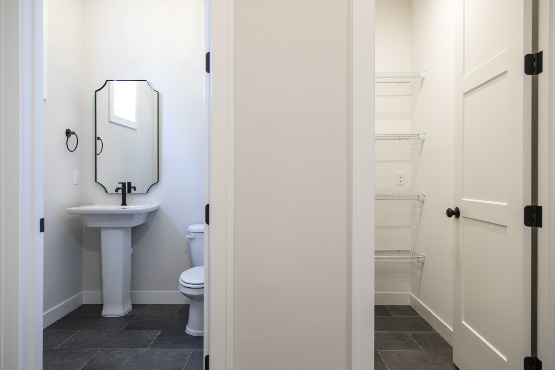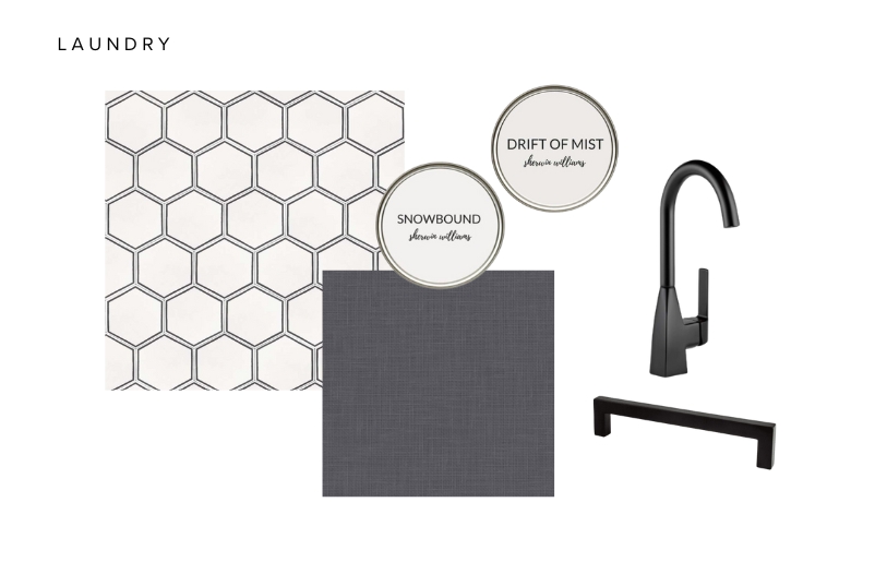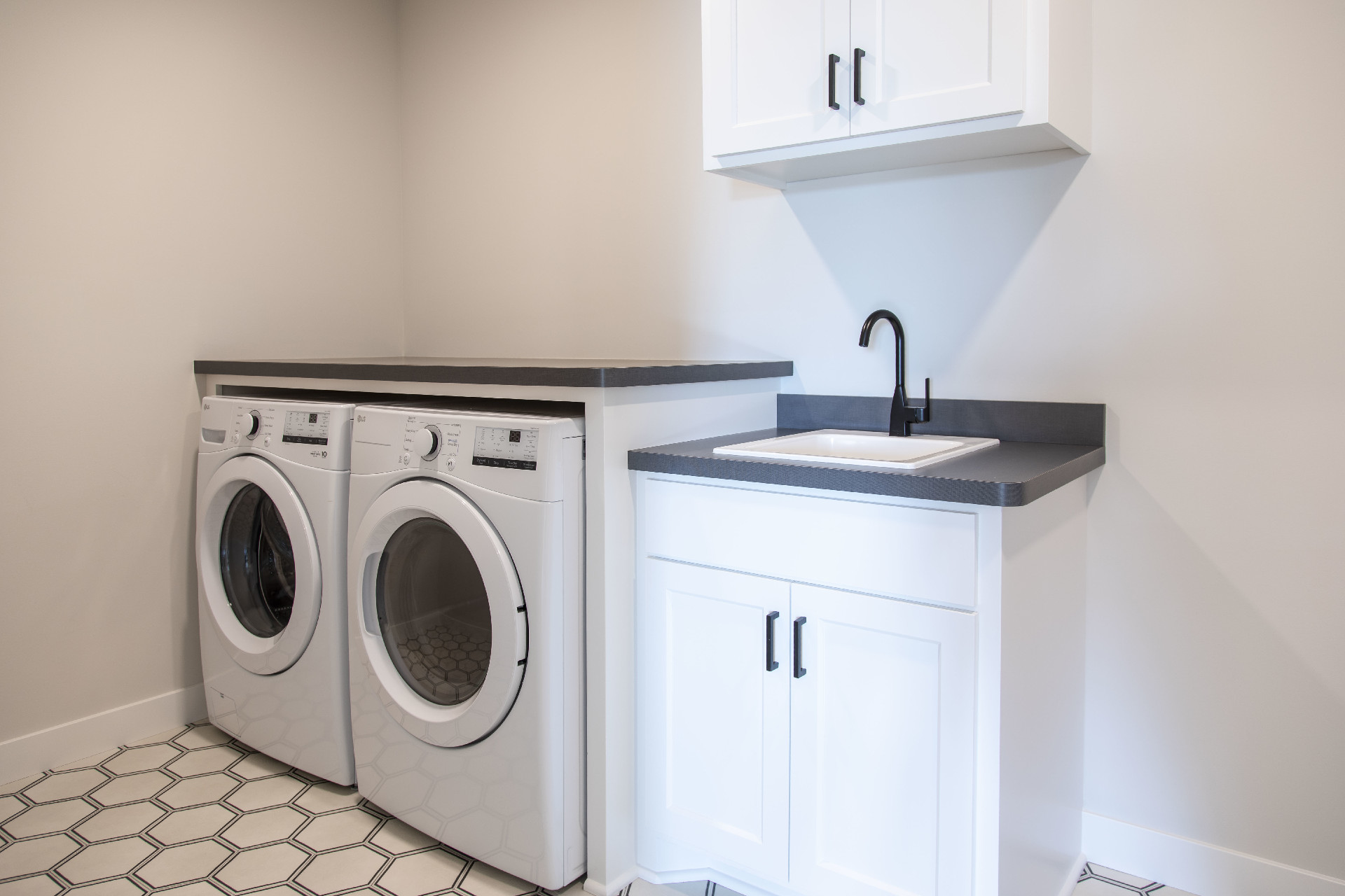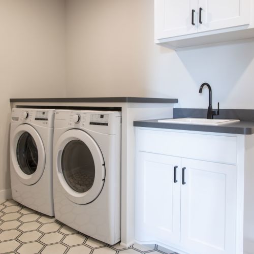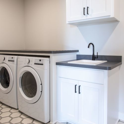 - Walk-through laundry room with sink and cabinets.